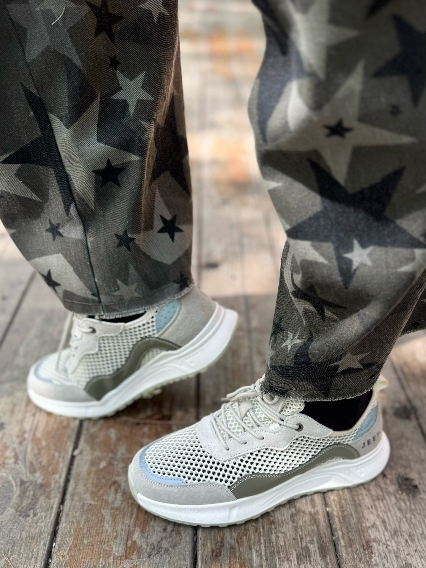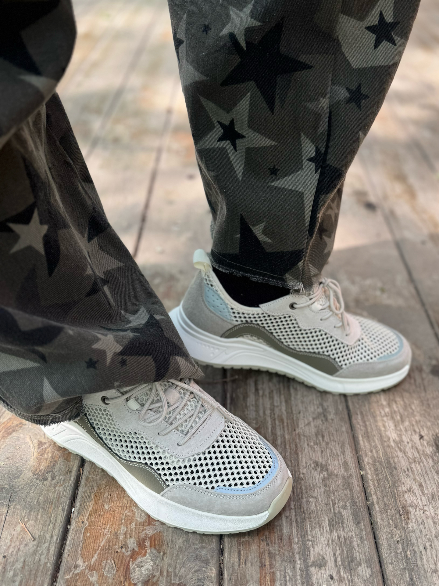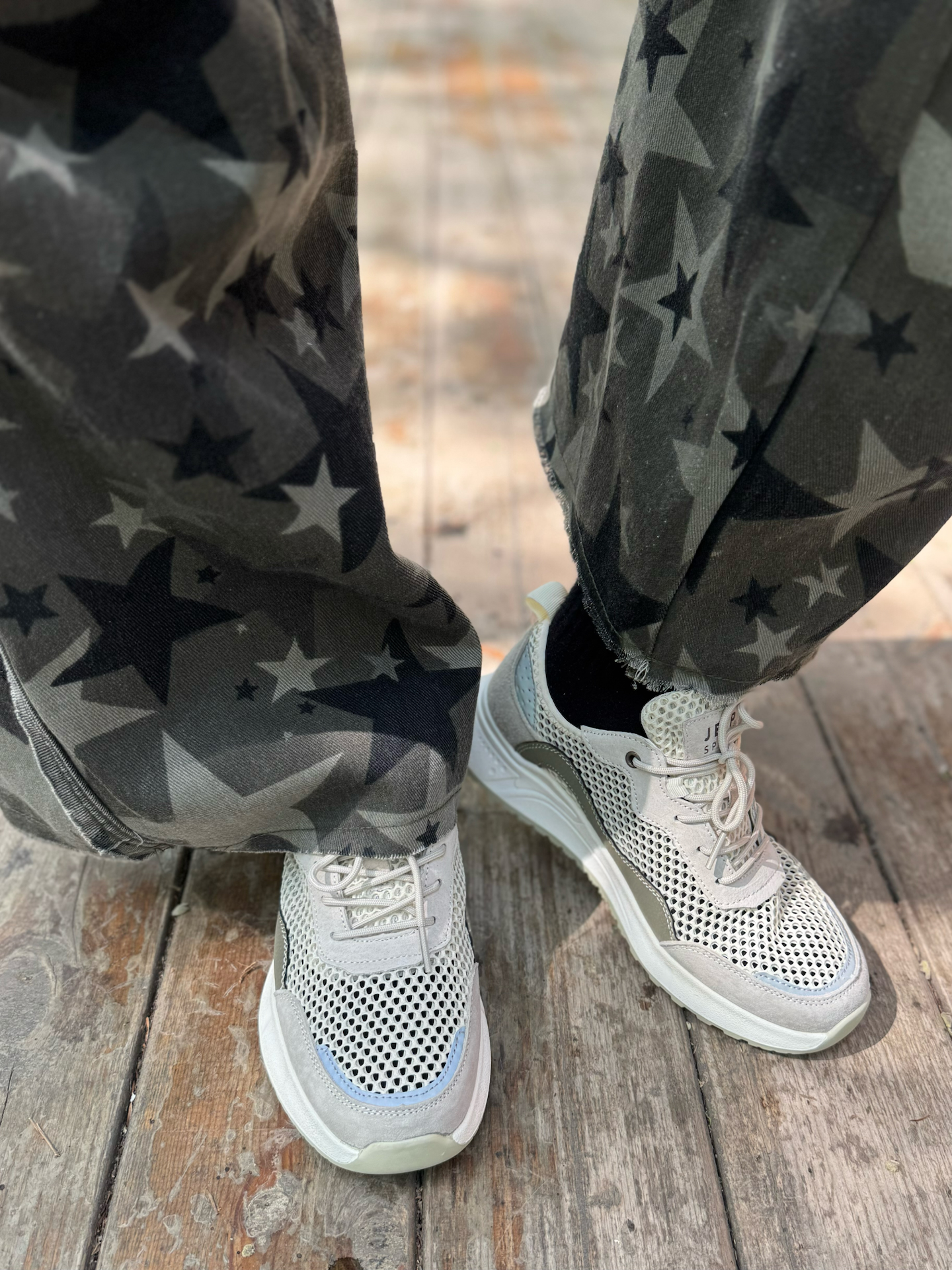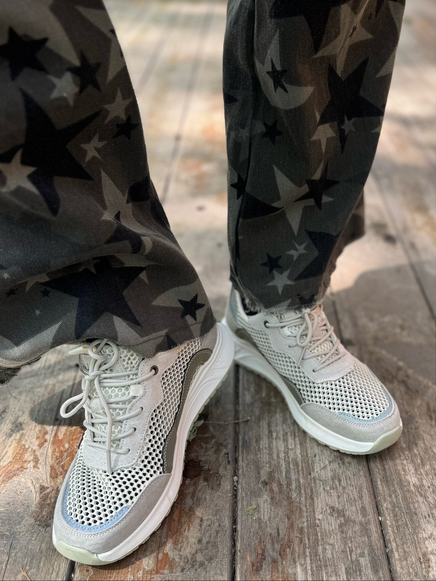 今日穿搭~来自(183 160) 👔上身搭配始祖鸟浅蓝连帽冲锋衣 👖下身搭配星星迷彩阔腿工装裤 👟脚上搭配网面透气厚底休闲鞋 SPIRIT 高个子男生松弛感穿搭 冲锋衣简约利落星星裤氛围感拉满 这双网面鞋是整套亮点 透气不闷脚厚底显高不笨重 和复古裤装完美适配日常穿舒服又出片