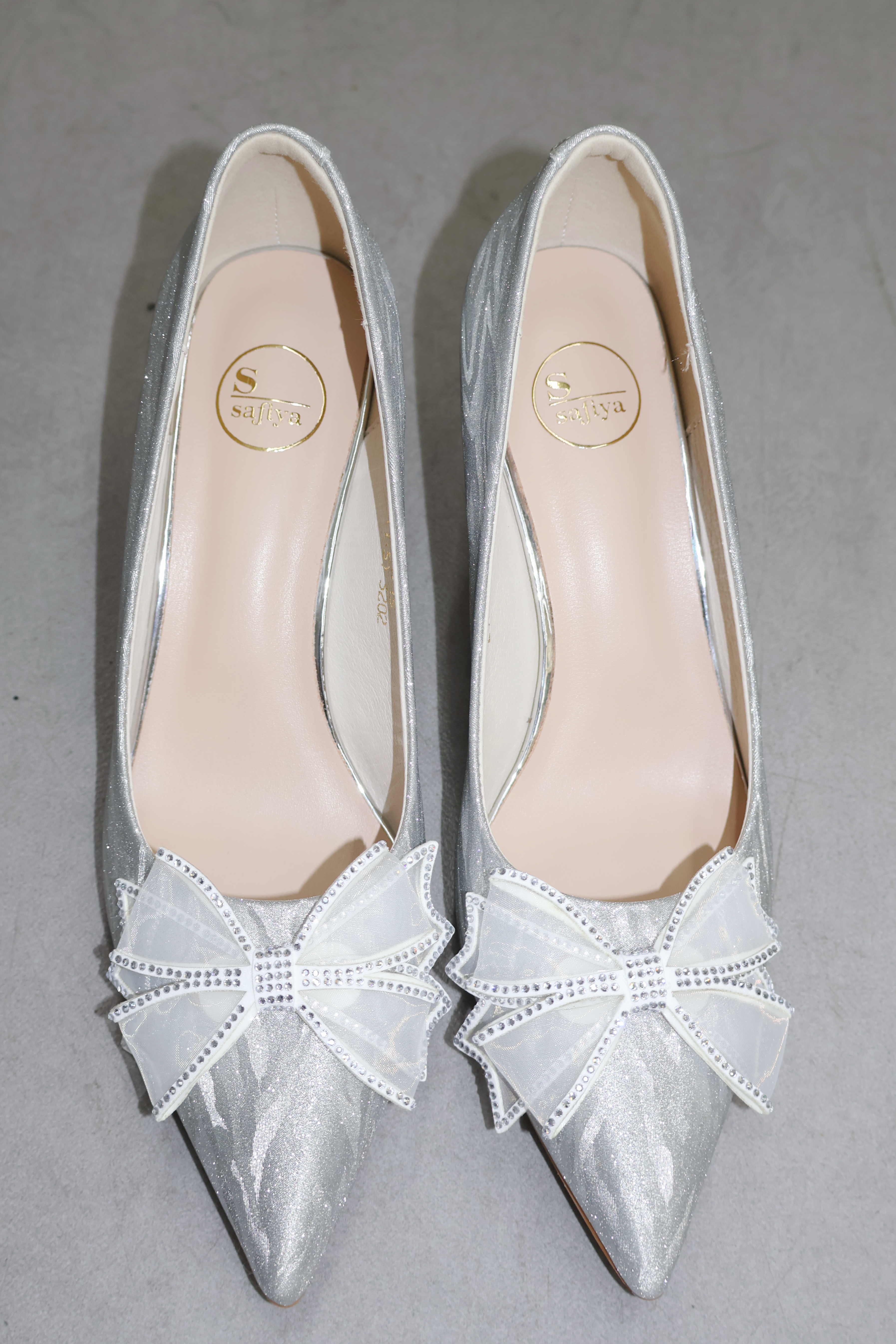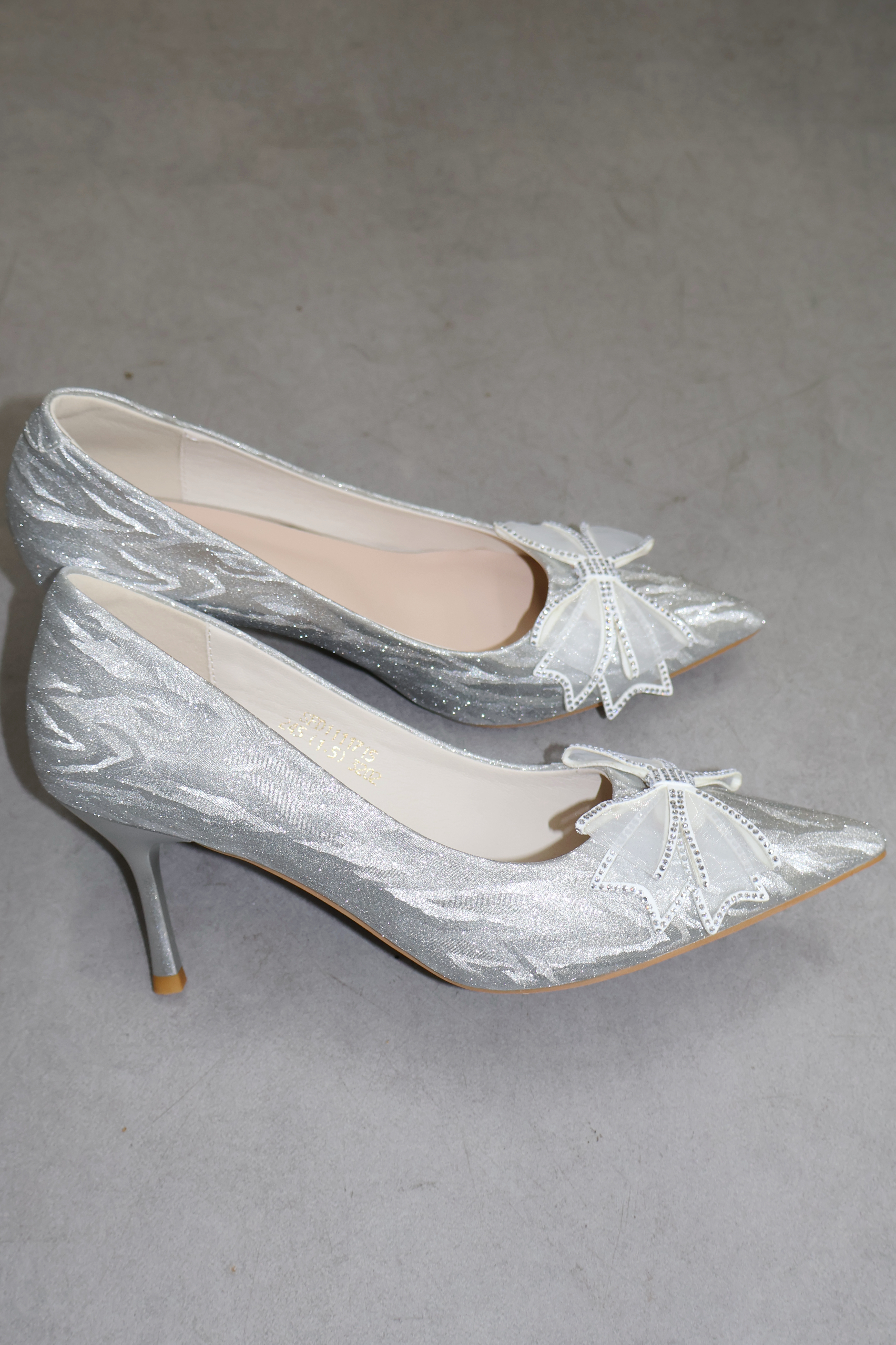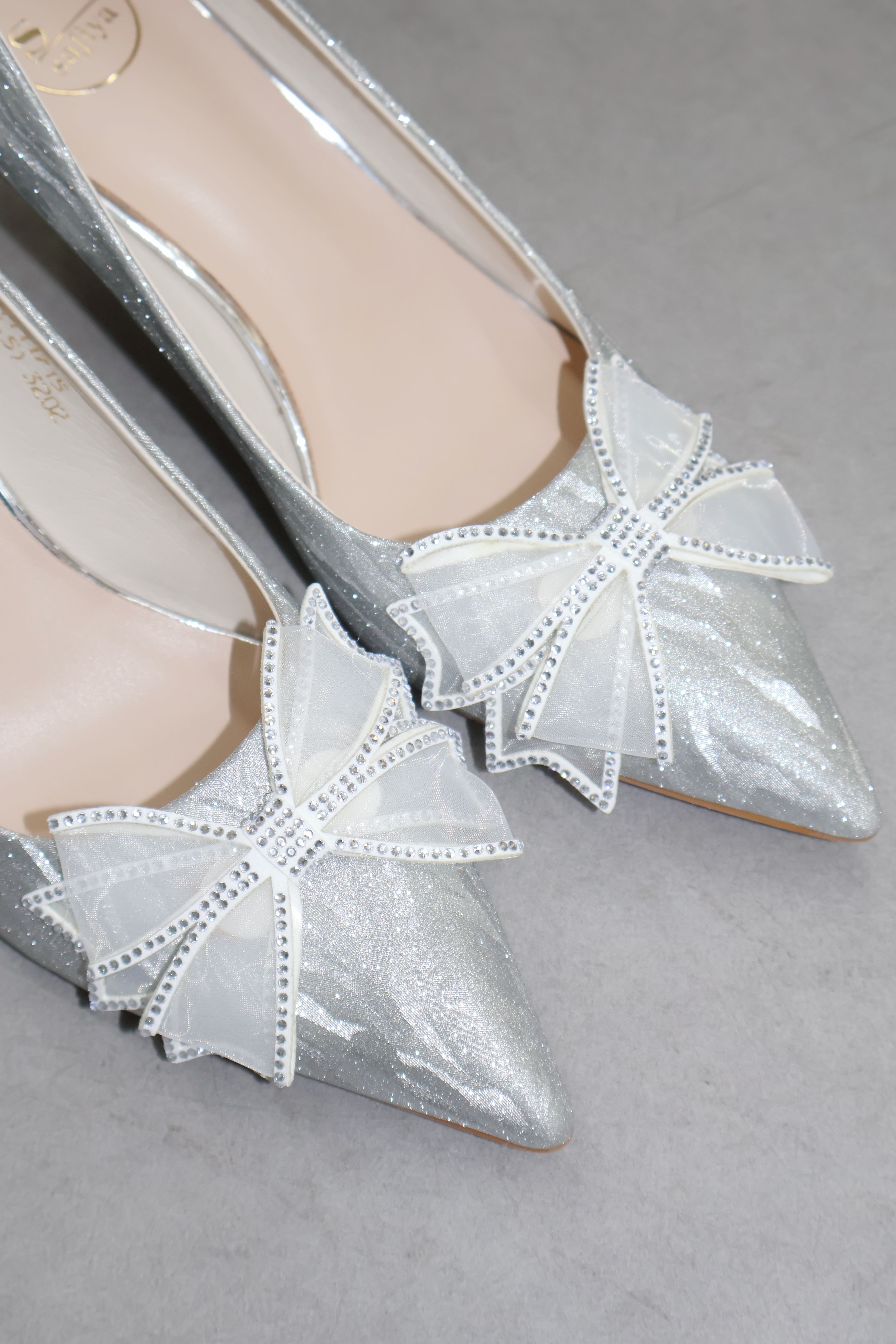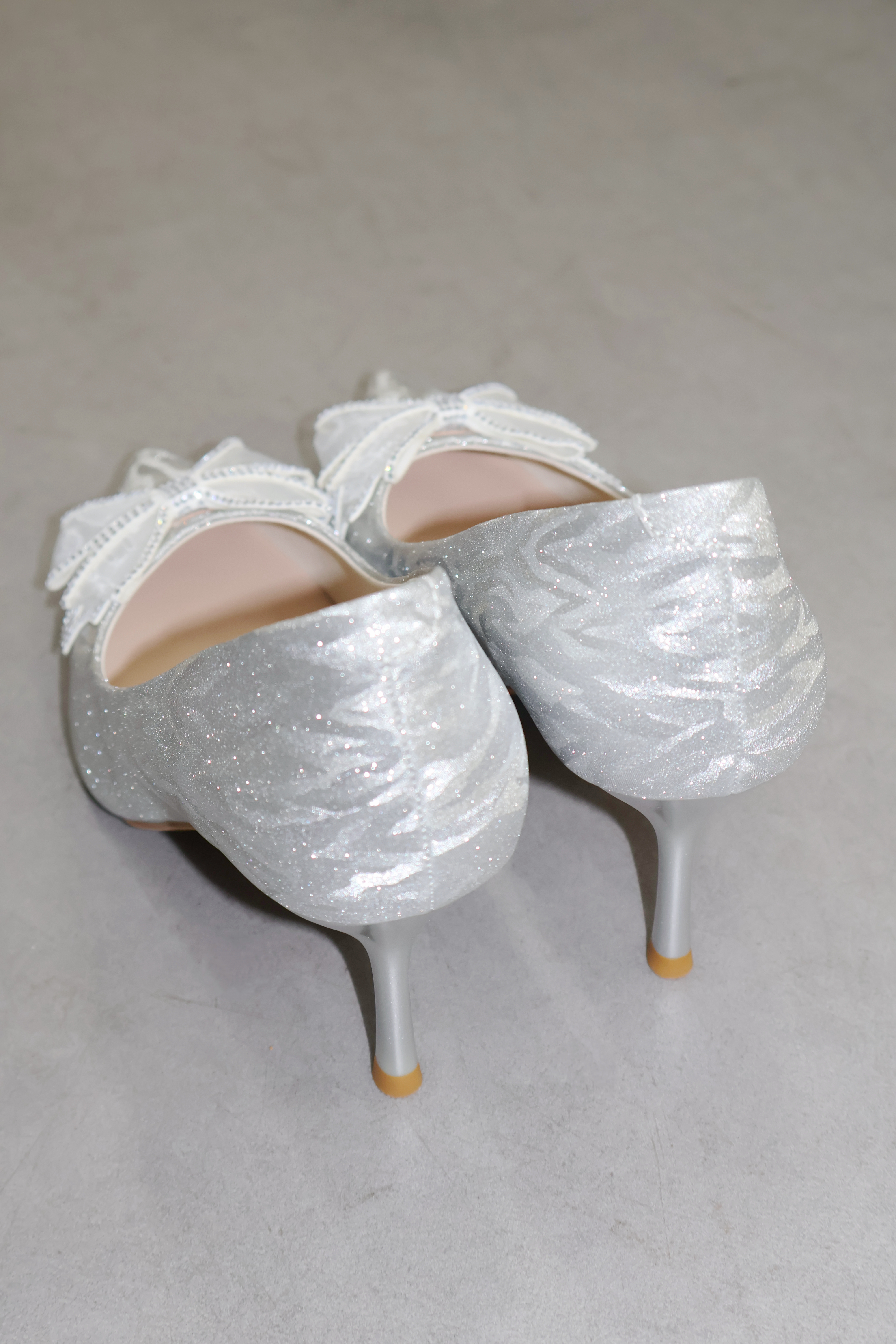 开学想入一双能撑住各种场合的高跟鞋,试了索菲娅这款真的好惊喜! 银色细闪鞋面自带氛围感,鞋头的网纱蝴蝶结精致又灵动,完全不会俗气,上脚瞬间把气质拉满。7.5cm的细跟高度刚好,走路很稳不晃脚,羊皮垫脚软乎乎的,久穿也不会磨脚,对新手很友好噢~ 尖头设计超显腿长,不管是搭小裙子、通勤装都很适配,日常约会、正式场合穿都合适,颜值和舒适度双在线,也很适合节日穿搭、送礼选择都非常合适。