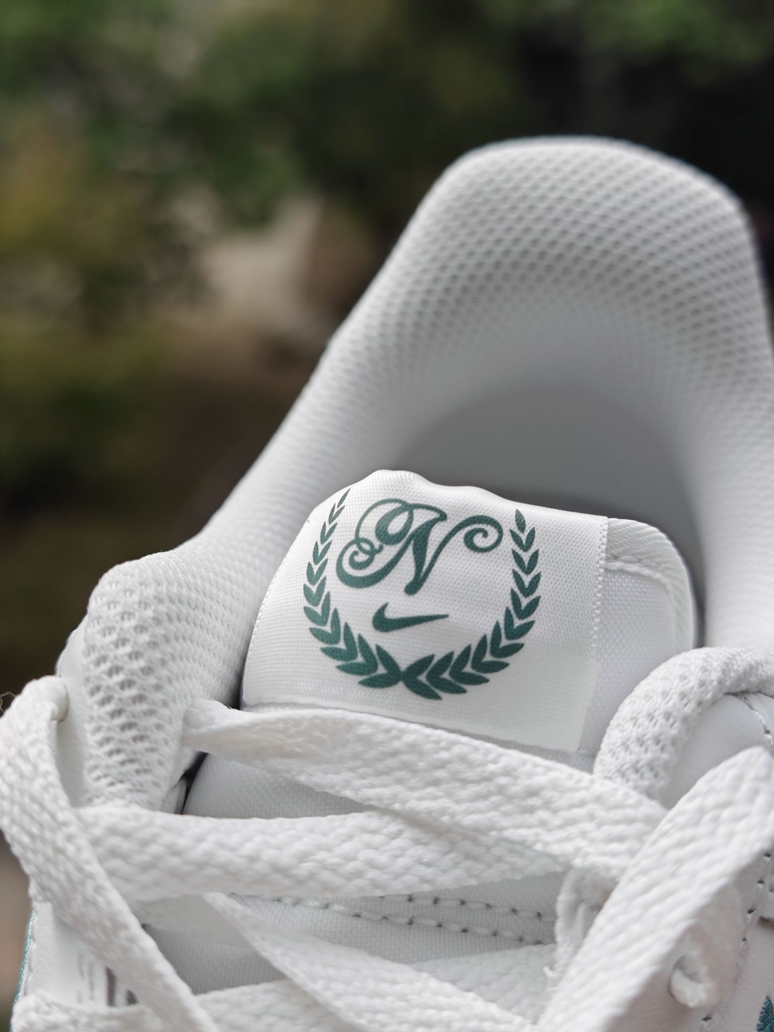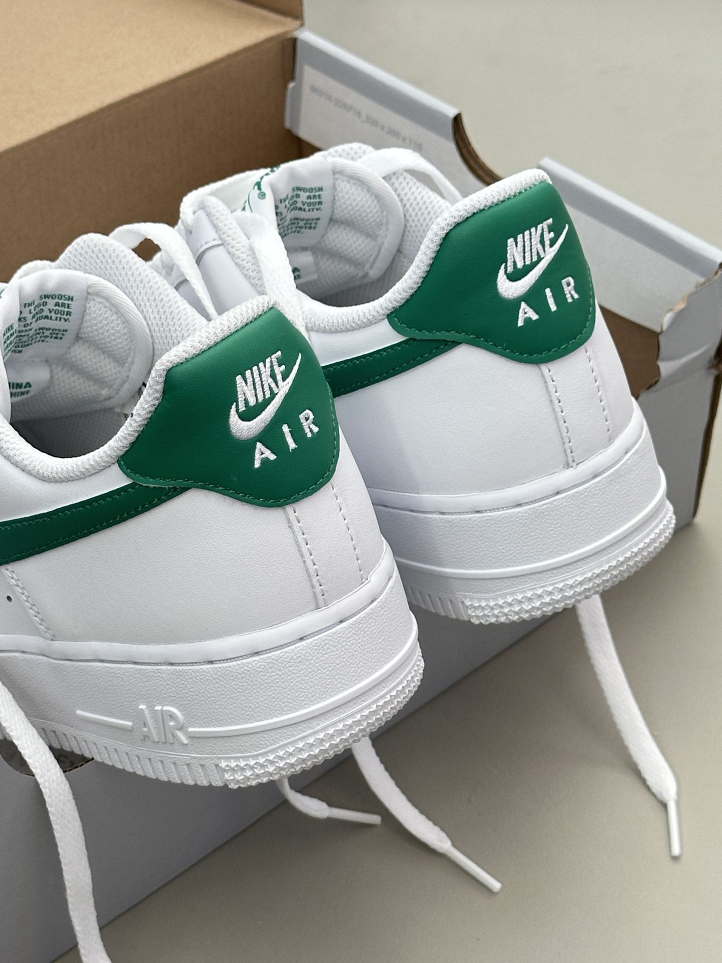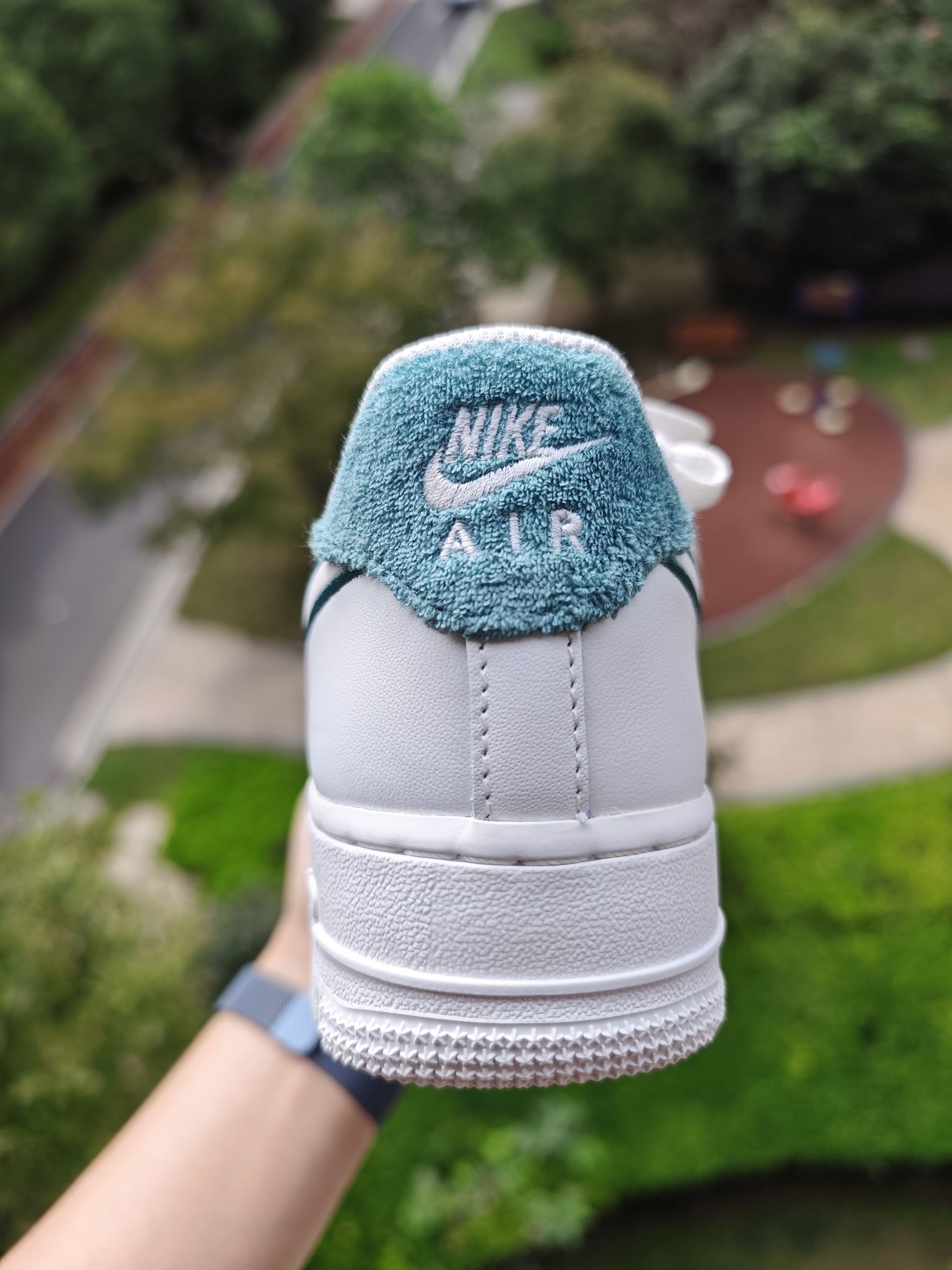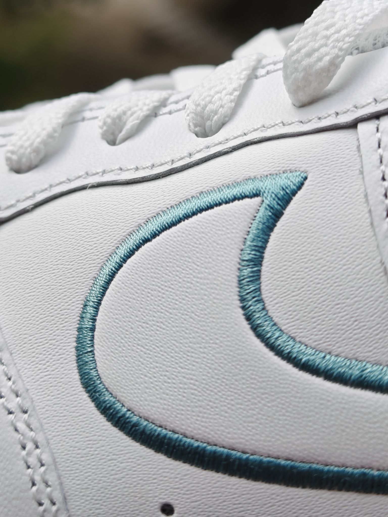 👀空军一号小白鞋太百搭了,这个大家都知道,但是全白的空军太容易撞鞋了,我个人还是喜欢轻微点缀设计的空军小白鞋 这双的swoosh钩子处的设计我很喜欢,它不是空心一圈刺绣,而是√是高起的,边上再用刺绣打边的,细节到位 远看这个钩子是空心的,蛮立体蛮特别的 鞋后跟绒布材质就像一双皮质鞋子上特别的存在,绿色用布艺确实很适合,另外鞋舌和鞋垫处都有小细节,是一双小细节慢慢的空军...