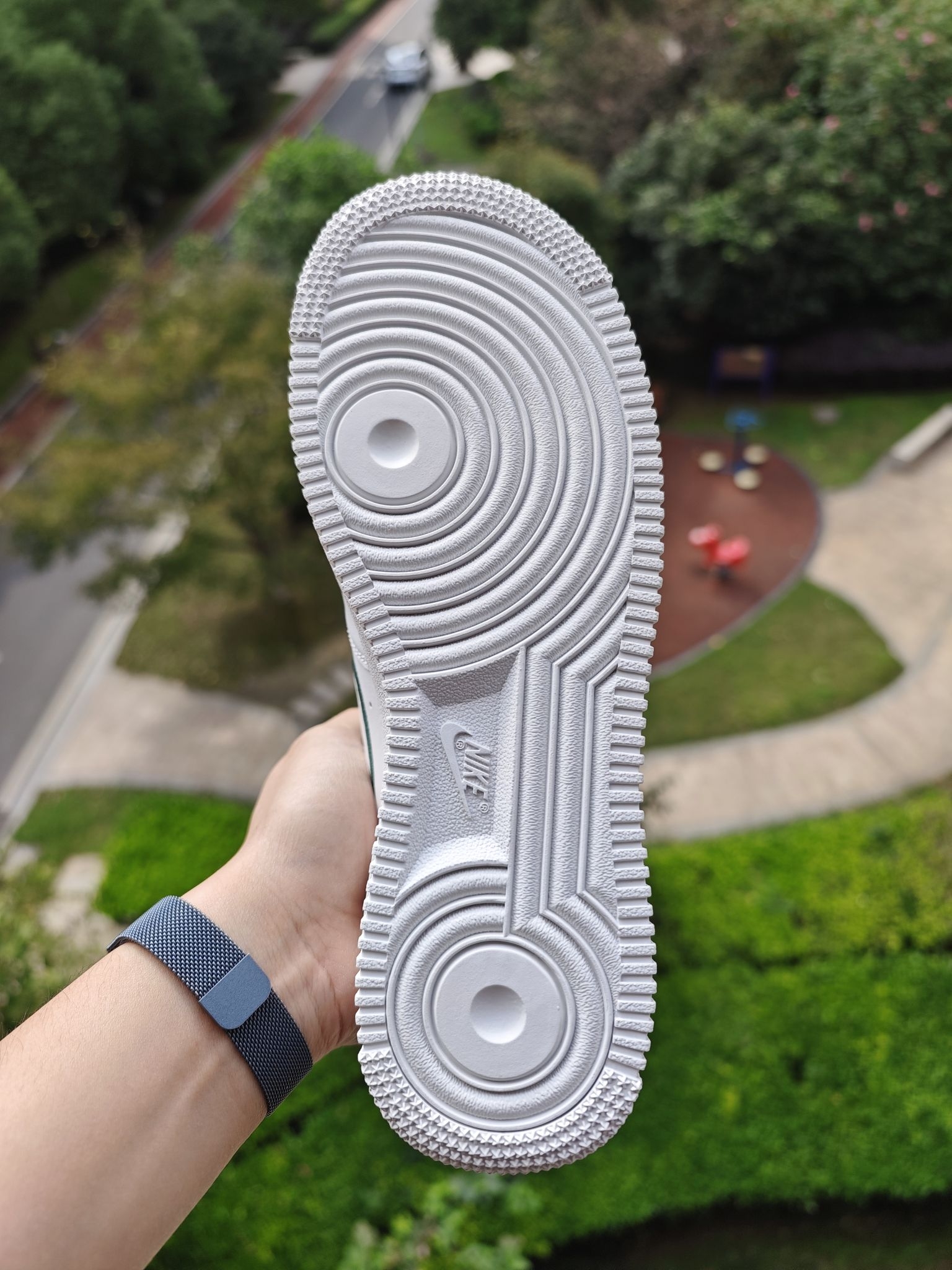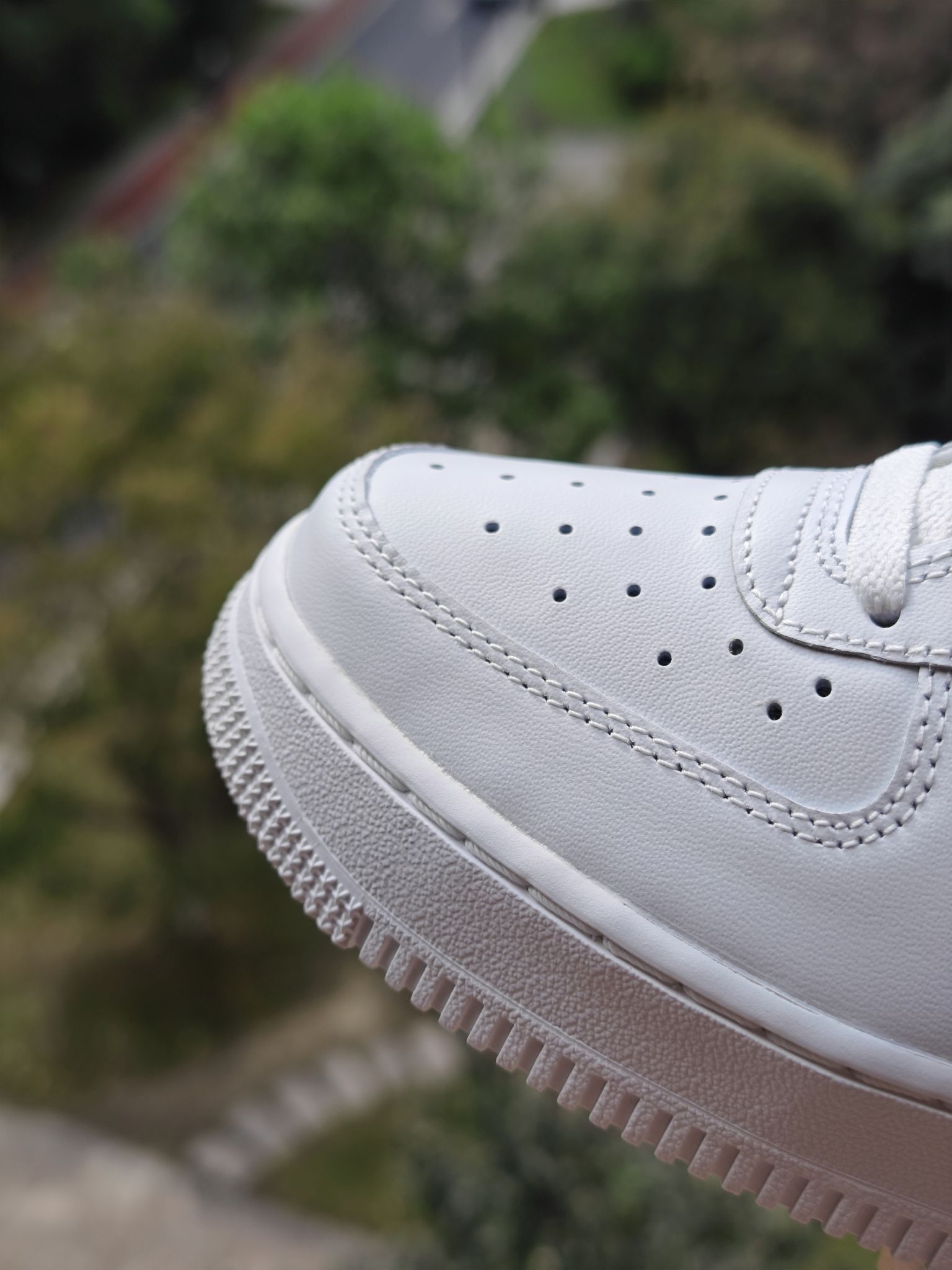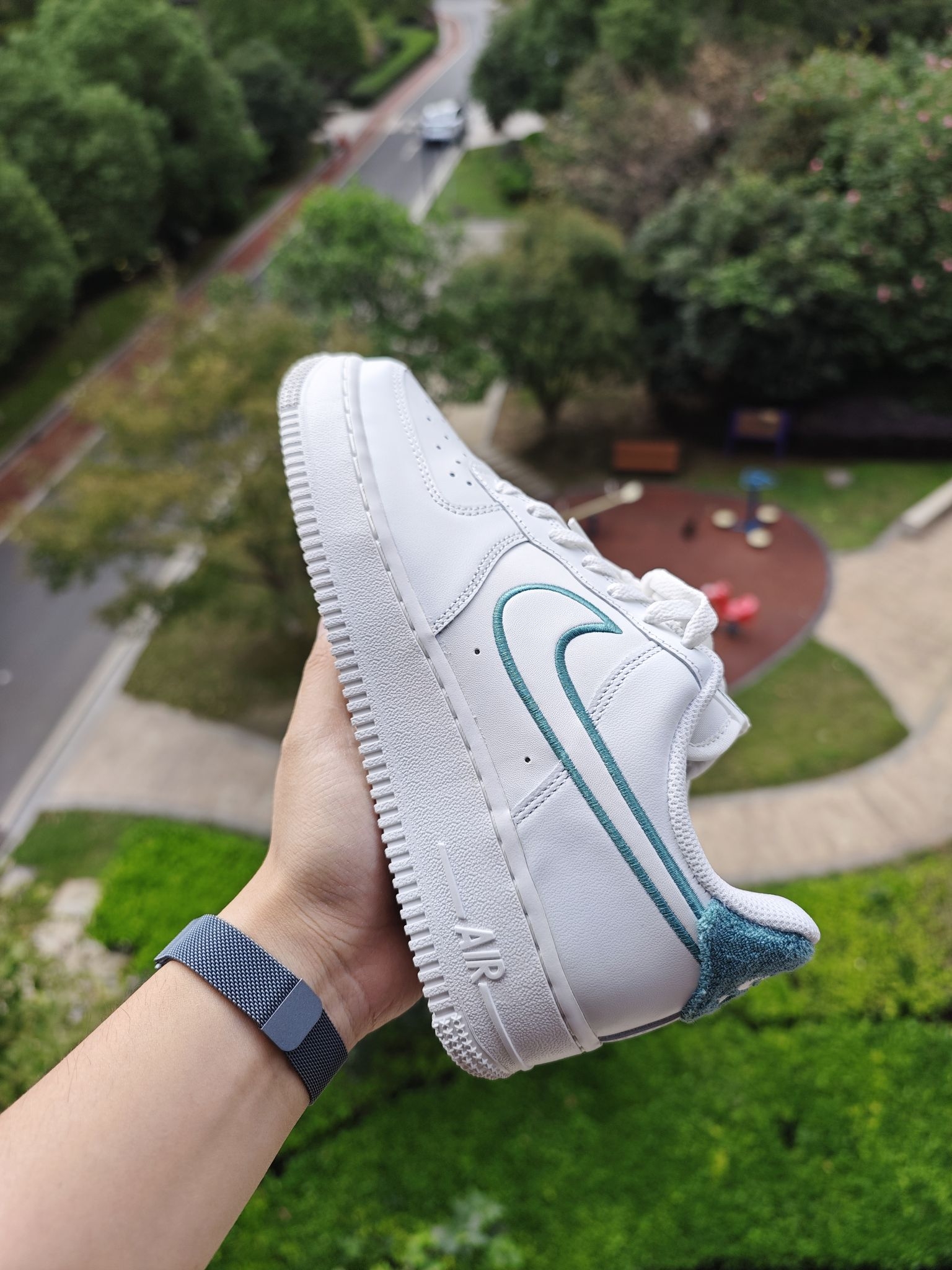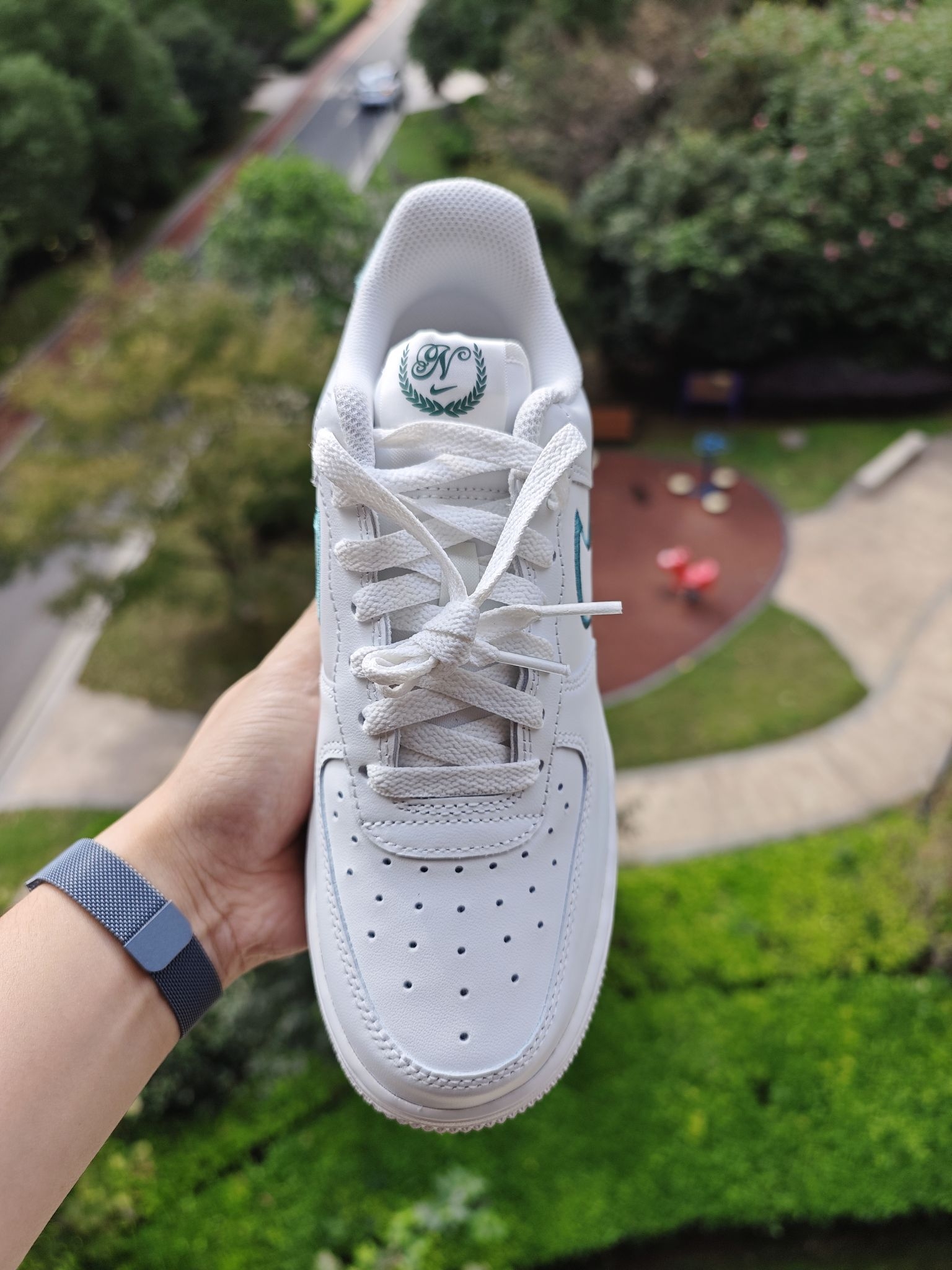👀空军一号小白鞋太百搭了,这个大家都知道,但是全白的空军太容易撞鞋了,我个人还是喜欢轻微点缀设计的空军小白鞋 这双的swoosh钩子处的设计我很喜欢,它不是空心一圈刺绣,而是√是高起的,边上再用刺绣打边的,细节到位 远看这个钩子是空心的,蛮立体蛮特别的 鞋后跟绒布材质就像一双皮质鞋子上特别的存在,绿色用布艺确实很适合,另外鞋舌和鞋垫处都有小细节,是一双小细节慢慢的空军...