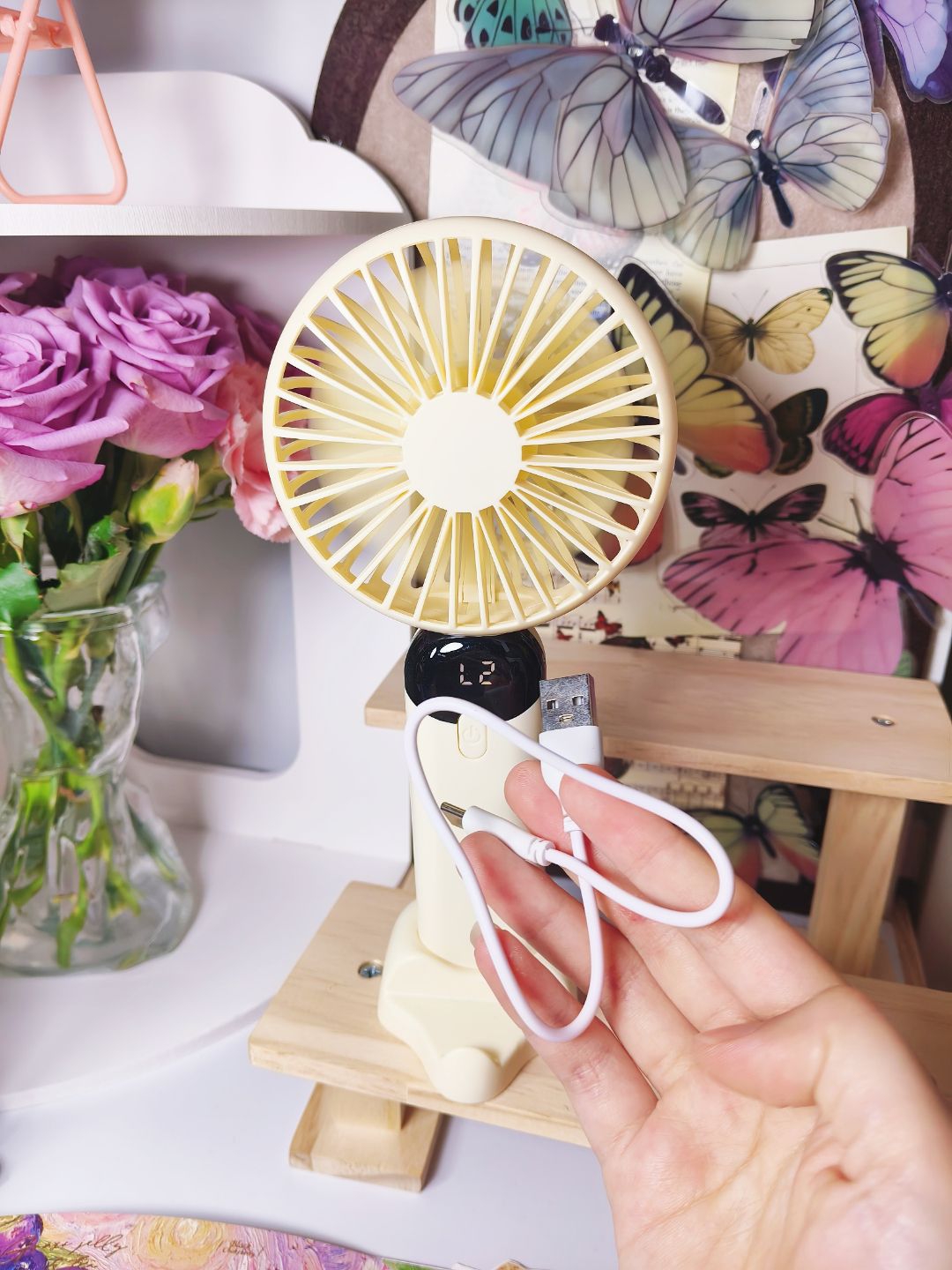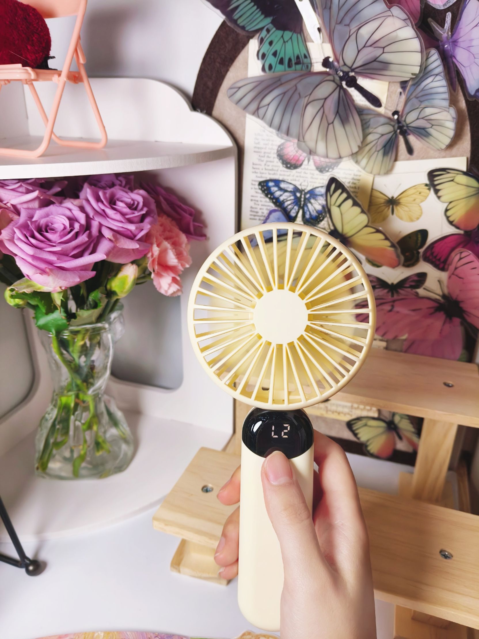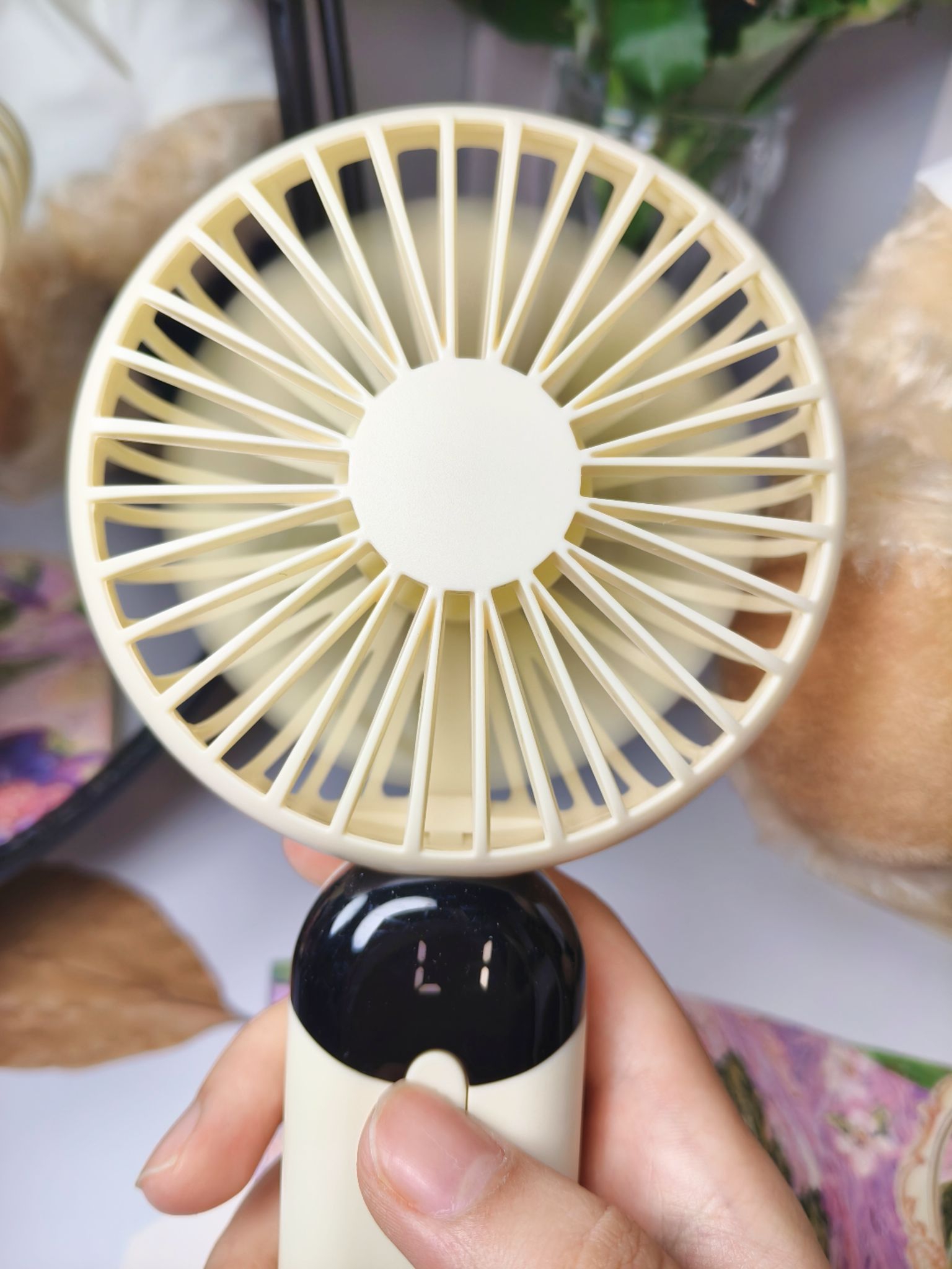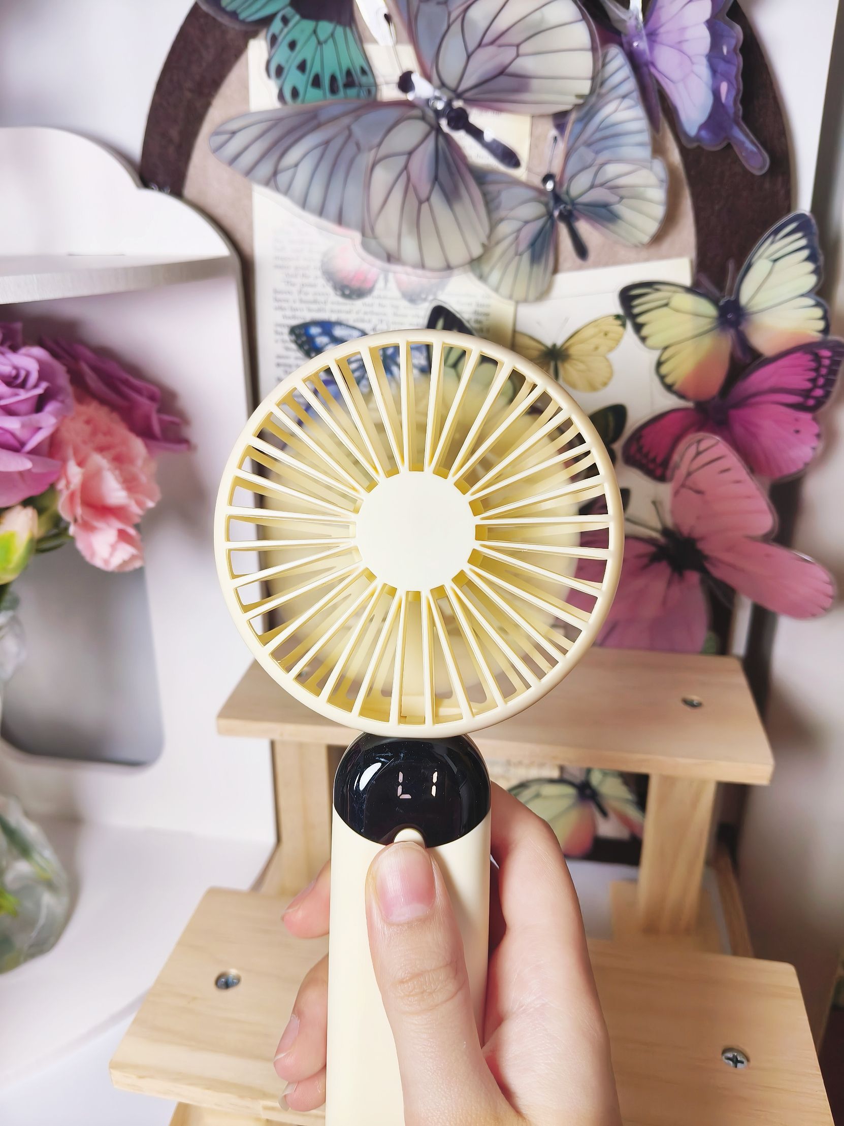 南方夏天总是到的特别早,户外炎热🥵,风力足够和续航充足的手持小风扇必不可少! 入手了这一款性价比高的奶黄色手持小风扇,一共有六档可以调节,可以调到感到舒服的风力,而且电量和风力直接可显示,能随时看到数值,很方便! 还配有底座,可以解放双手,配色好看,风力强大,还要什么自行车,入手不亏!