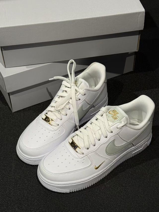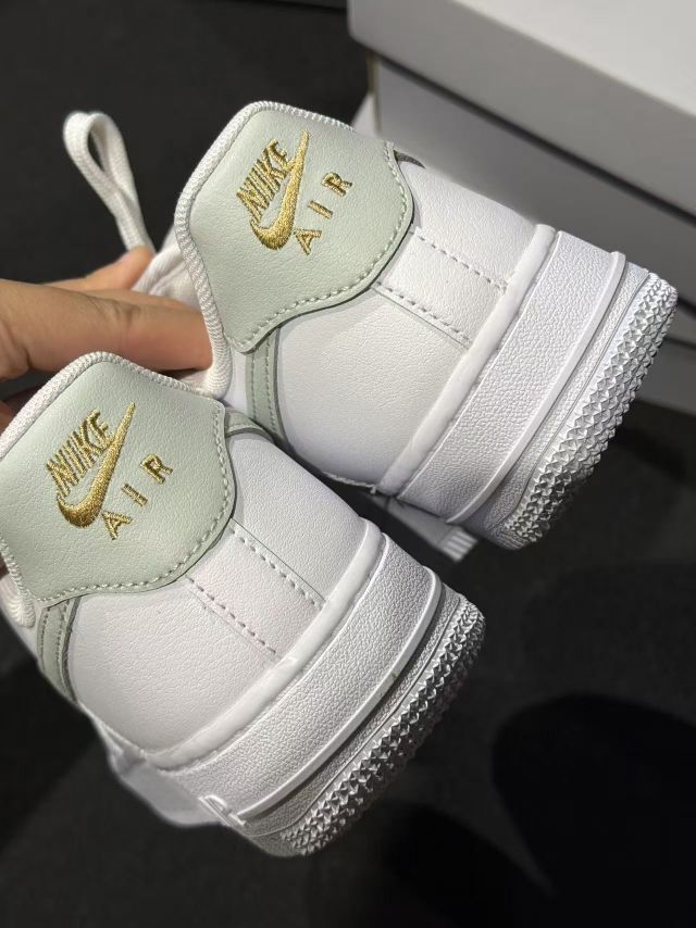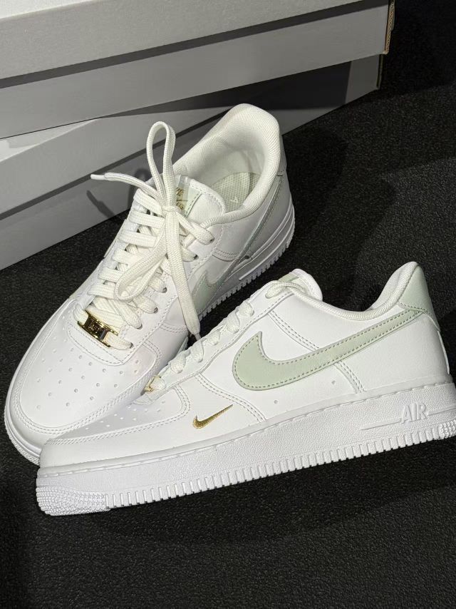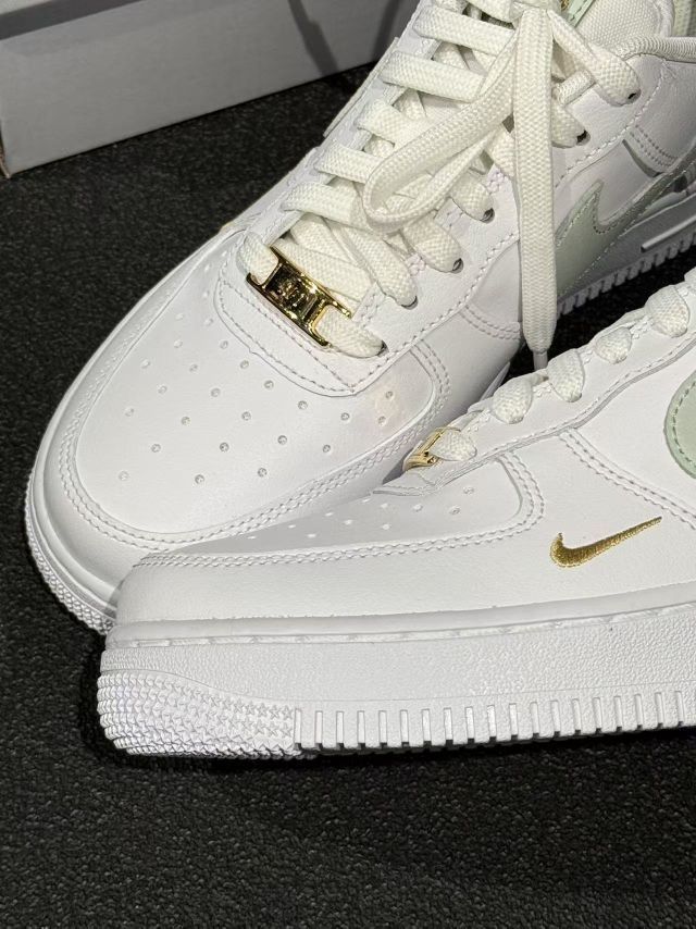 经典空军一号版型,浅绿勾边+金标点缀,奶白底色干净清爽,上脚显白又温柔,日常通勤、休闲穿搭都适配,脚感舒适,是春夏刚需小白鞋。