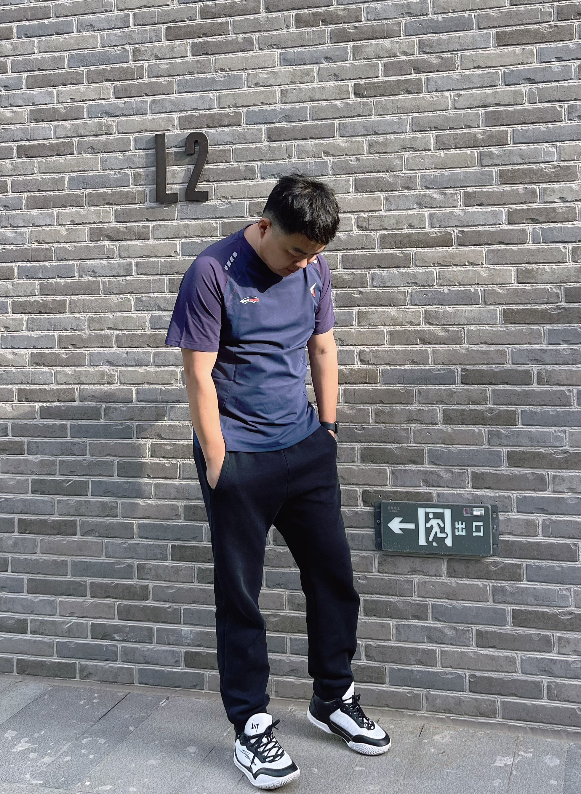 #得物顶男计划 夏日运动风穿搭公式👇 👕 ANDTIME 蓝紫速干T:凉感透气,夏日刚需 👖 安踏 黑色束脚运动裤:显瘦不束缚 👟 shiyitong黑白篮球鞋:实战百搭两不误 简单配色+舒适面料,夏天出门舒服又有型~