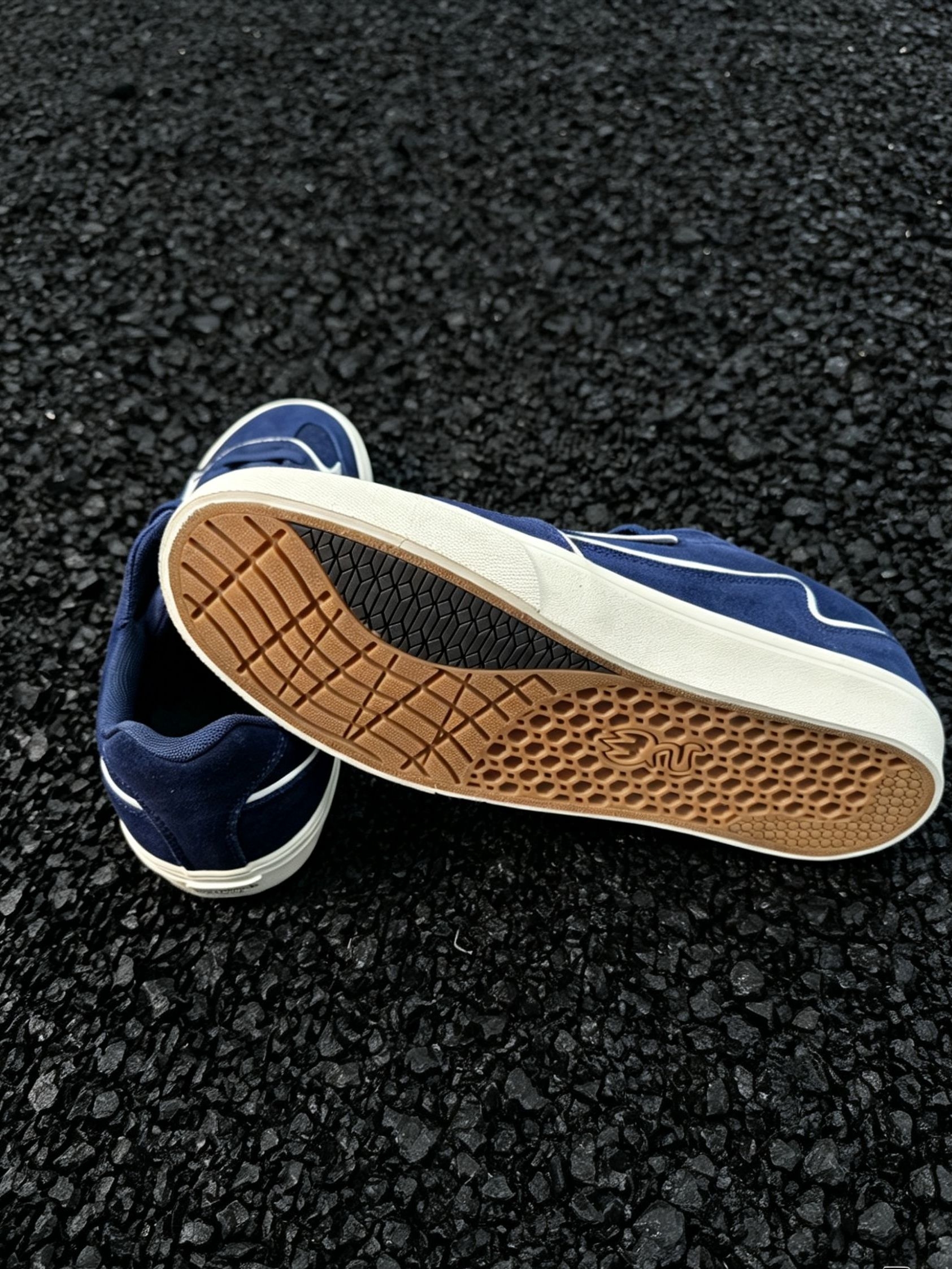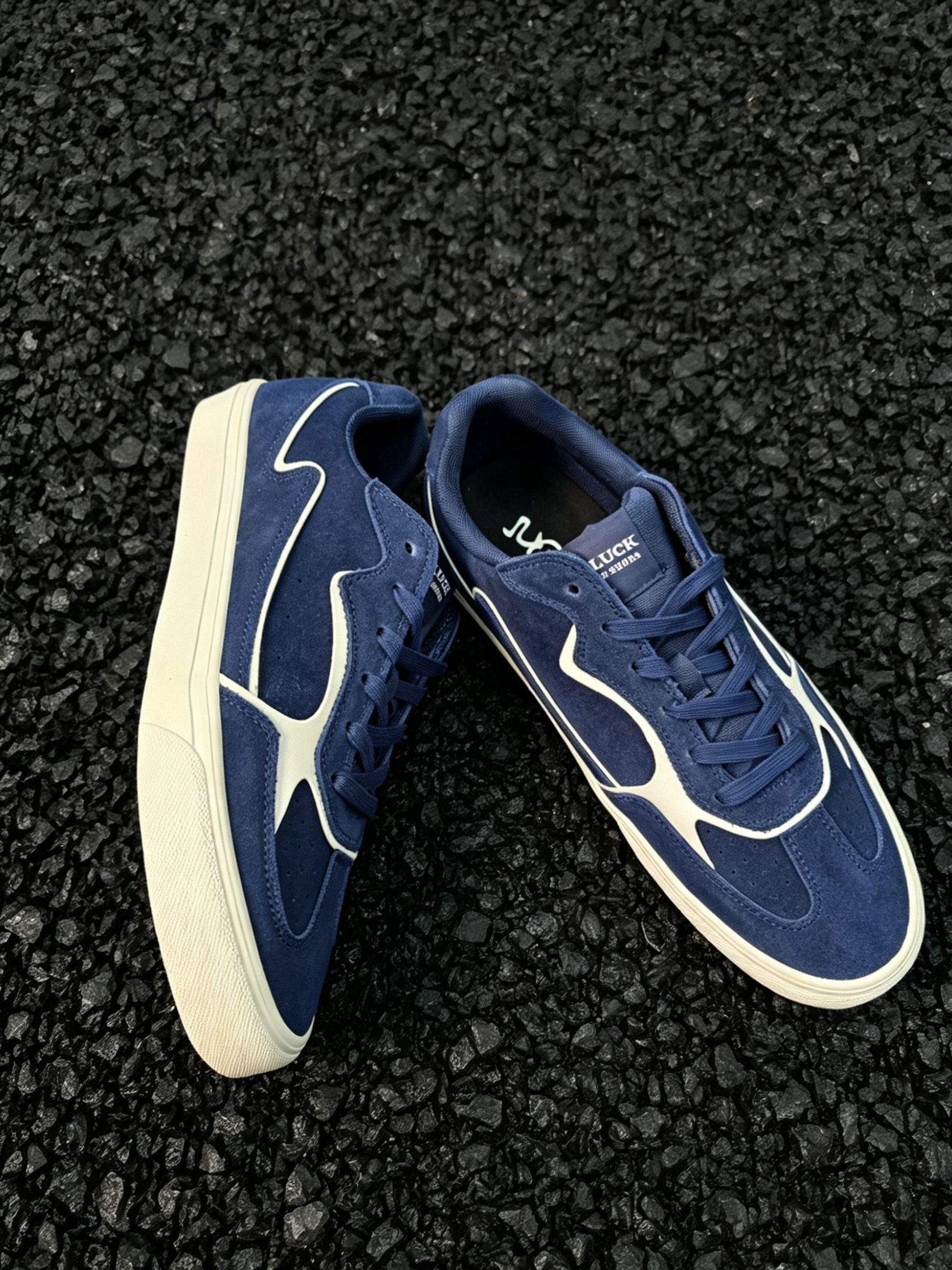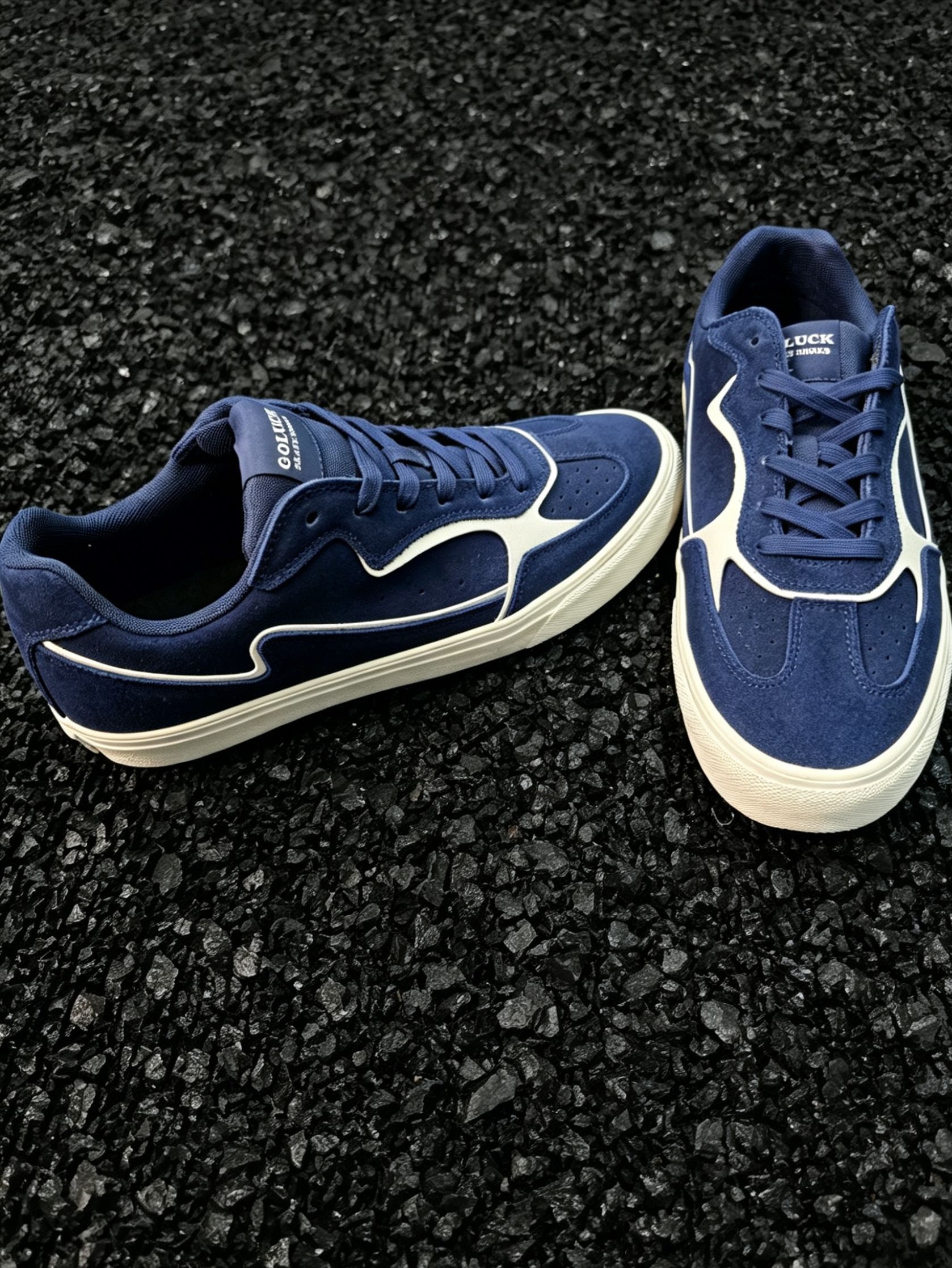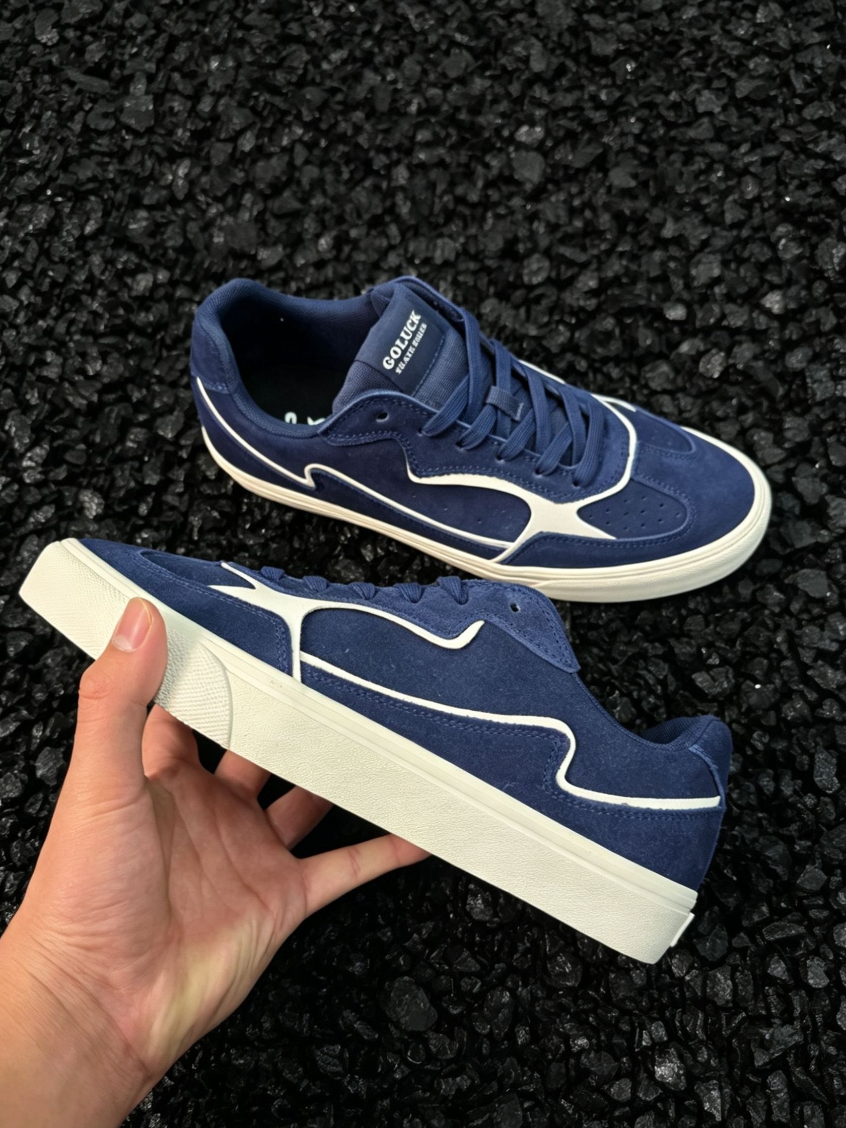 谁懂啊!这双藏青色滑板鞋真的把复古氛围感焊在脚上了! 麂皮质感的藏青鞋面,搭配奶白色线条做撞色设计,经典又不挑人,上脚直接把美式复古那味儿拿捏得死死的。米白色做旧中底+防滑橡胶大底,不仅颜值在线,日常通勤、滑板刷街都能打,脚感软乎乎的,久穿也不磨脚。 不管是搭白袜黑裤走clean fit风,还是配牛仔裤走街头休闲风,都能轻松适配。黑色碎石背景下更显质感,上脚显脚小,男生女生都能穿,是鞋柜里...