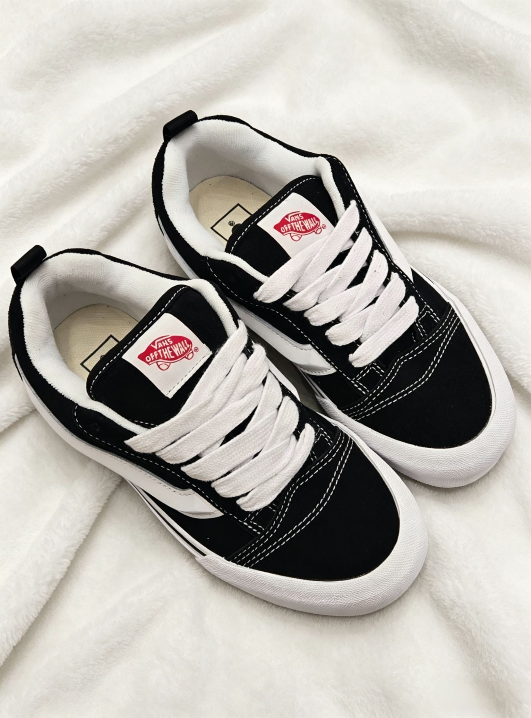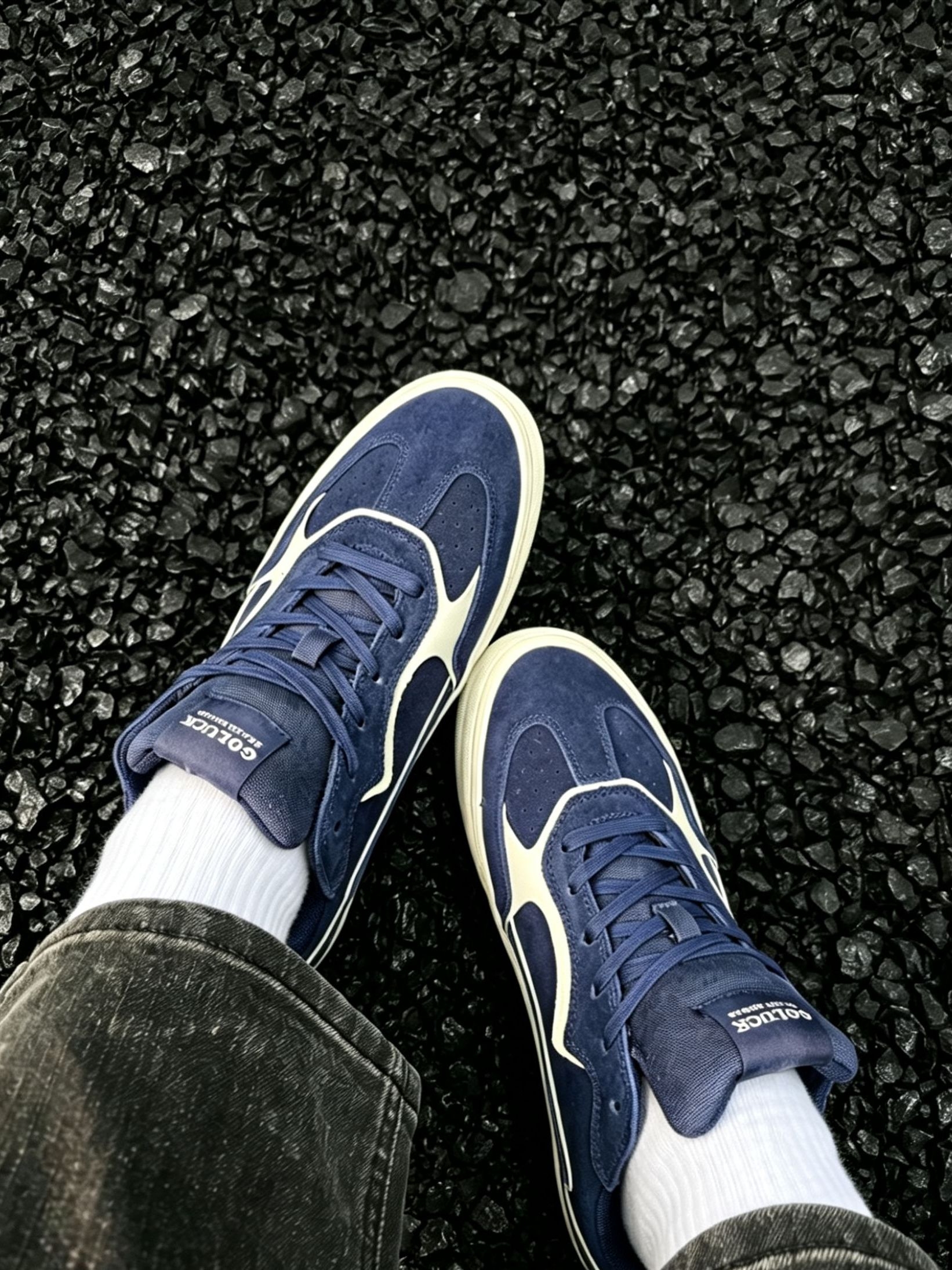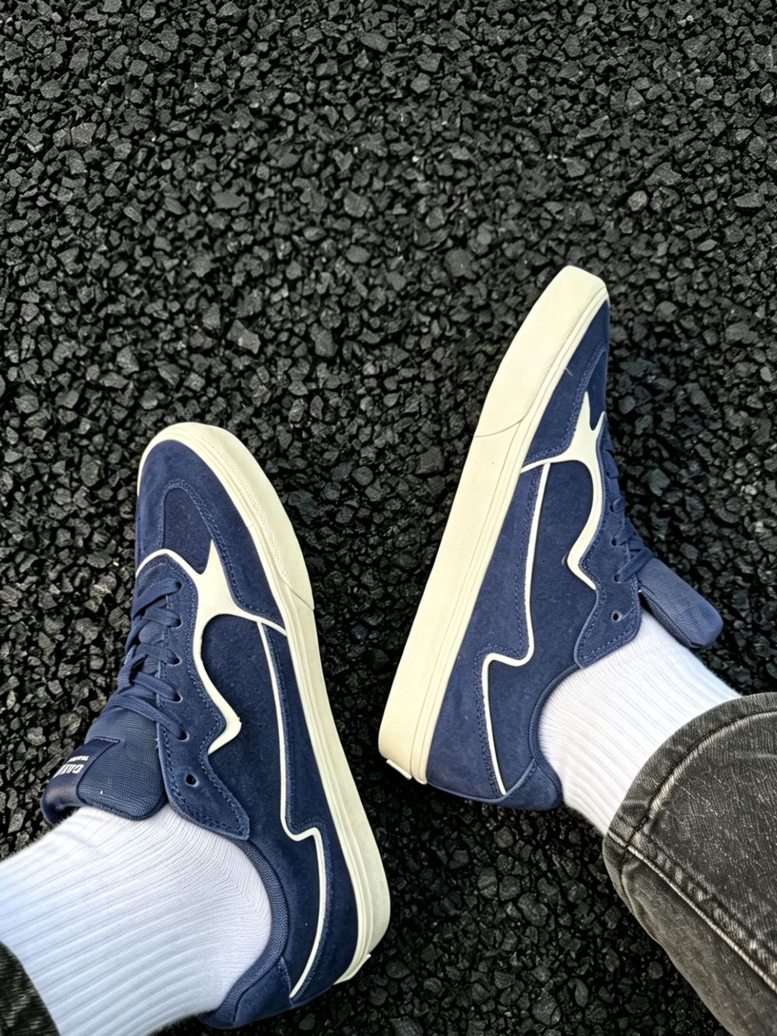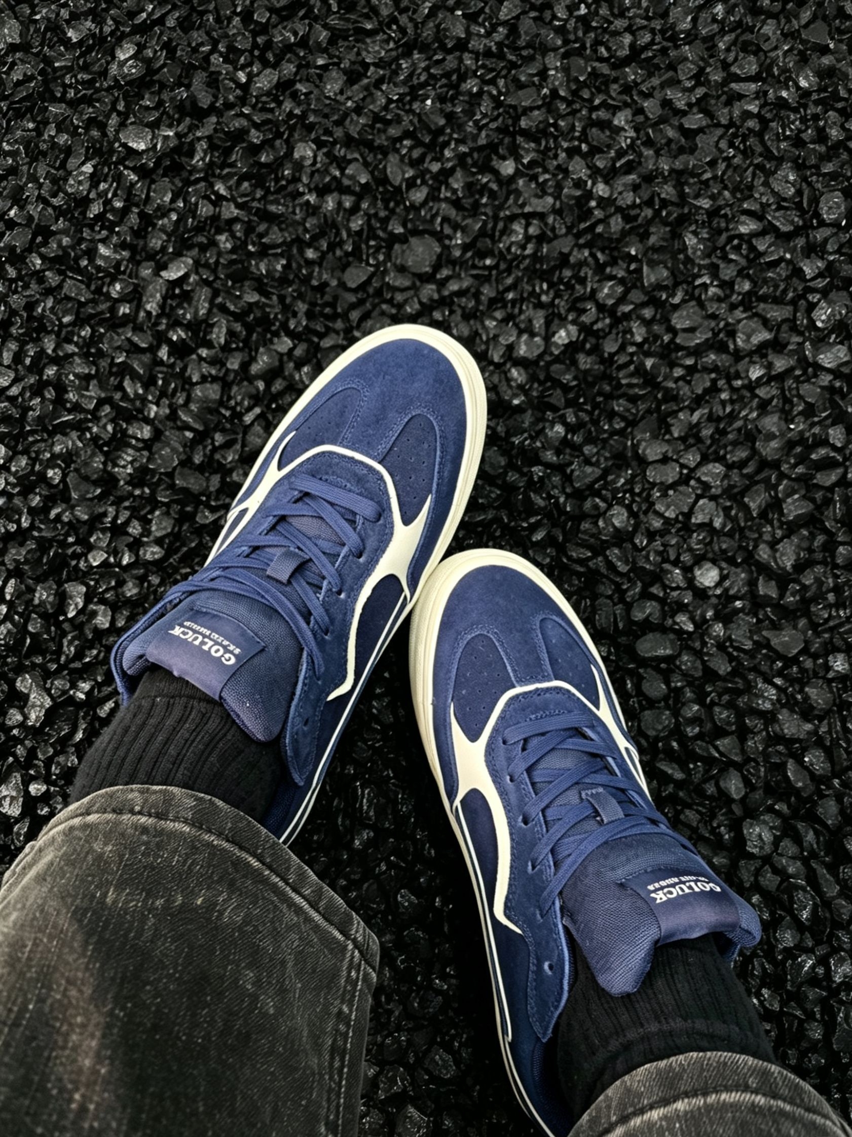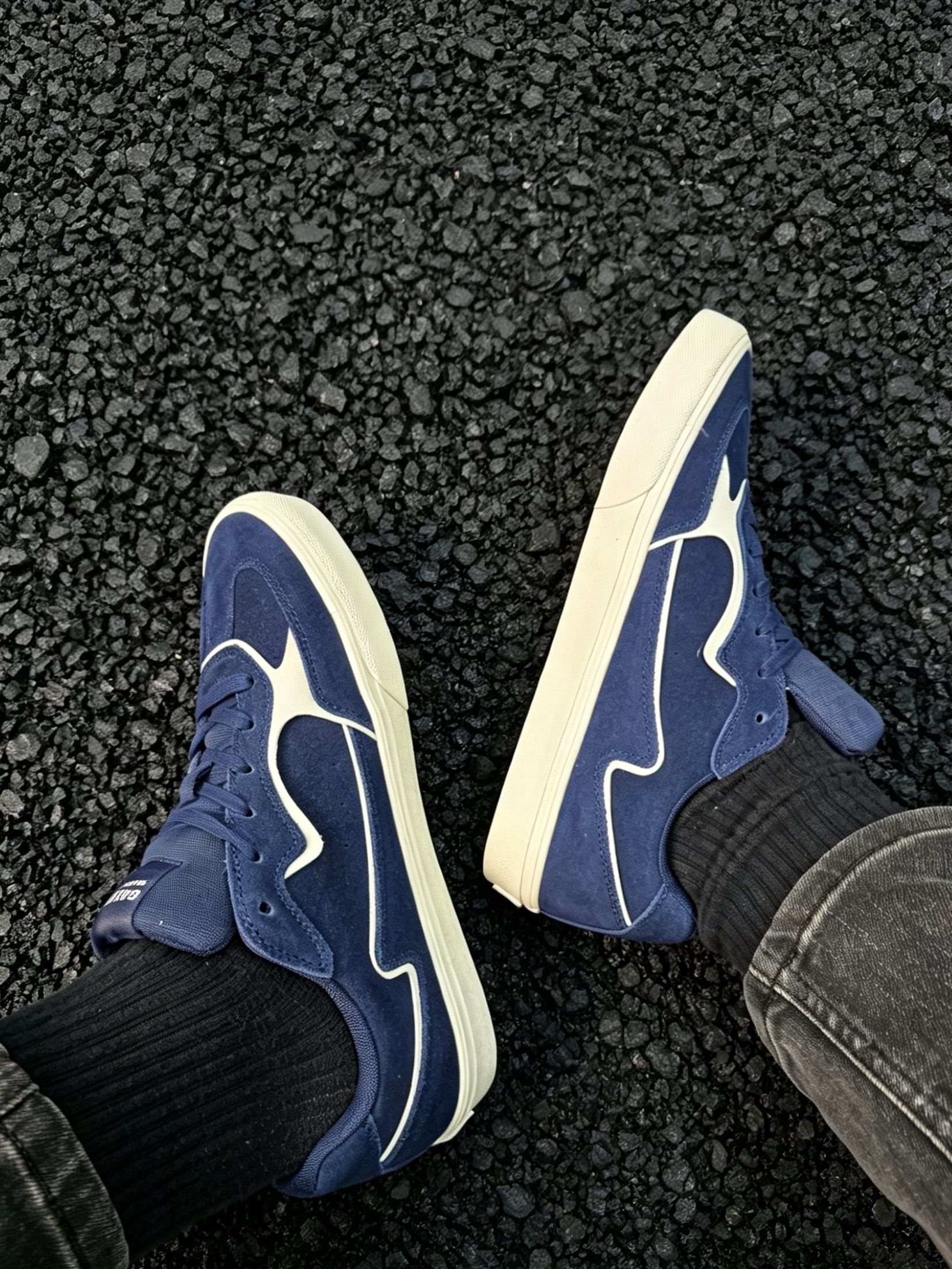 谁懂啊!这双藏青色滑板鞋真的把复古氛围感焊在脚上了! 麂皮质感的藏青鞋面,搭配奶白色线条做撞色设计,经典又不挑人,上脚直接把美式复古那味儿拿捏得死死的。米白色做旧中底+防滑橡胶大底,不仅颜值在线,日常通勤、滑板刷街都能打,脚感软乎乎的,久穿也不磨脚。 不管是搭白袜黑裤走clean fit风,还是配牛仔裤走街头休闲风,都能轻松适配。黑色碎石背景下更显质感,上脚显脚小,男生女生都能穿,是鞋柜里...