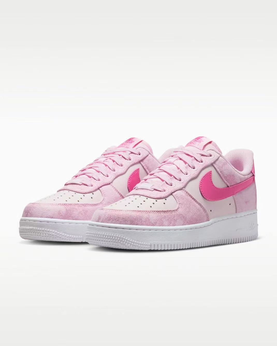来!姐妹们看这双2026春夏新款Nike Air Force 1! 整双鞋做了粉白渐变的水洗丹宁设计,鞋面是帆布+皮革拼接,质感拉满,亮粉色Swoosh超吸睛! 经典空军一号鞋型,显脚瘦、显腿长,内置气垫上脚软弹,日常穿、运动穿都合适! 不管是搭甜妹风、辣妹风、休闲风,一双鞋全搞定! 春日必入的粉色神仙鞋,闭眼冲就对了!