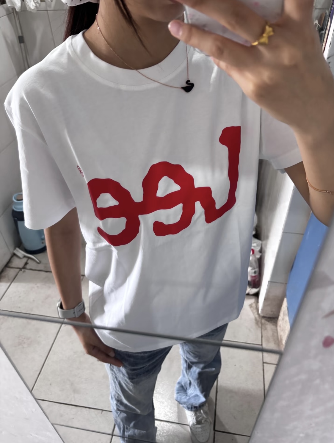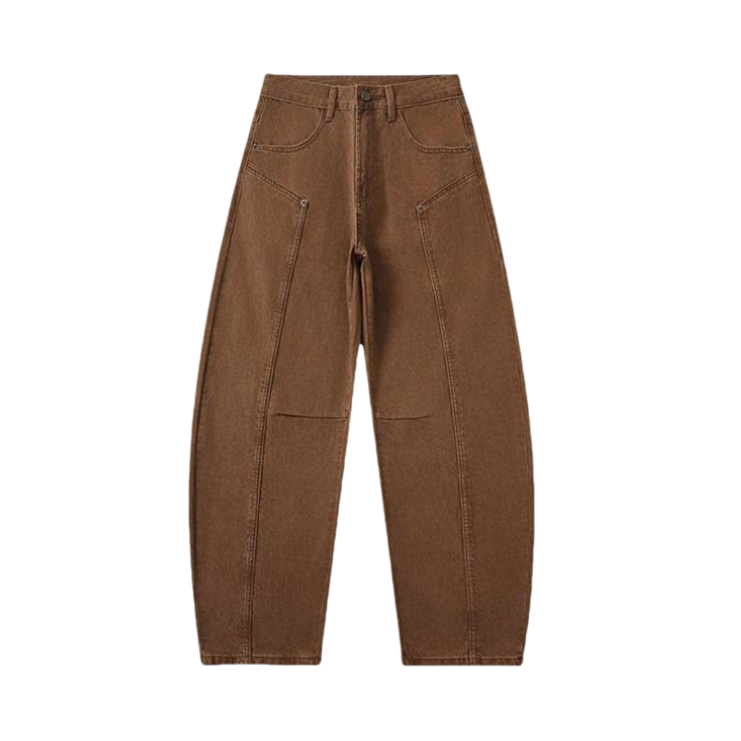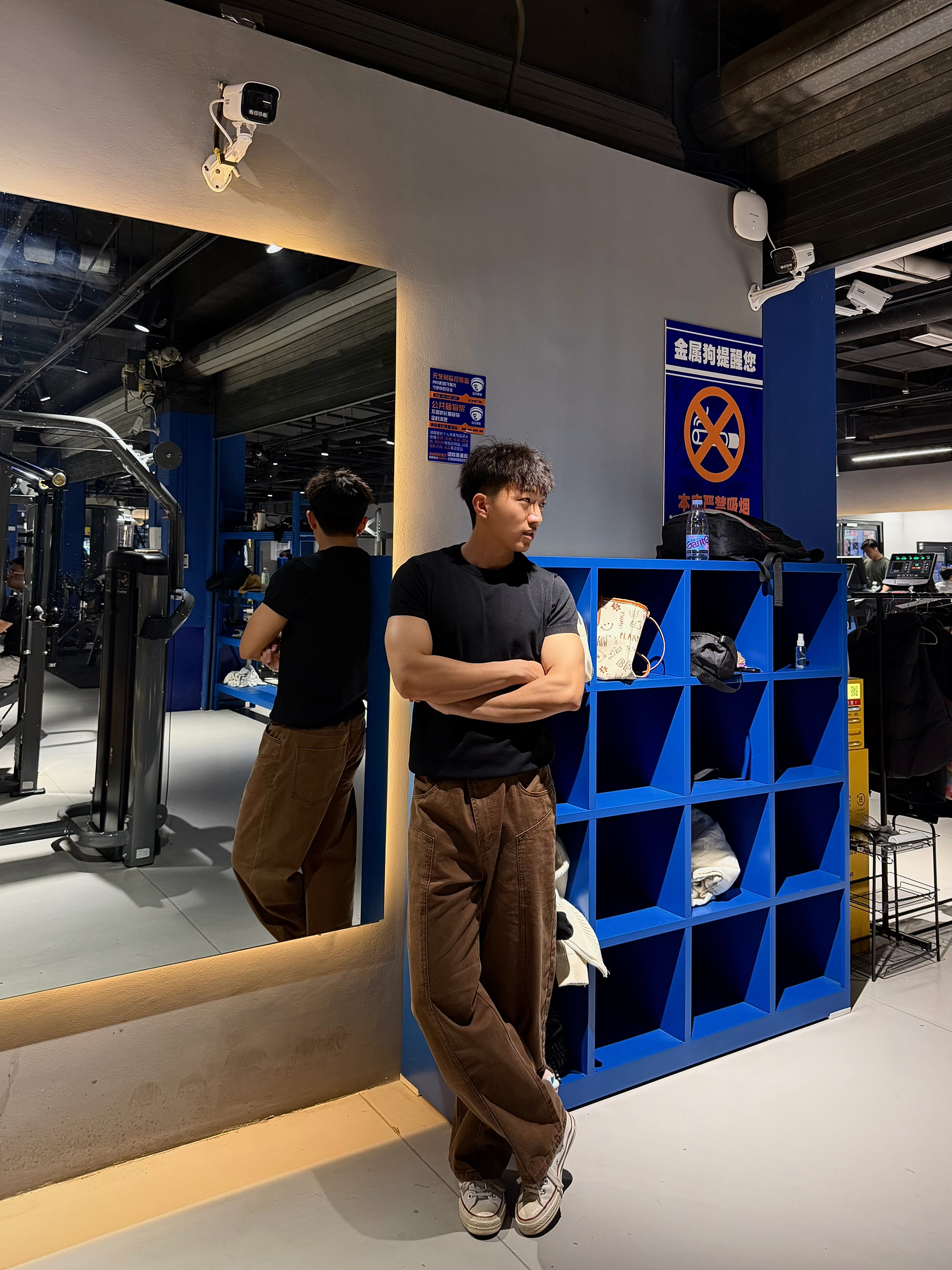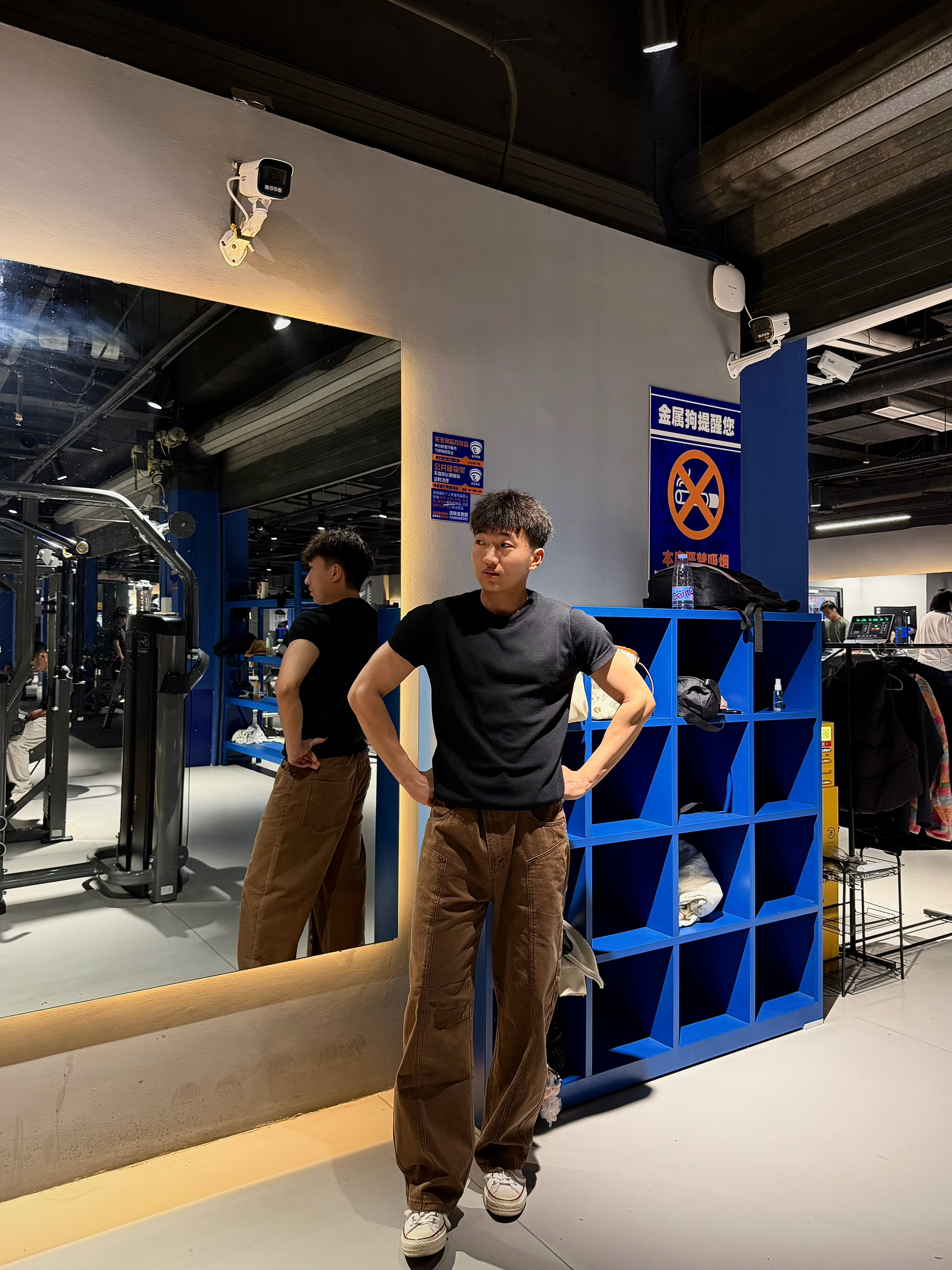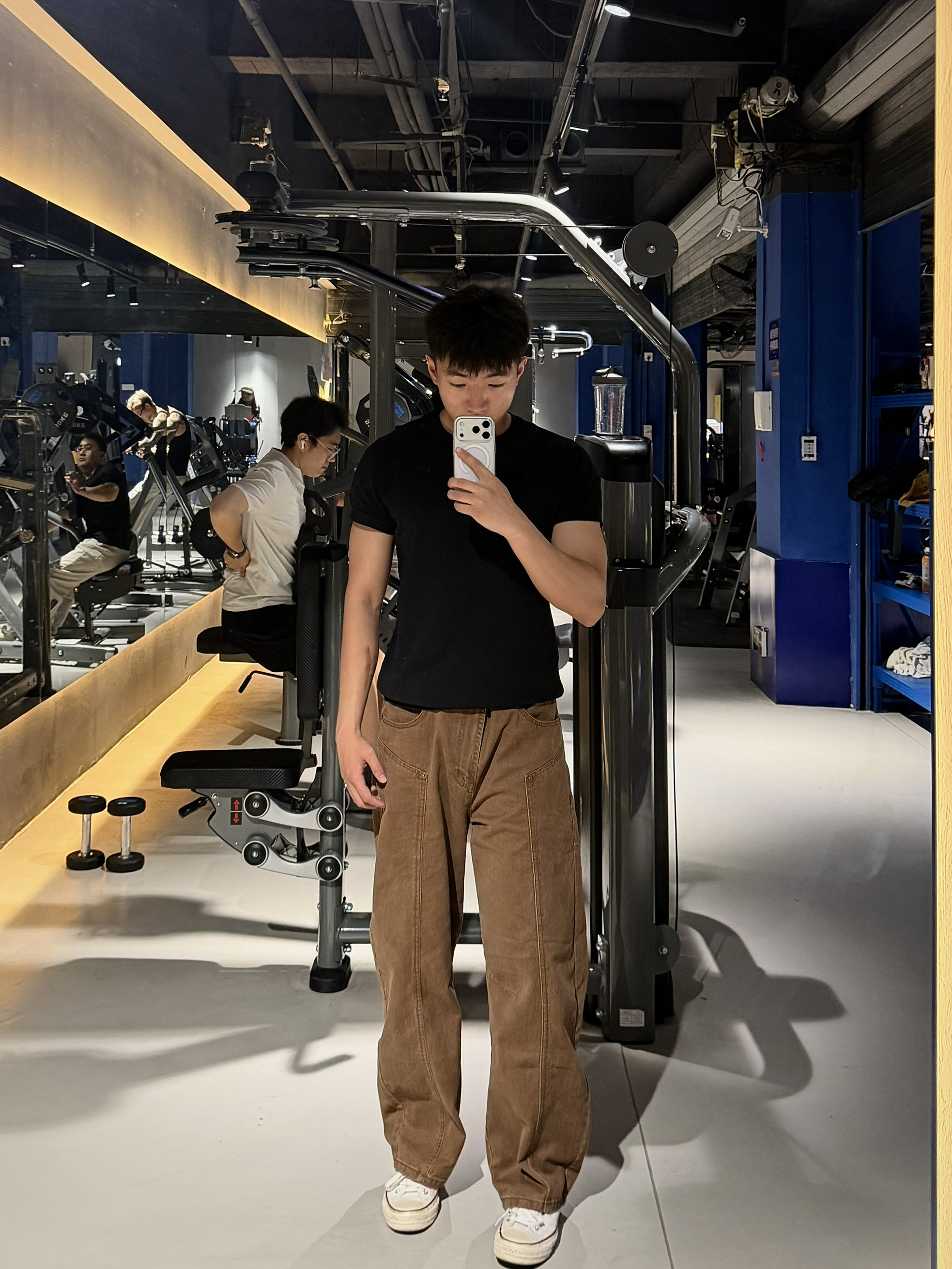上身是一个比较简单基础的一个正肩短袖穿上很显身材 下身棕色弯刀裤穿起来很有型 面料也挺不错的 很好的修饰了腿型