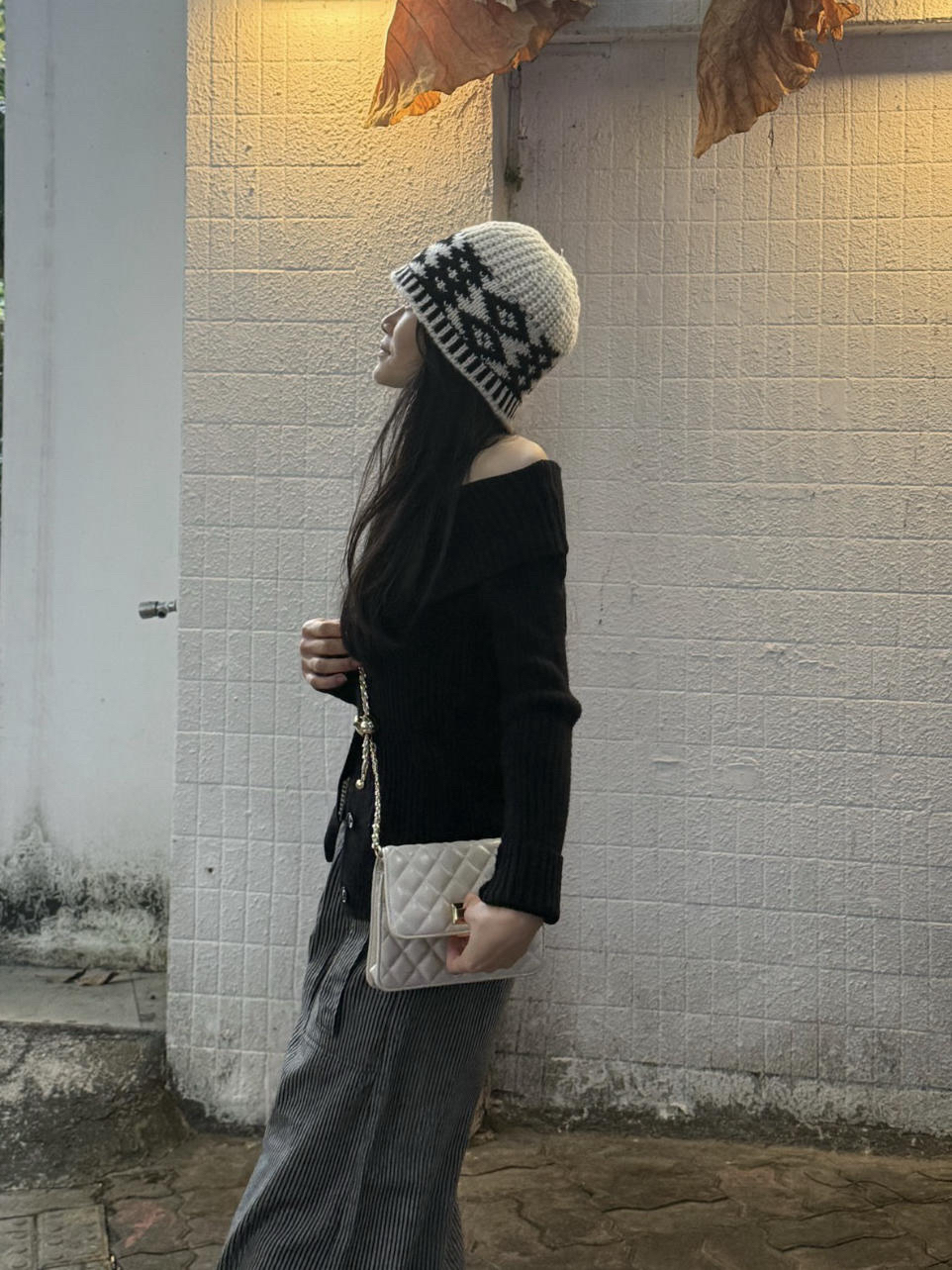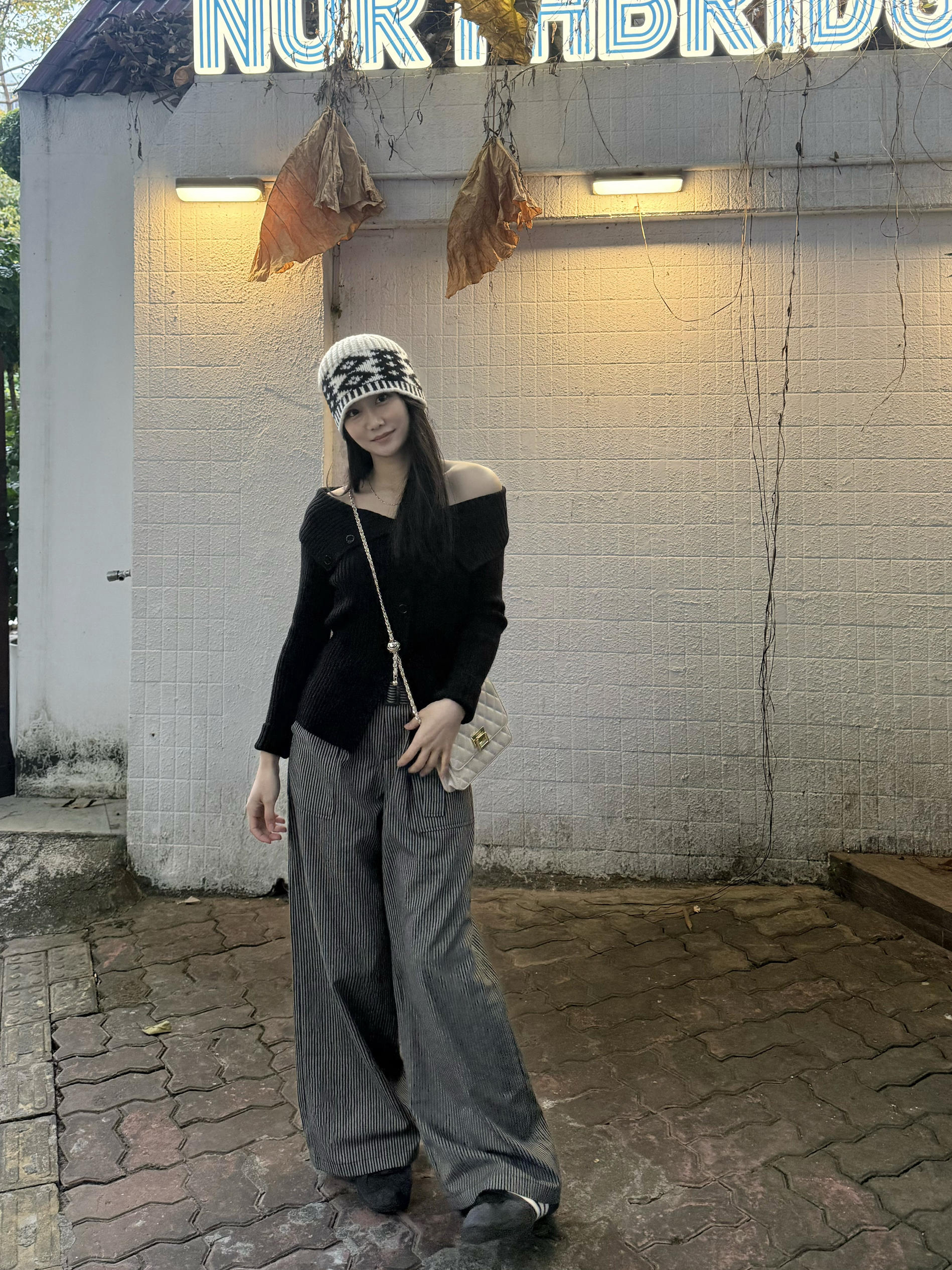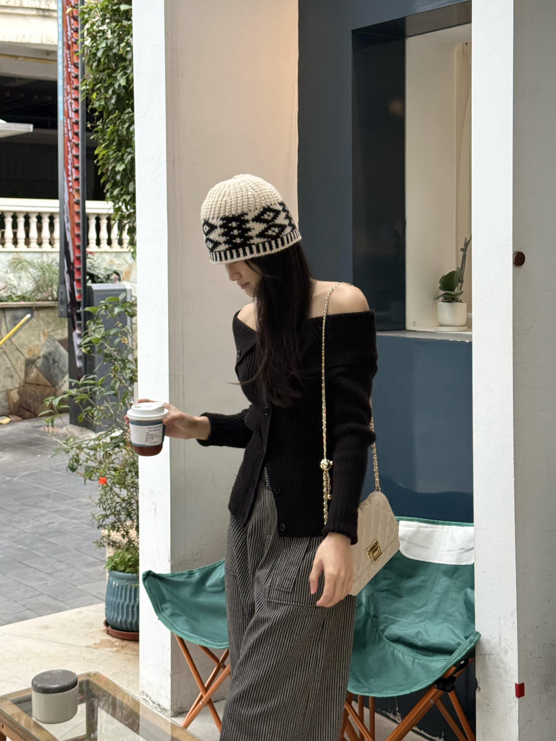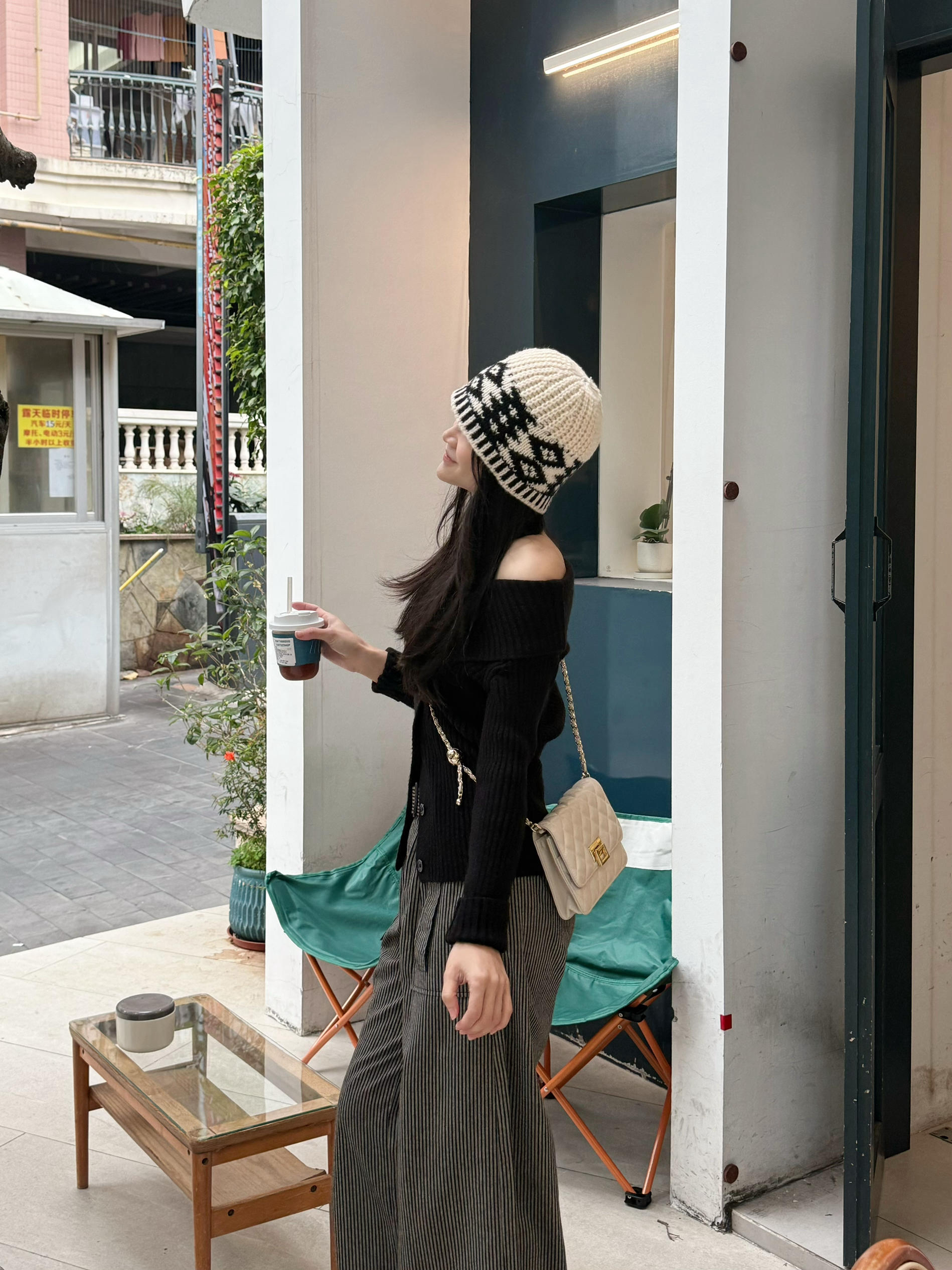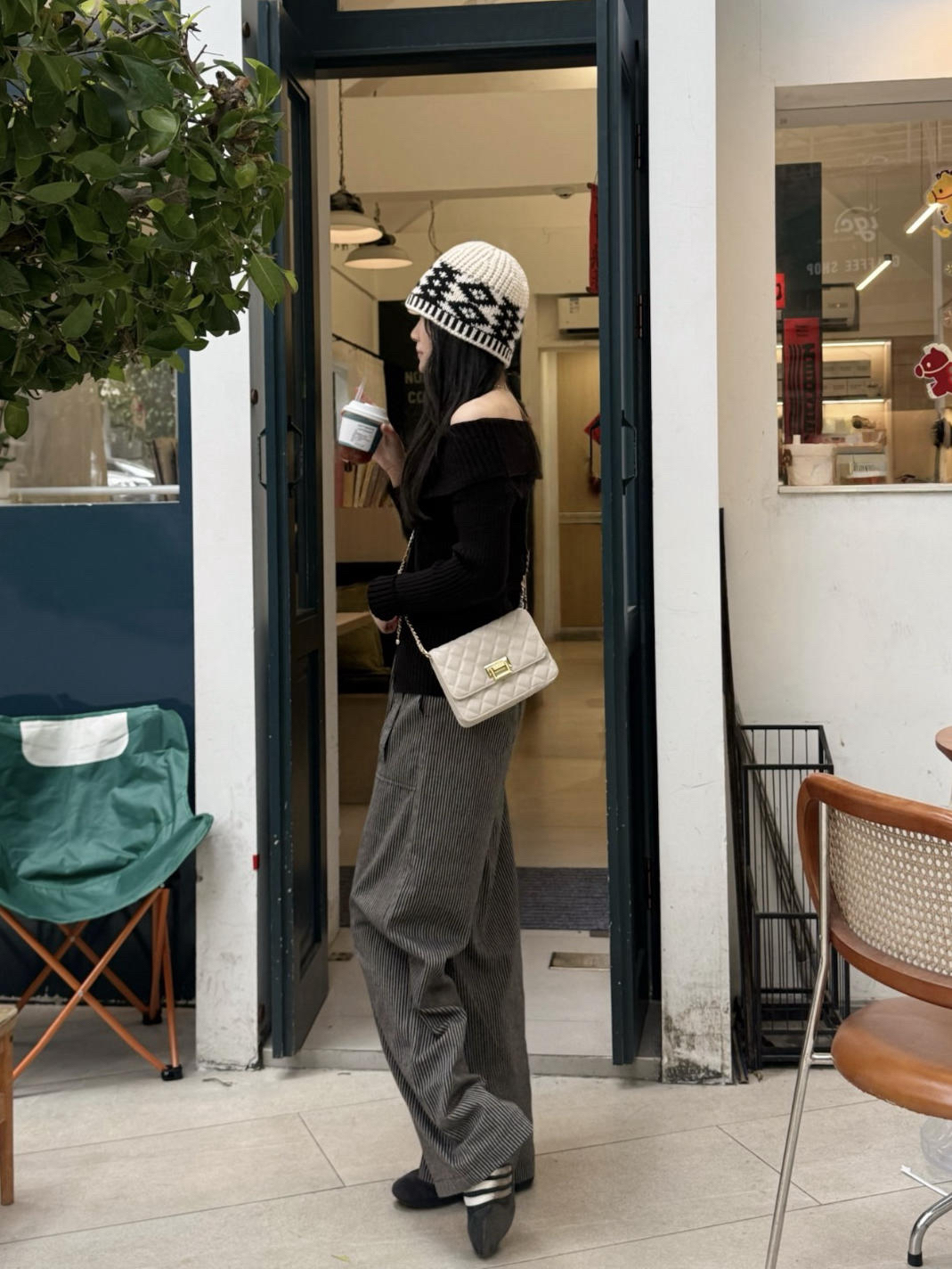 分享我的今日份逛街ootd~ 黑色一字肩毛衣➕条纹西装裤 精致中又不失慵懒氛围感 包包选的是白色菱格纹链条包⛓️ 奶白皮质搭配金色链条精致感拉满✔️ 最后再来一双同色系休闲鞋➕针织帽 自带韩系智性感~ 入春就这么穿吖~