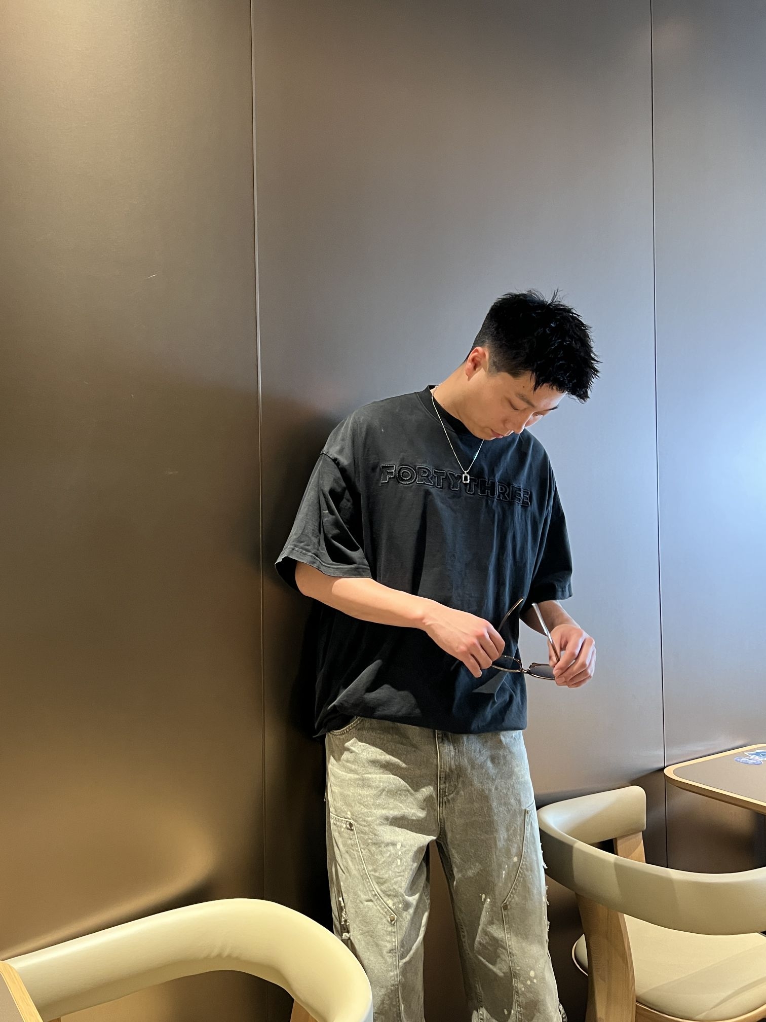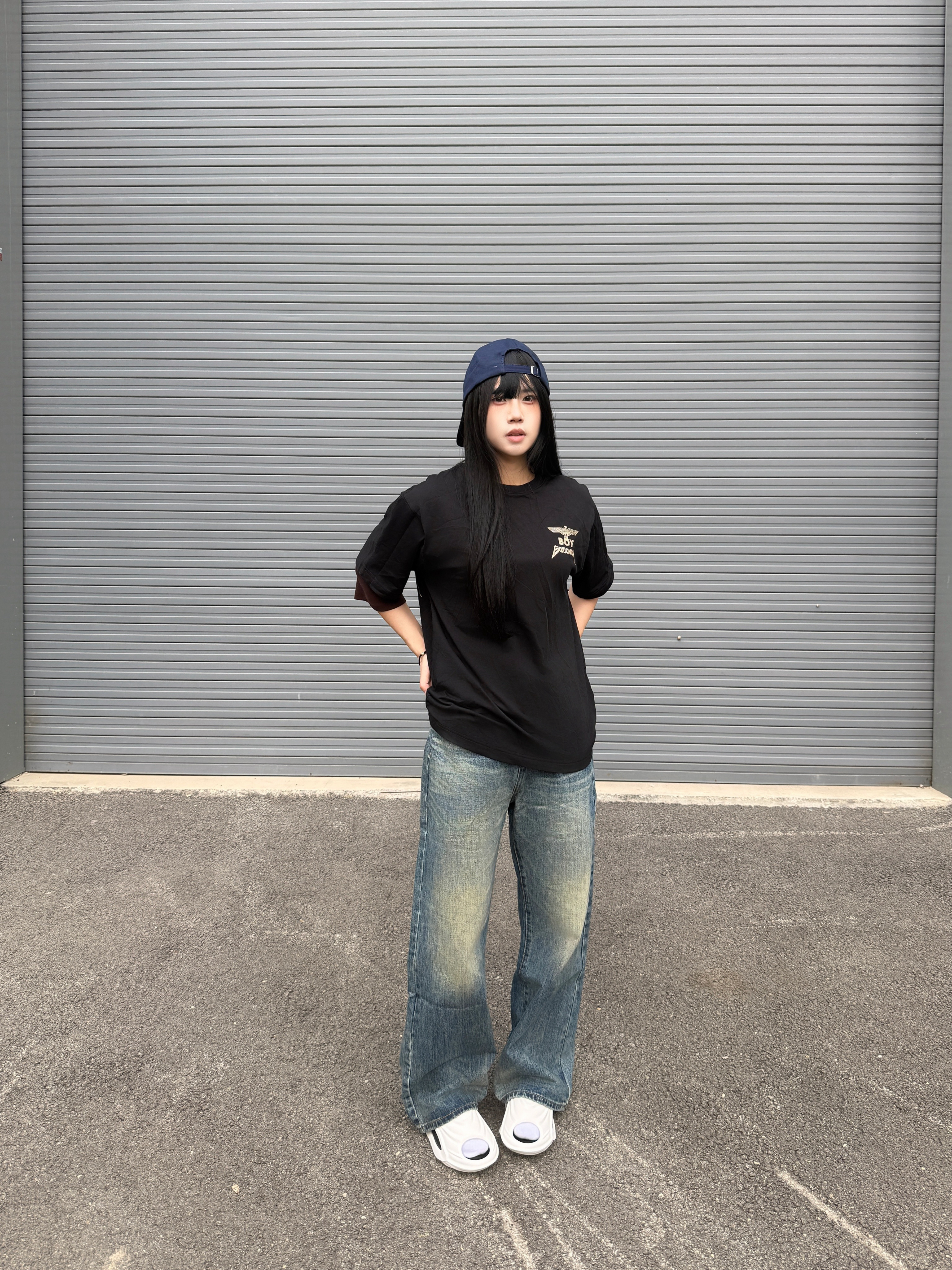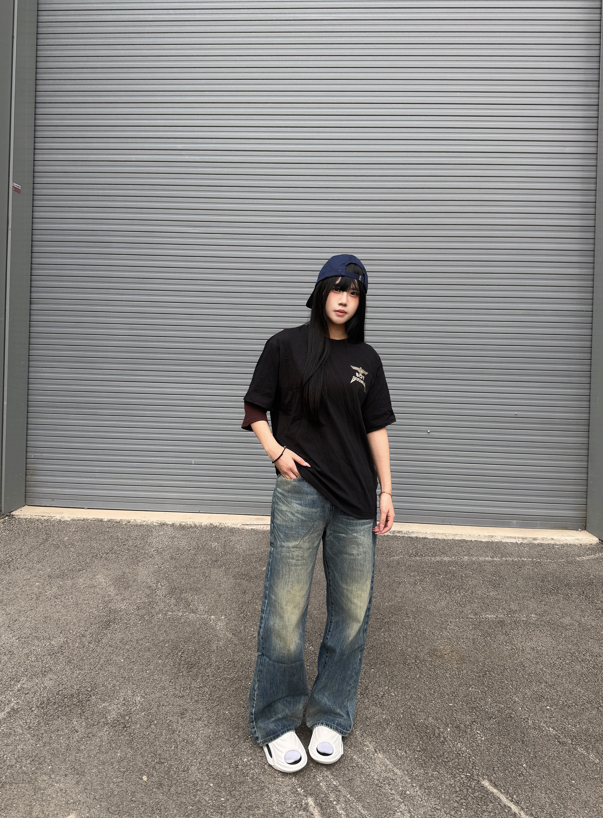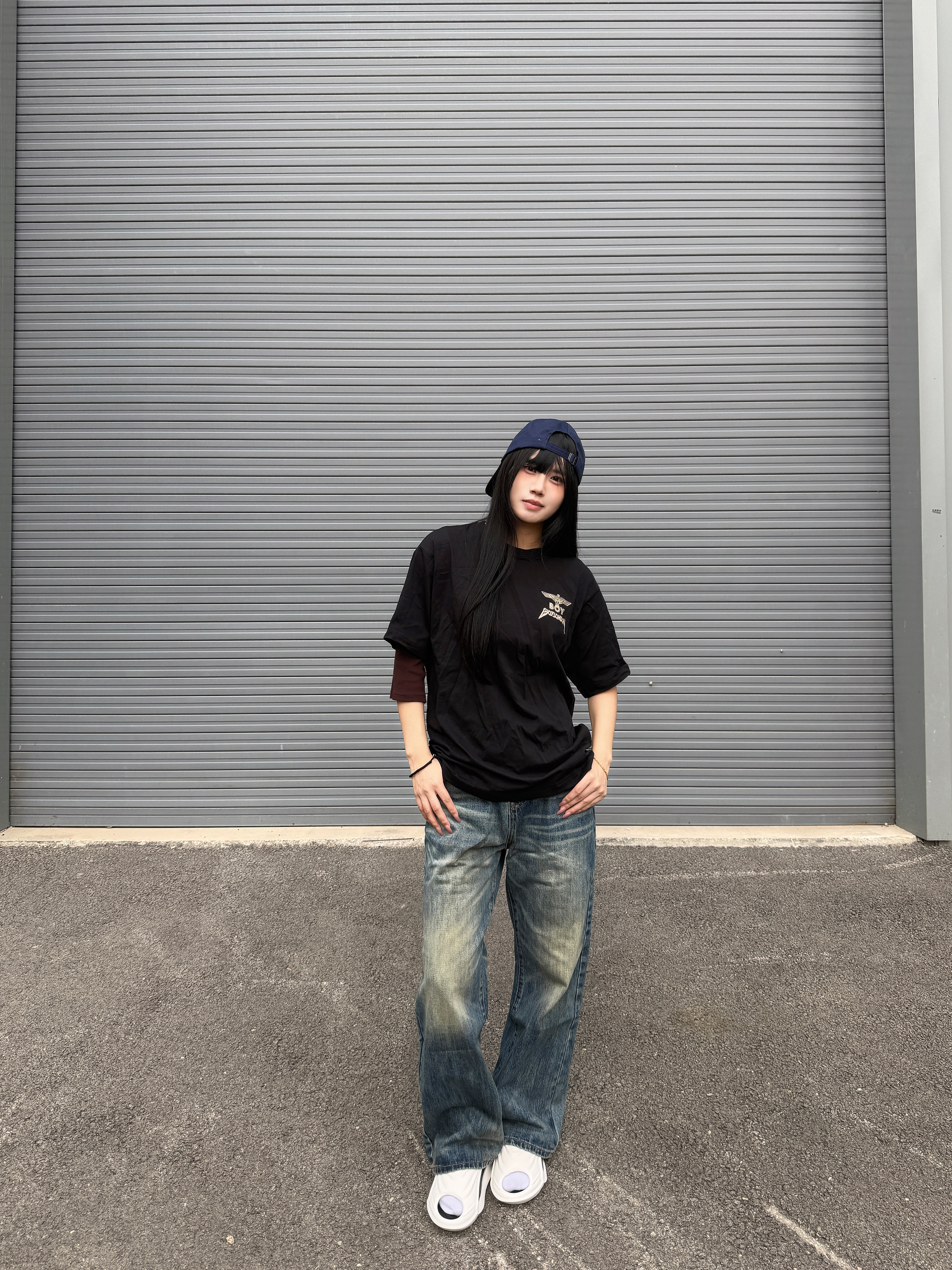 今天分享我的美式氛围感穿搭 黑色T恤搭配美式牛仔裤就很酷 这条裤子的颜色有点复古 而且它的猫须很有设计感 随意搭配也很酷 春日潮人穿搭你学会了吗