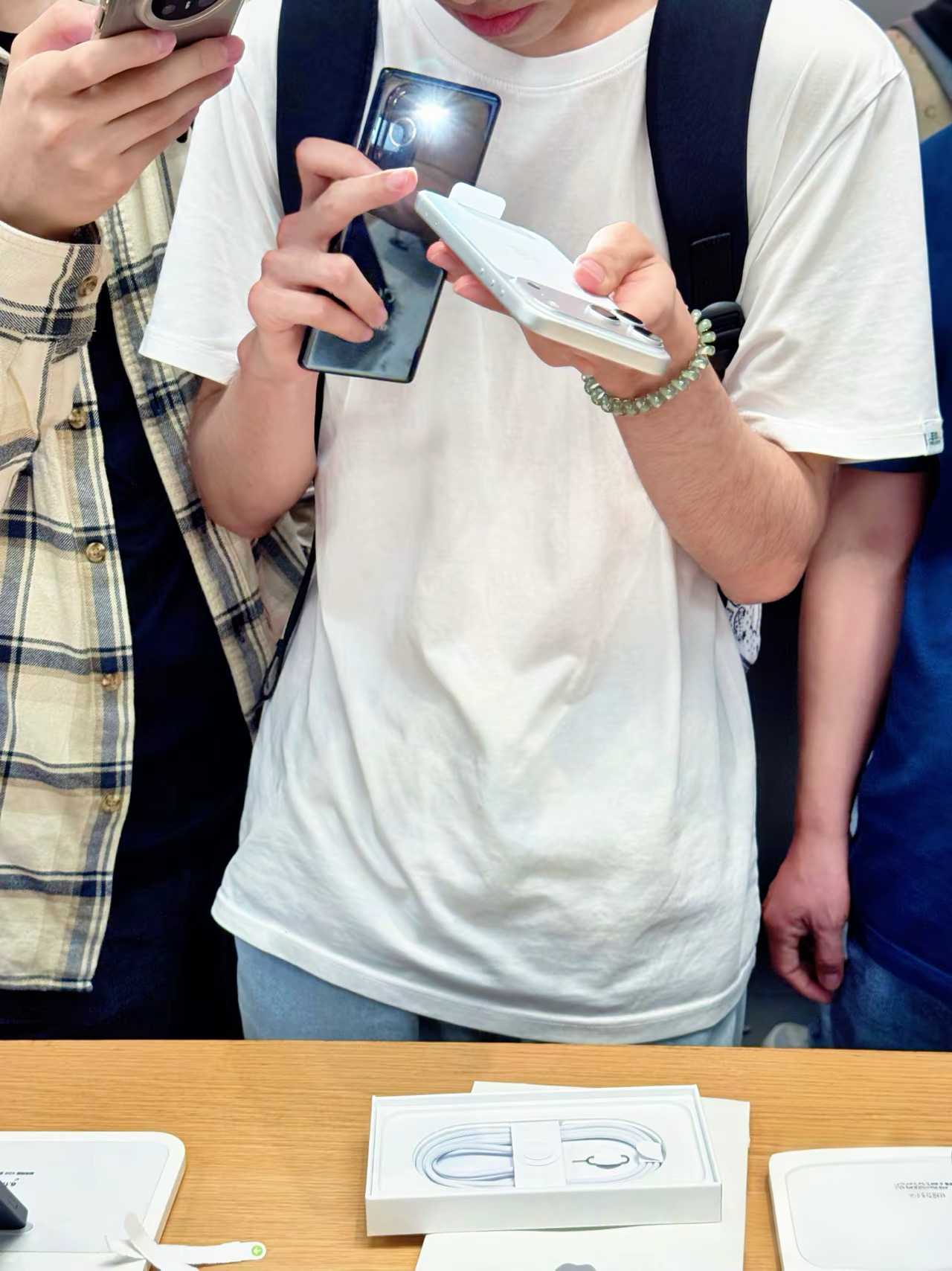 纠结了小半年,朋友最终还是决定入手一台银色 iPhone 17 Pro。 当初嫌星宇橙色太扎眼,转头想冲深蓝色,后面又担心蓝色不耐磨、容易显旧,兜兜转转,最后还是有点无奈地选了银色。 拆盒的那一刻,拿到这台新机才彻底踏实——果然没选错。实物干净充满质感,属于越看越耐看的颜色。 验机的时候还有点小紧张,毕竟这是他的第一部iPhone。几个人凑在补光灯下仔仔细细检查每一处细节,别笑我们太小心,快...
