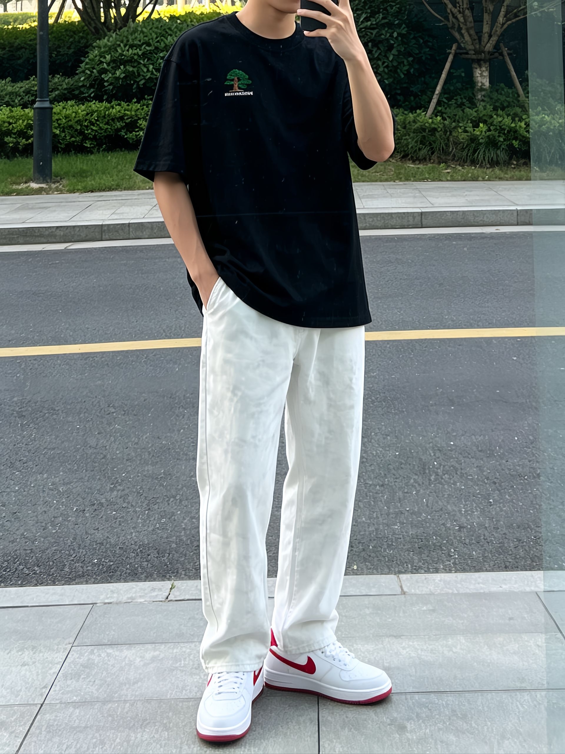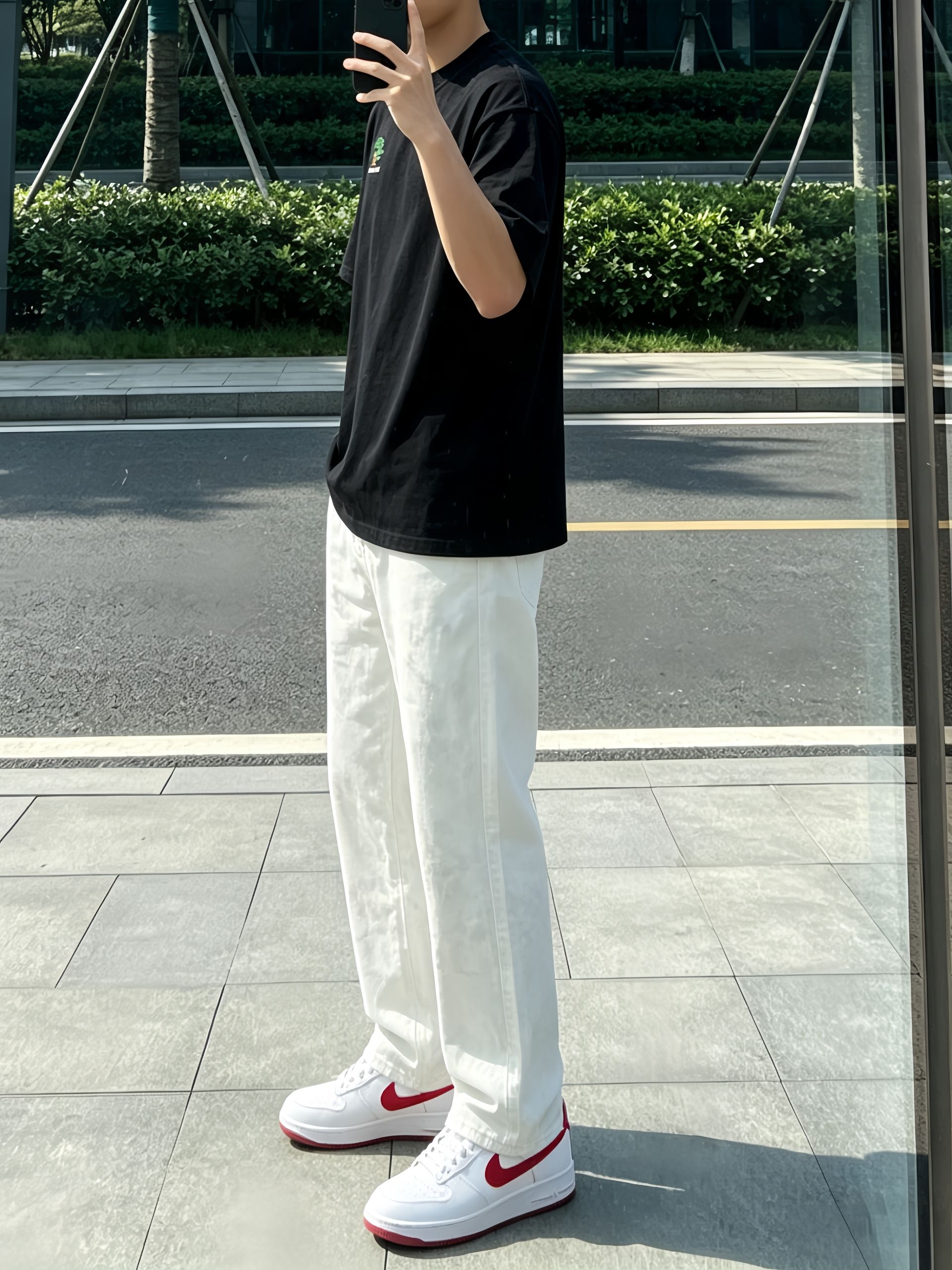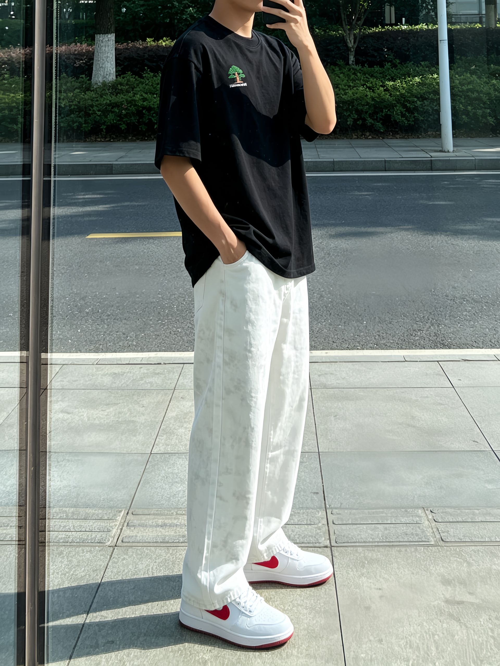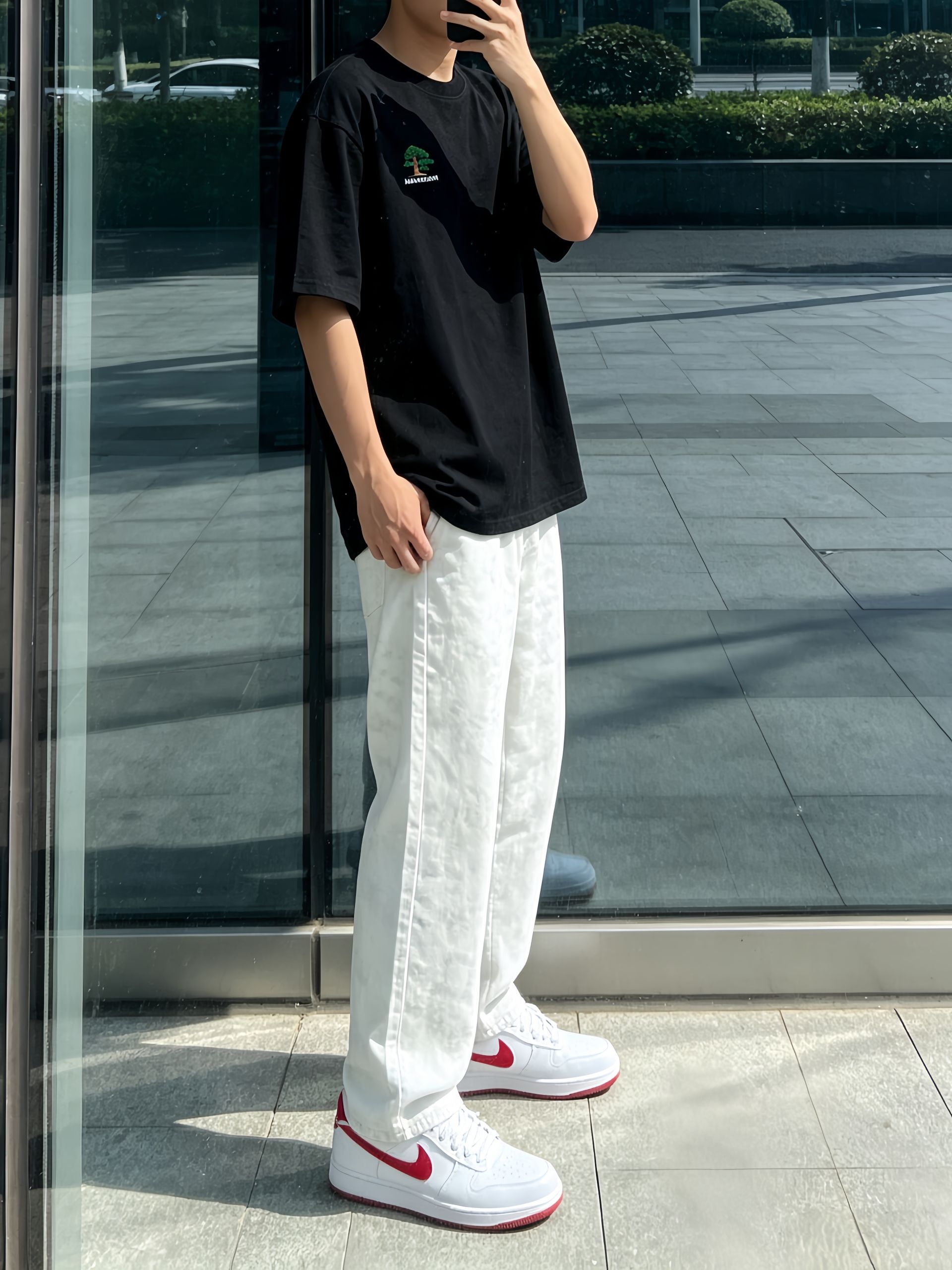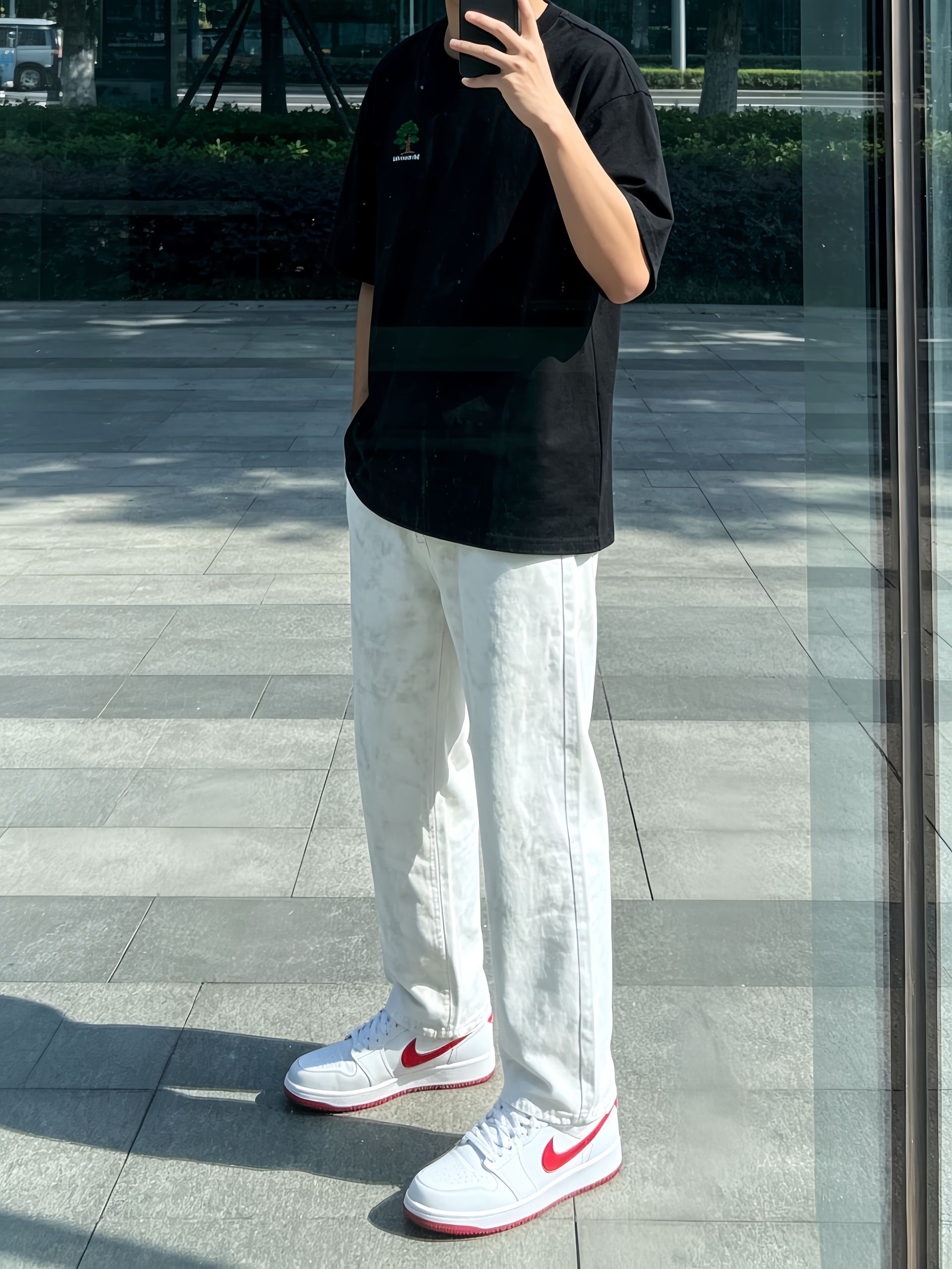 春天穿这套真舒服!骆驼这件纯棉T恤宽松不挑人,领口小绣花挺别致。下身配TEN MIRO白色直筒牛仔裤,水洗做旧很自然,腰围半松紧不用勒皮带。重点夸AJ1白红低帮,透气不闷脚,春天走路带风。整套白红配色清爽,牛仔裤的蓝白扎染纹理和鞋子红色勾子呼应。通勤遛弯都自在,比硬凹造型舒服多了。