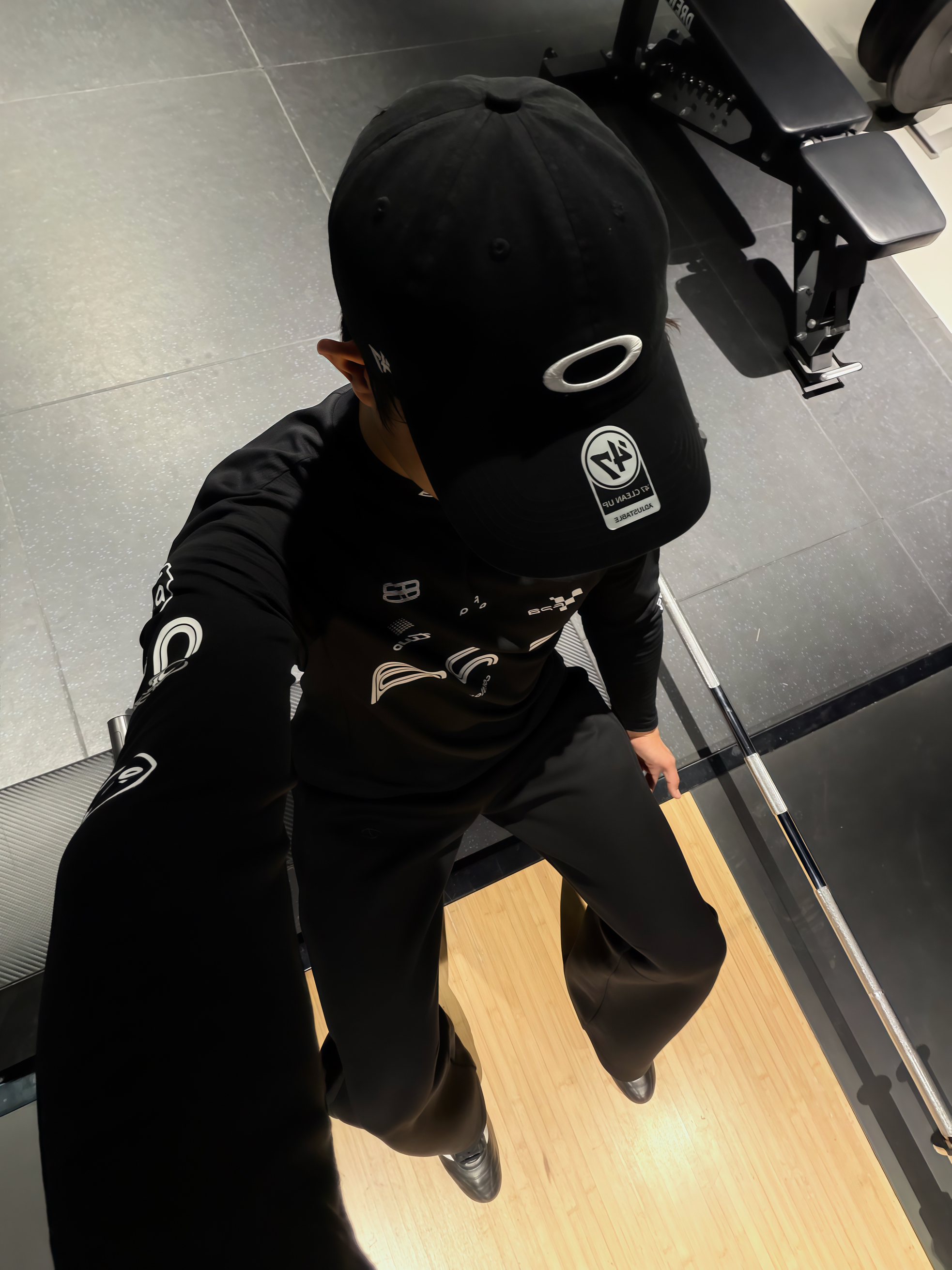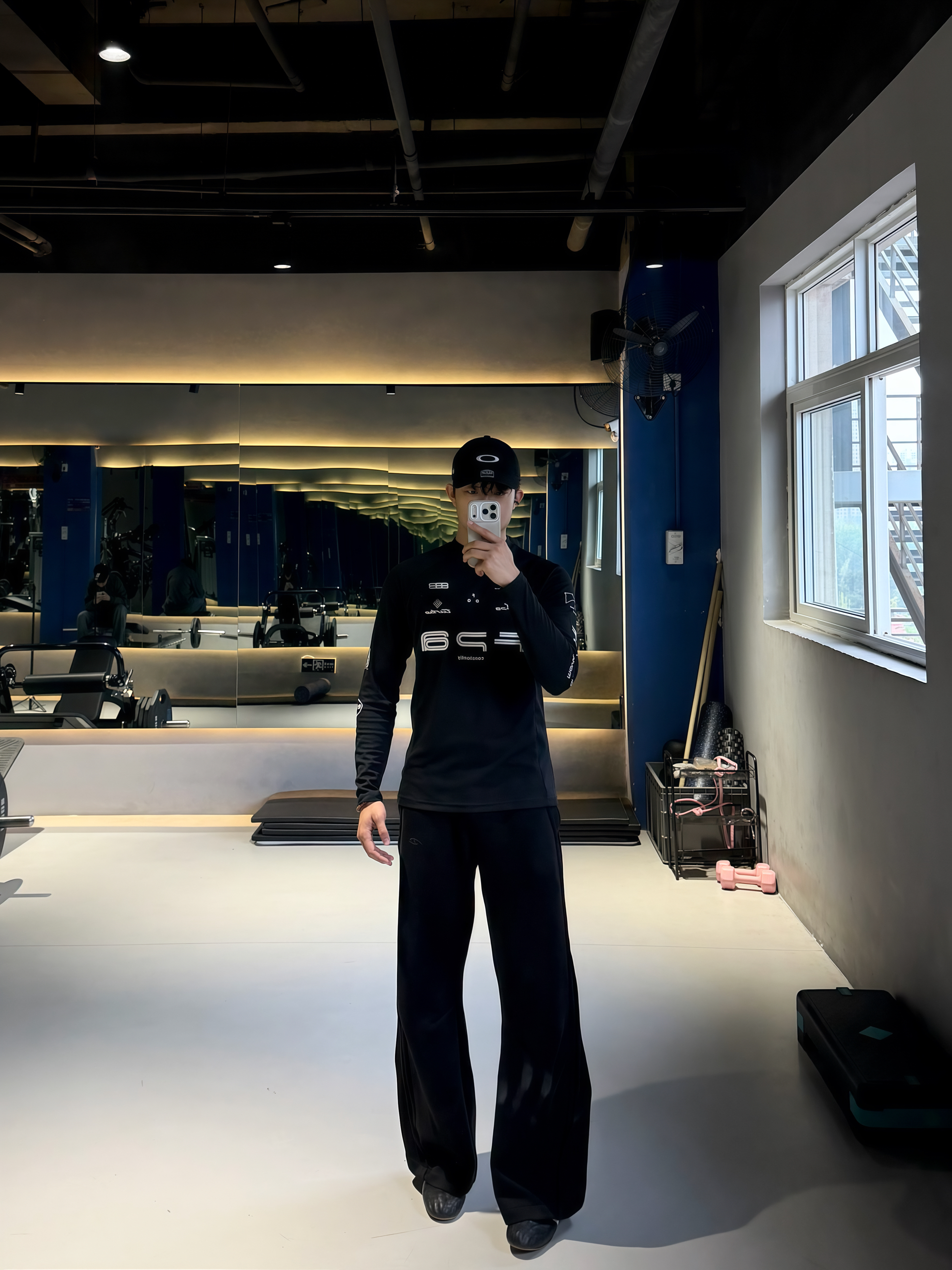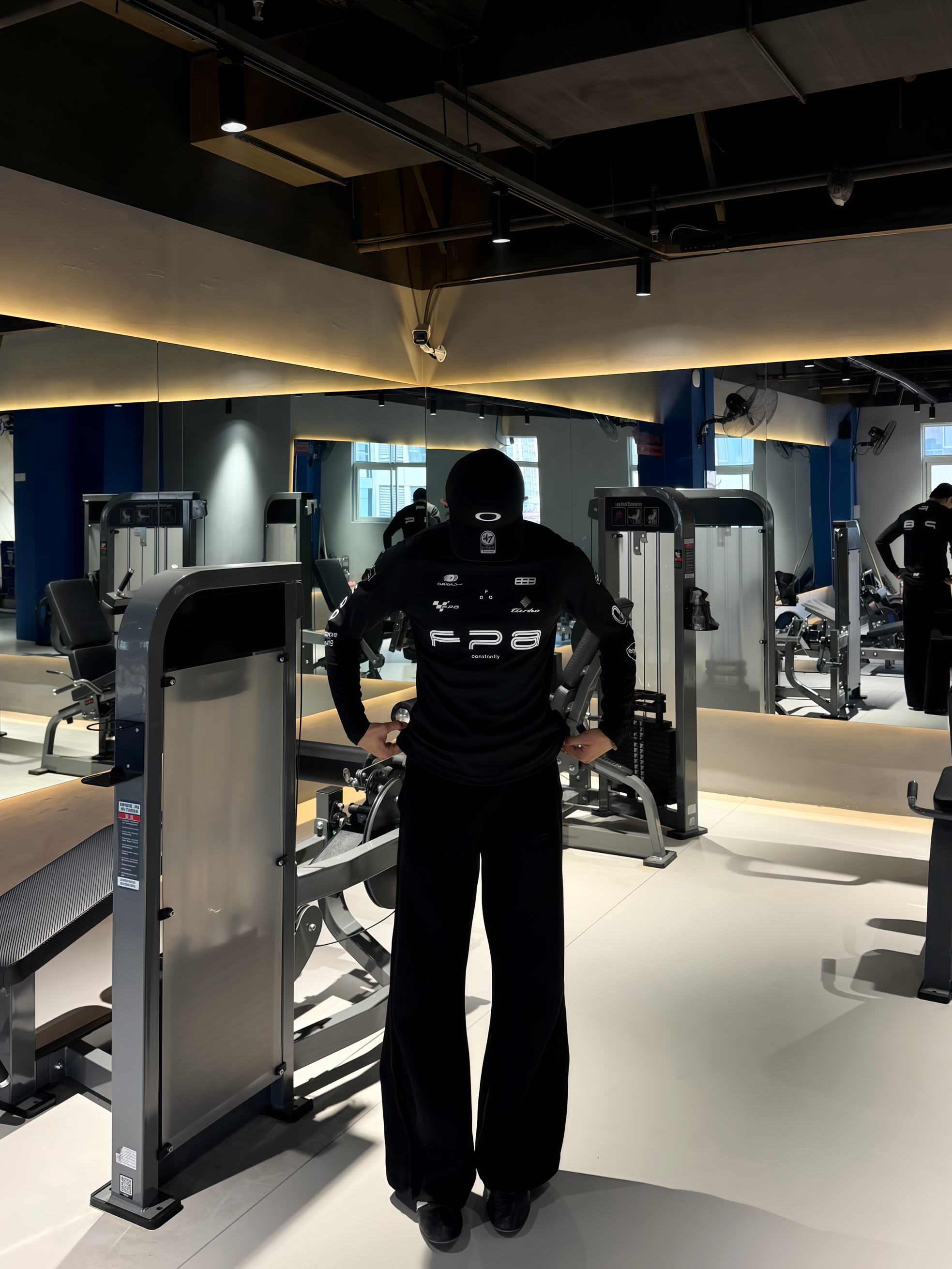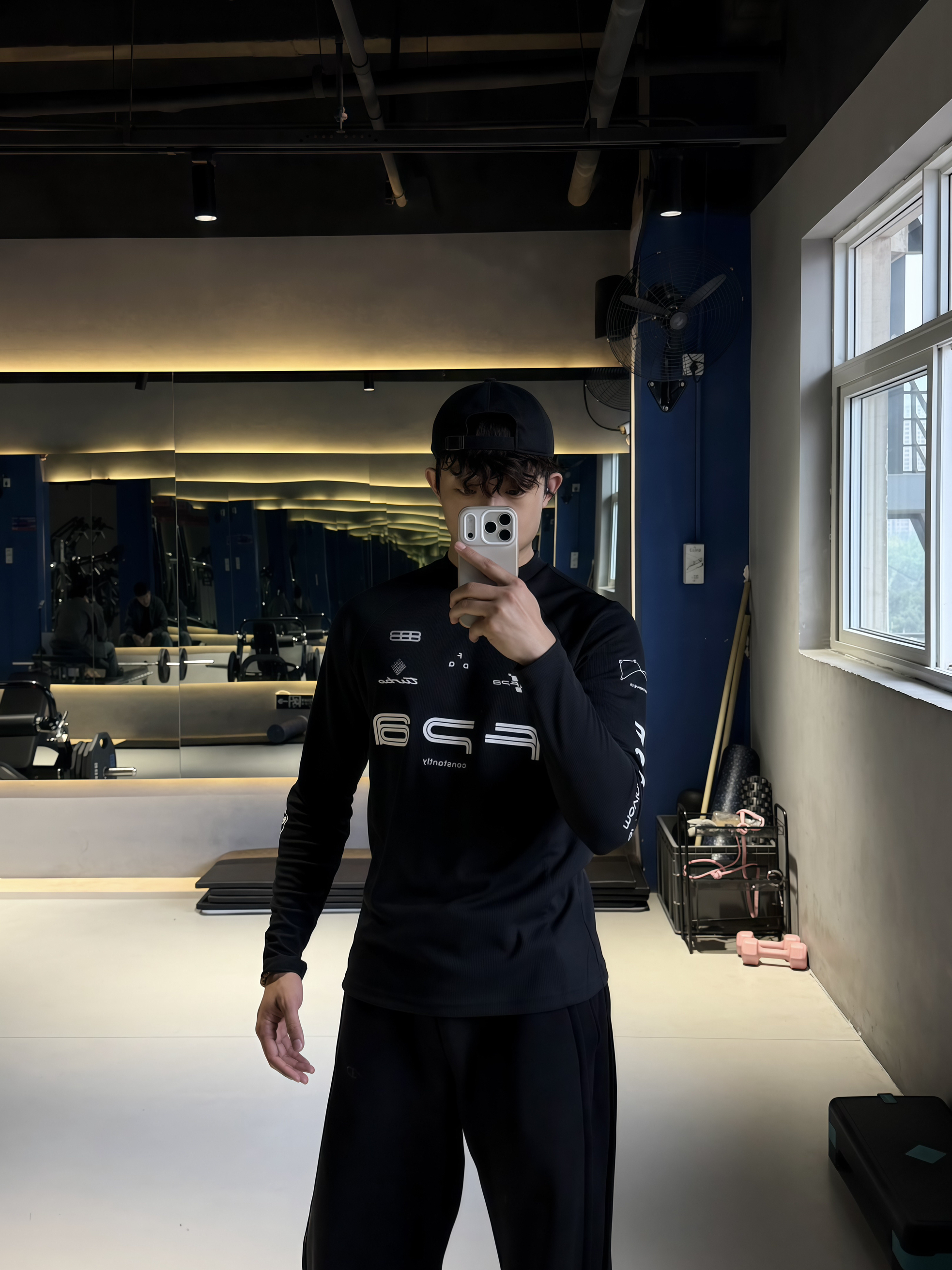 180 140|OOTD穿搭分享 👔FPA这件黑速干长袖真的绝!修身不紧绷,完美包裹练出的肩背线条,速干面料透气不闷汗,印字设计潮感拉满,健身穿超帅。 👖黑色弯刀休闲裤太懂高个子了!垂感拉满,弯刀剪裁修饰腿型,显腿长又不拖沓,日常健身都能穿。