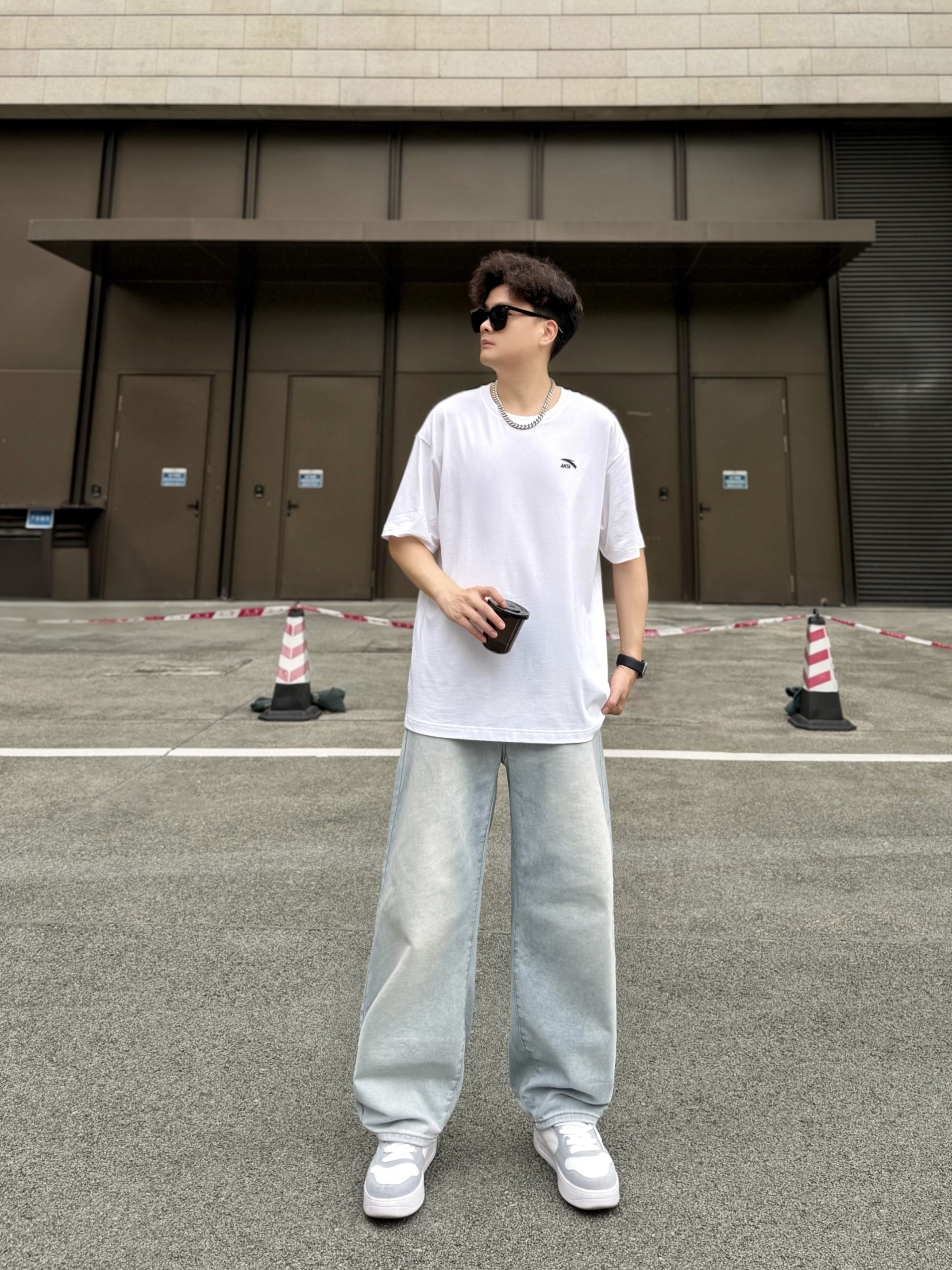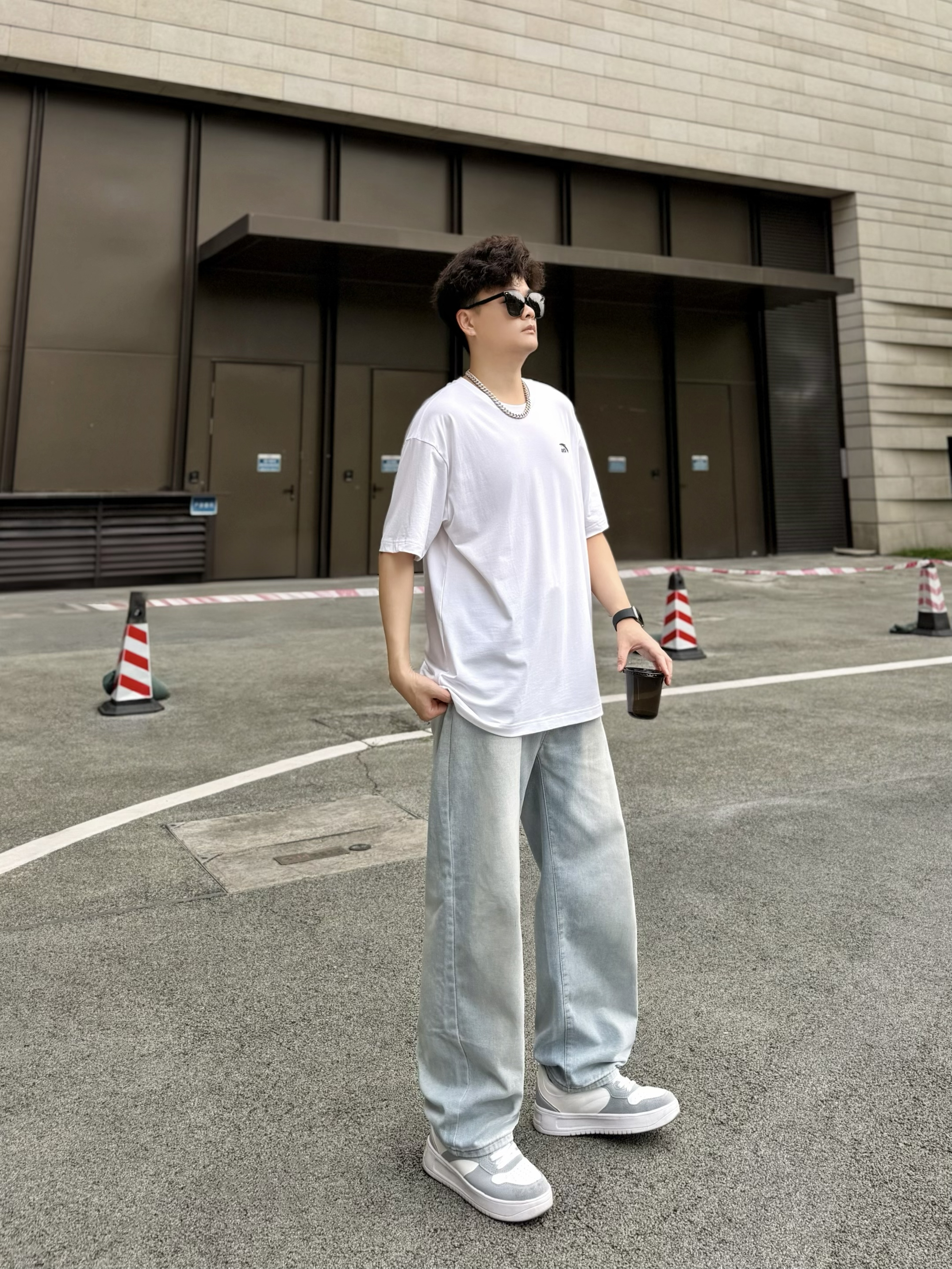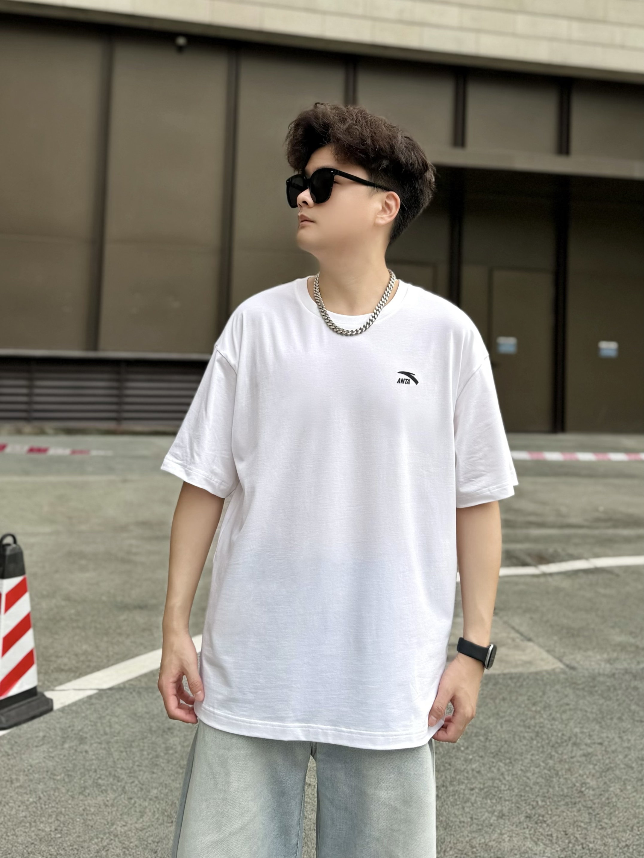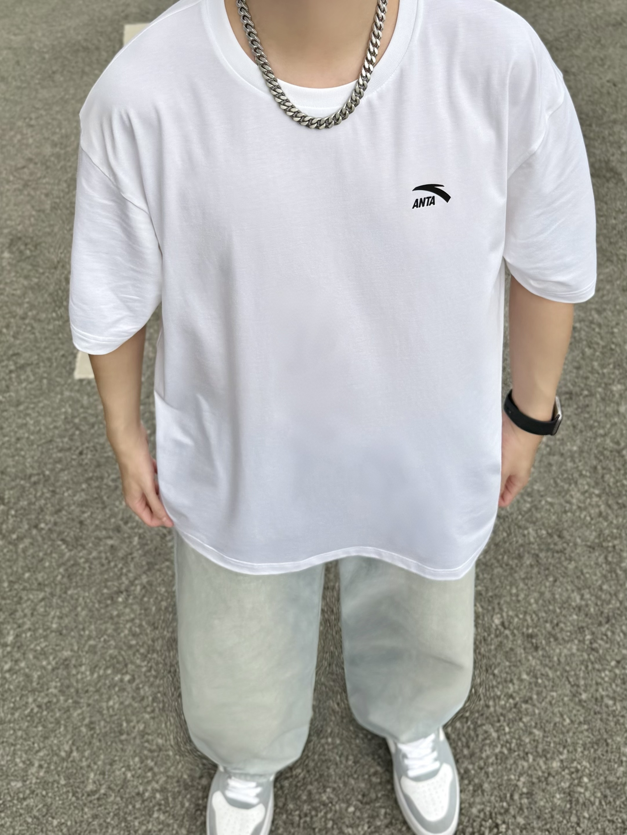 hey,这里是阿b仔 ▪️👕春夏季当然少不了一件基础款白色T恤啦! 简单logo外观,上身简约百搭。 材质薄薄嘟穿着舒服耶,走起路来感觉也很透气。 我身高180cm/体重70kg,穿的2XL码数刚刚好。 是我喜欢的oversize感觉,爱了爱了。 ▪️👖搭配浅蓝色牛仔裤和👟白灰色板鞋! 白色+浅蓝色+白灰色okk,小清新既视感nice。 街头风get,少年感满满。 ▪️💡穿搭小tips! 选择银色...