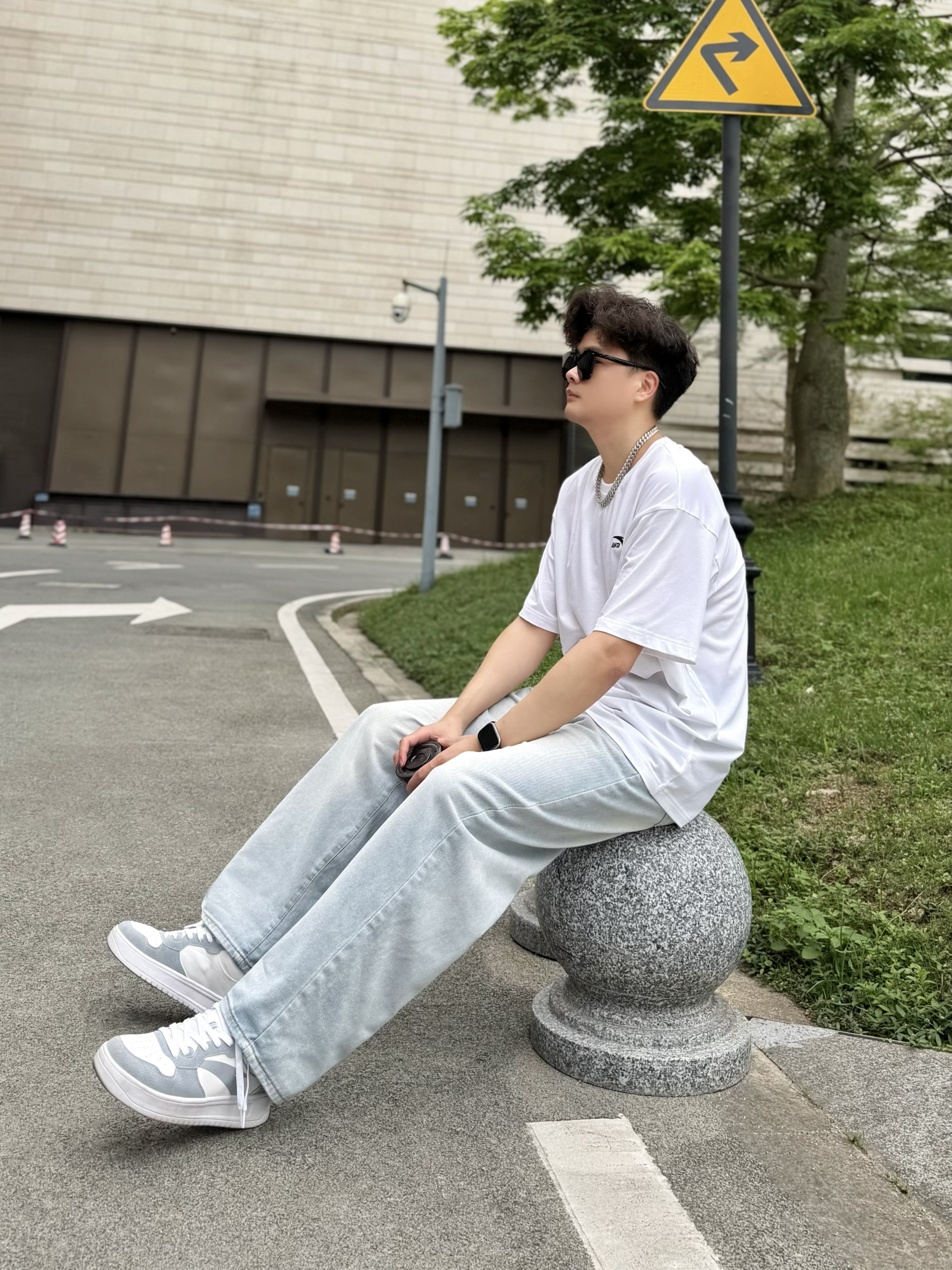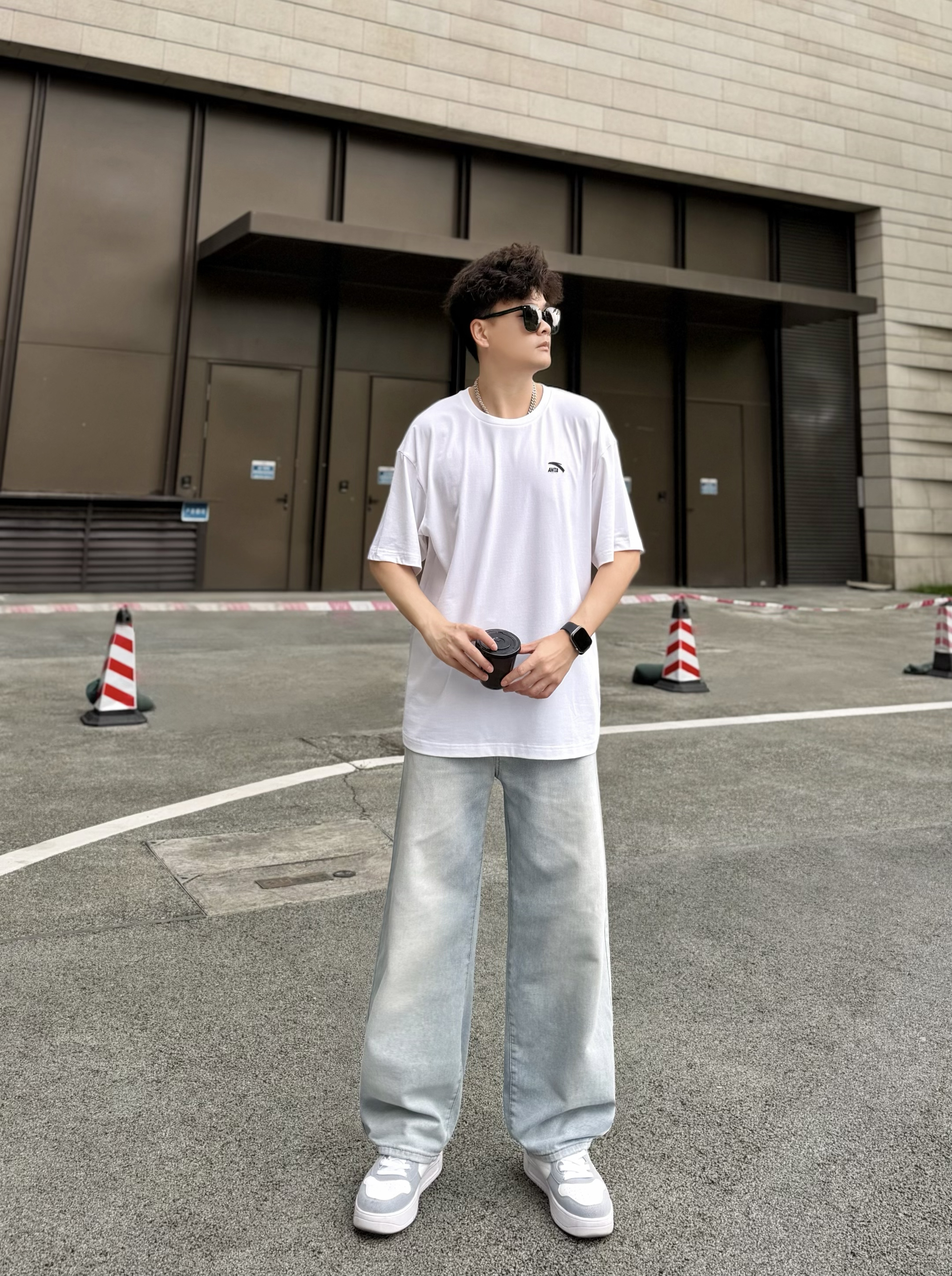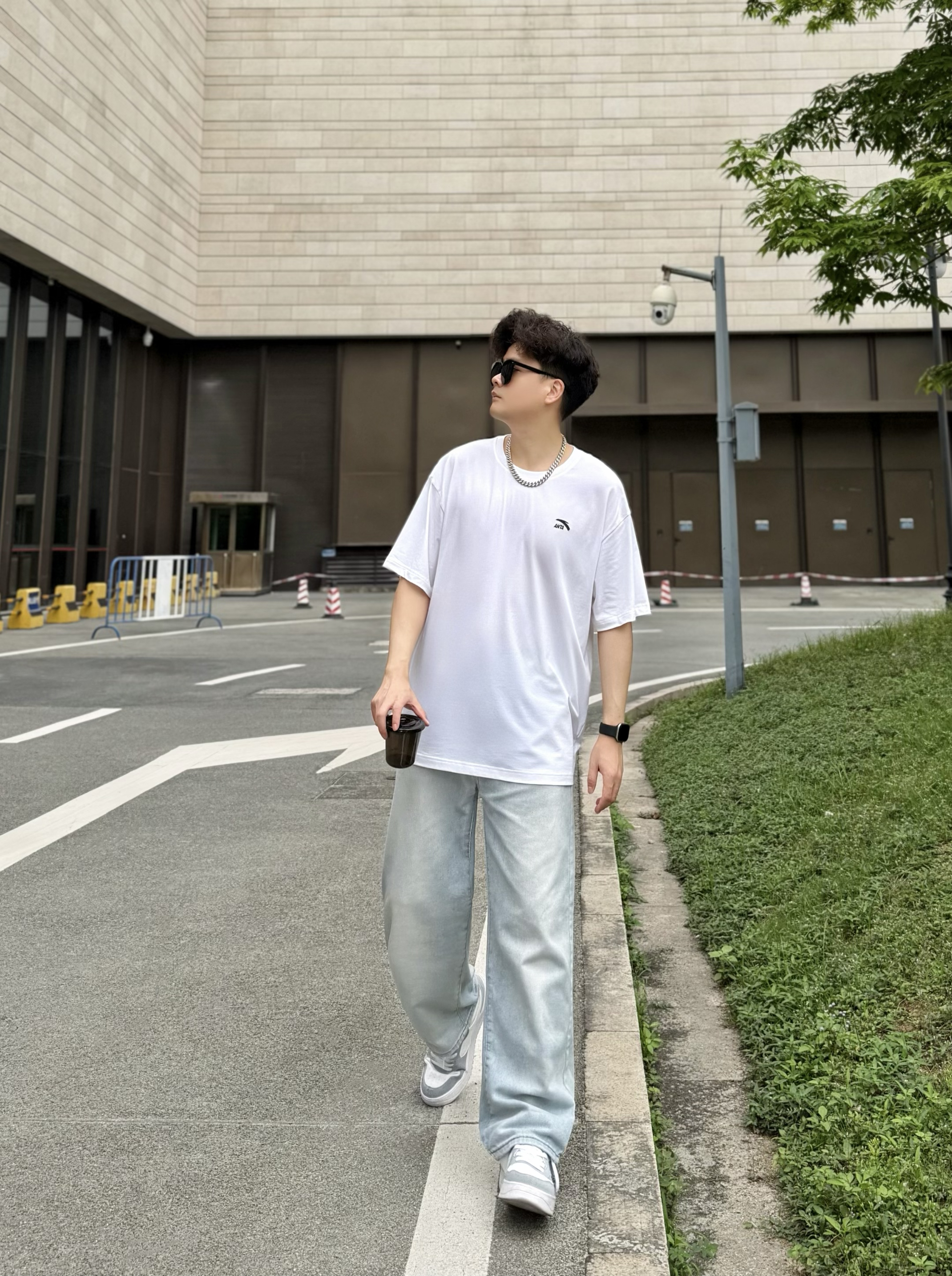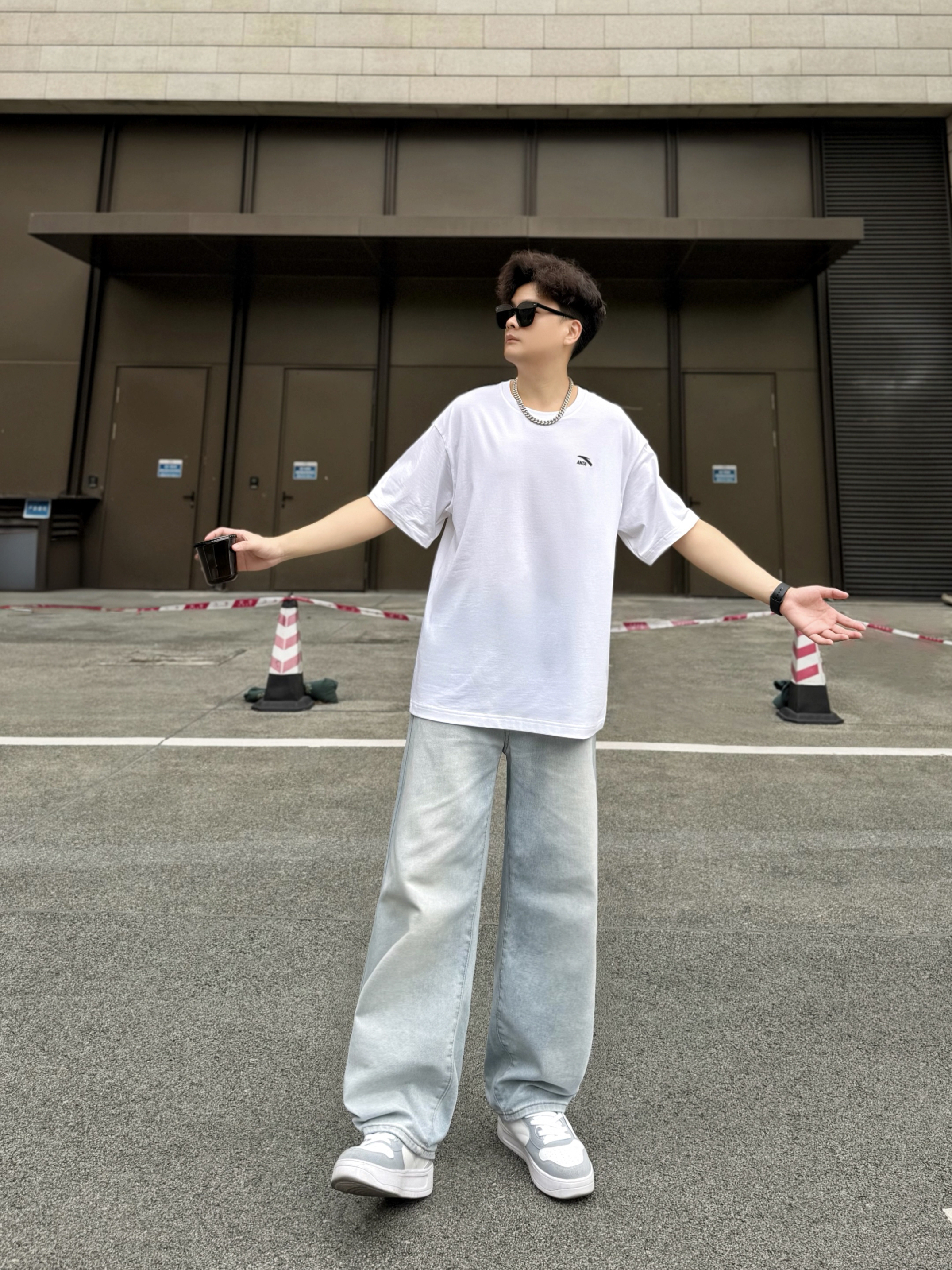 hey,这里是阿b仔 ▪️👕春夏季当然少不了一件基础款白色T恤啦! 简单logo外观,上身简约百搭。 材质薄薄嘟穿着舒服耶,走起路来感觉也很透气。 我身高180cm/体重70kg,穿的2XL码数刚刚好。 是我喜欢的oversize感觉,爱了爱了。 ▪️👖搭配浅蓝色牛仔裤和👟白灰色板鞋! 白色+浅蓝色+白灰色okk,小清新既视感nice。 街头风get,少年感满满。 ▪️💡穿搭小tips! 选择银色...