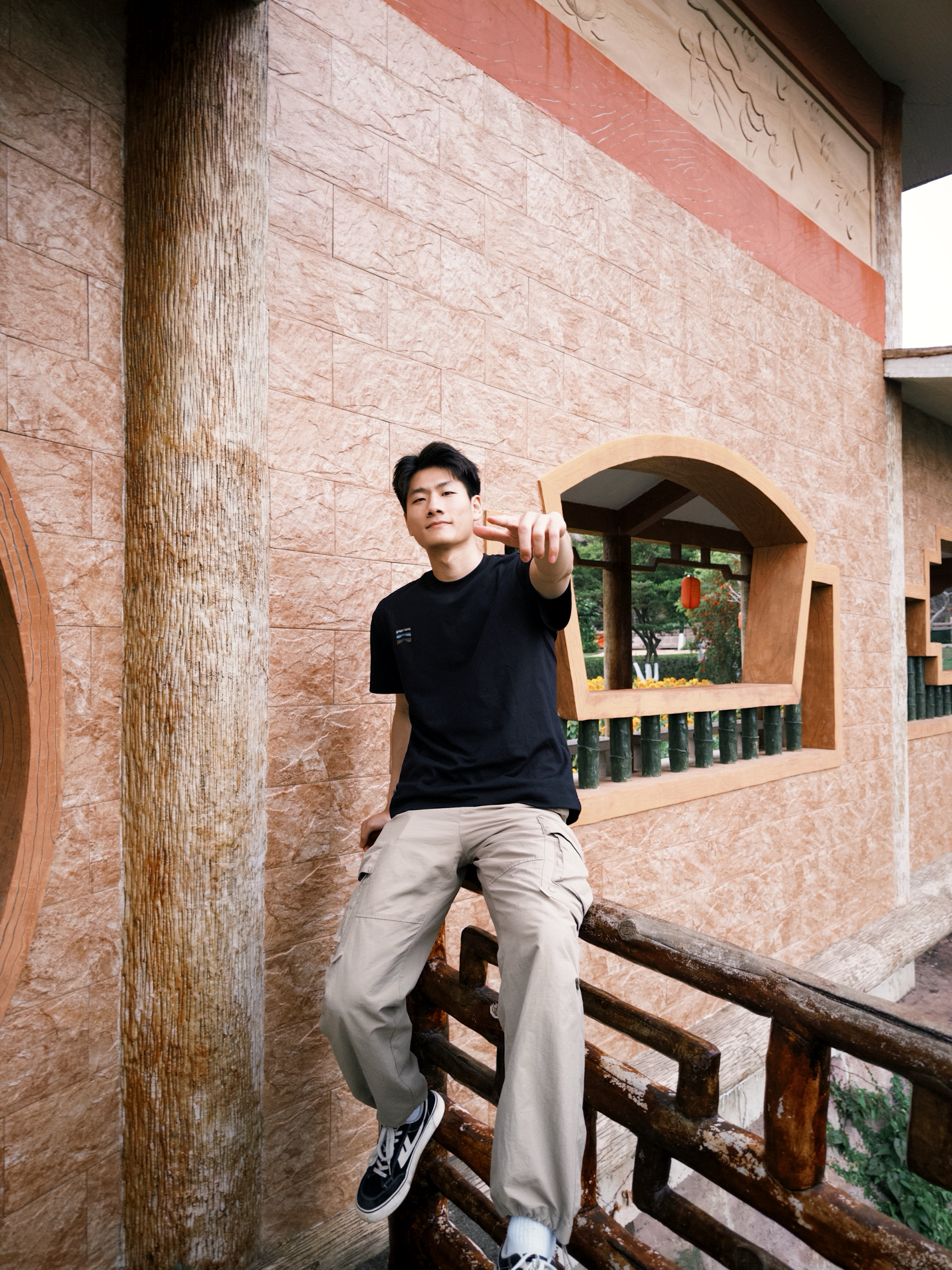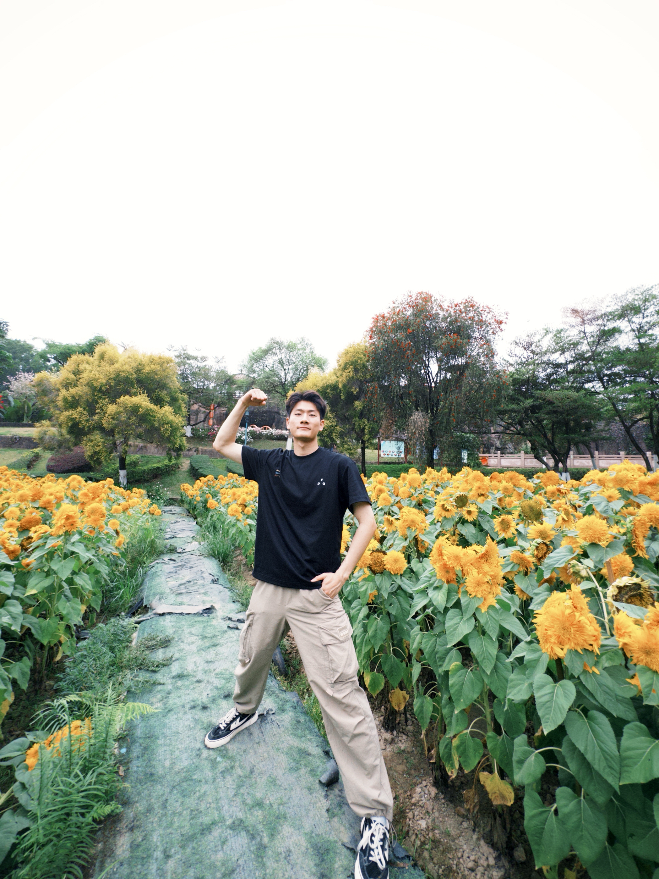 黑T+卡其裤,阳光感拉满! 跑进向日葵花海里,必须穿这套!黑T简简单单,特别显精神,面料透气不闷汗。卡其工装裤一搭,走路逛园子完全没束缚,和花海背景超配,拍照氛围感直接拉满,舒服又出片