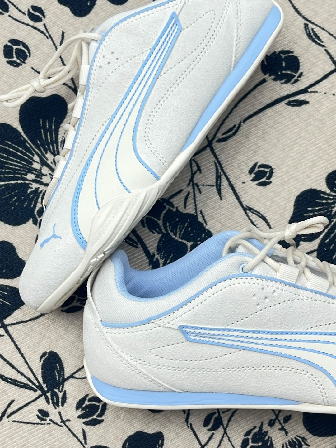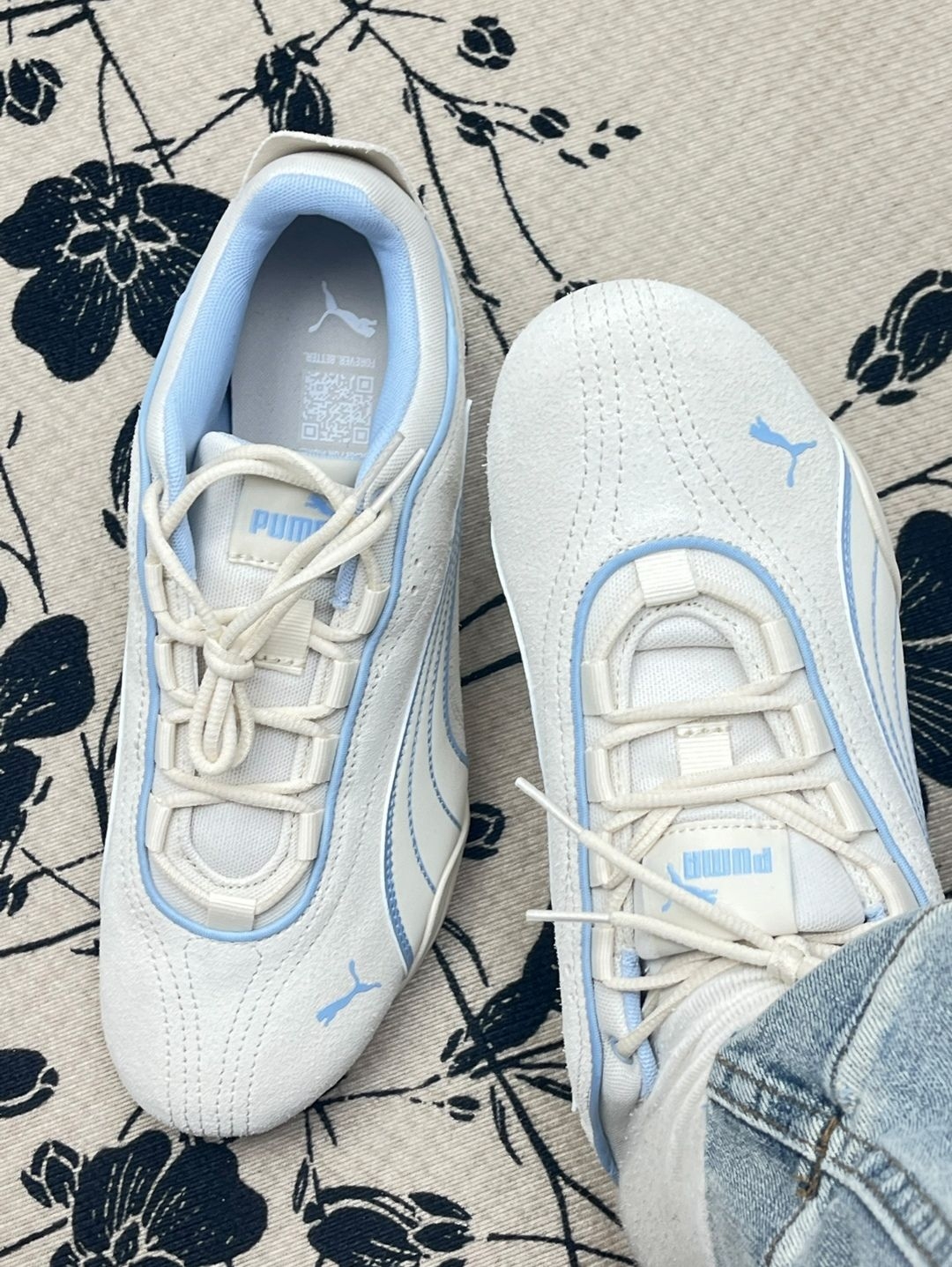 这双奶白拼浅蓝的彪马鞋,是最近穿得最多的一双👟。 翻毛皮的质感摸起来软乎乎的,颜色也很温柔,配牛仔裤、运动裤都不挑。鞋型偏修长,上脚显得脚很秀气,日常走路、逛超市都挺舒服,鞋底软硬度刚好,不会像板鞋那样硬邦邦