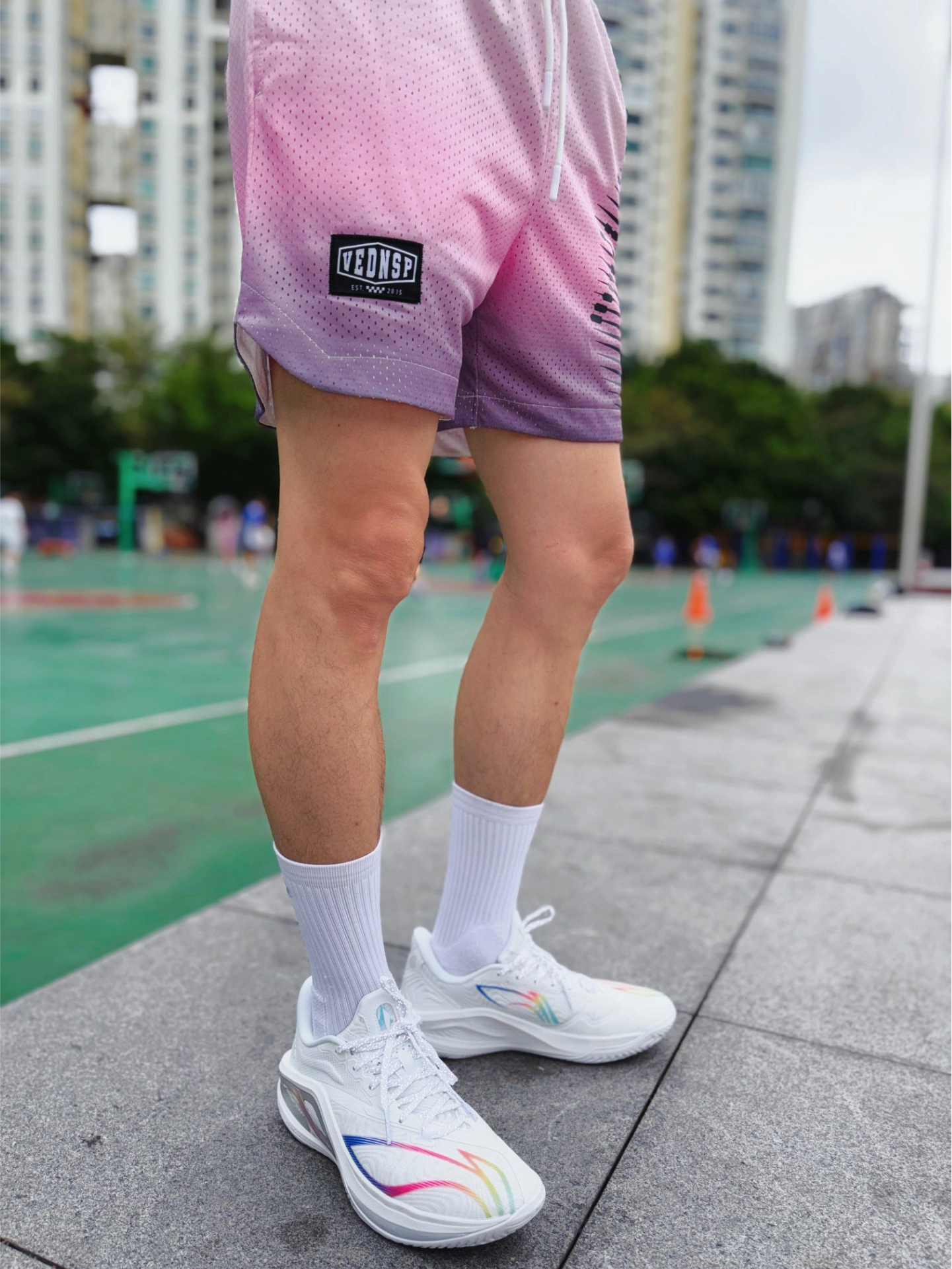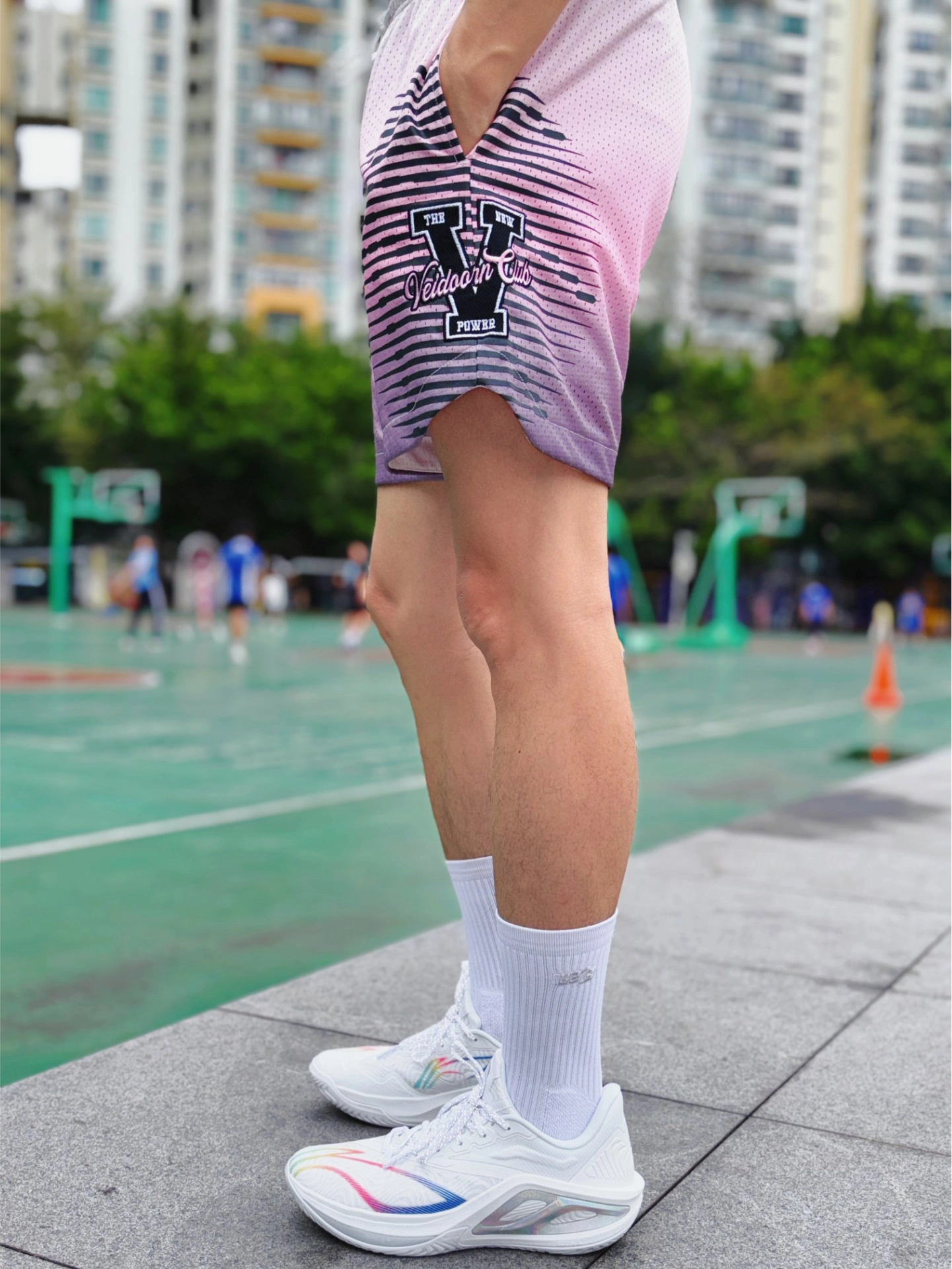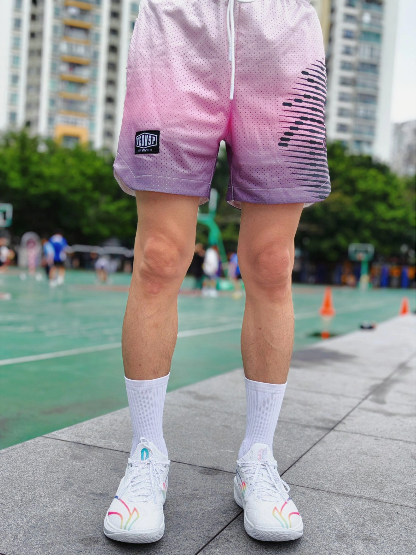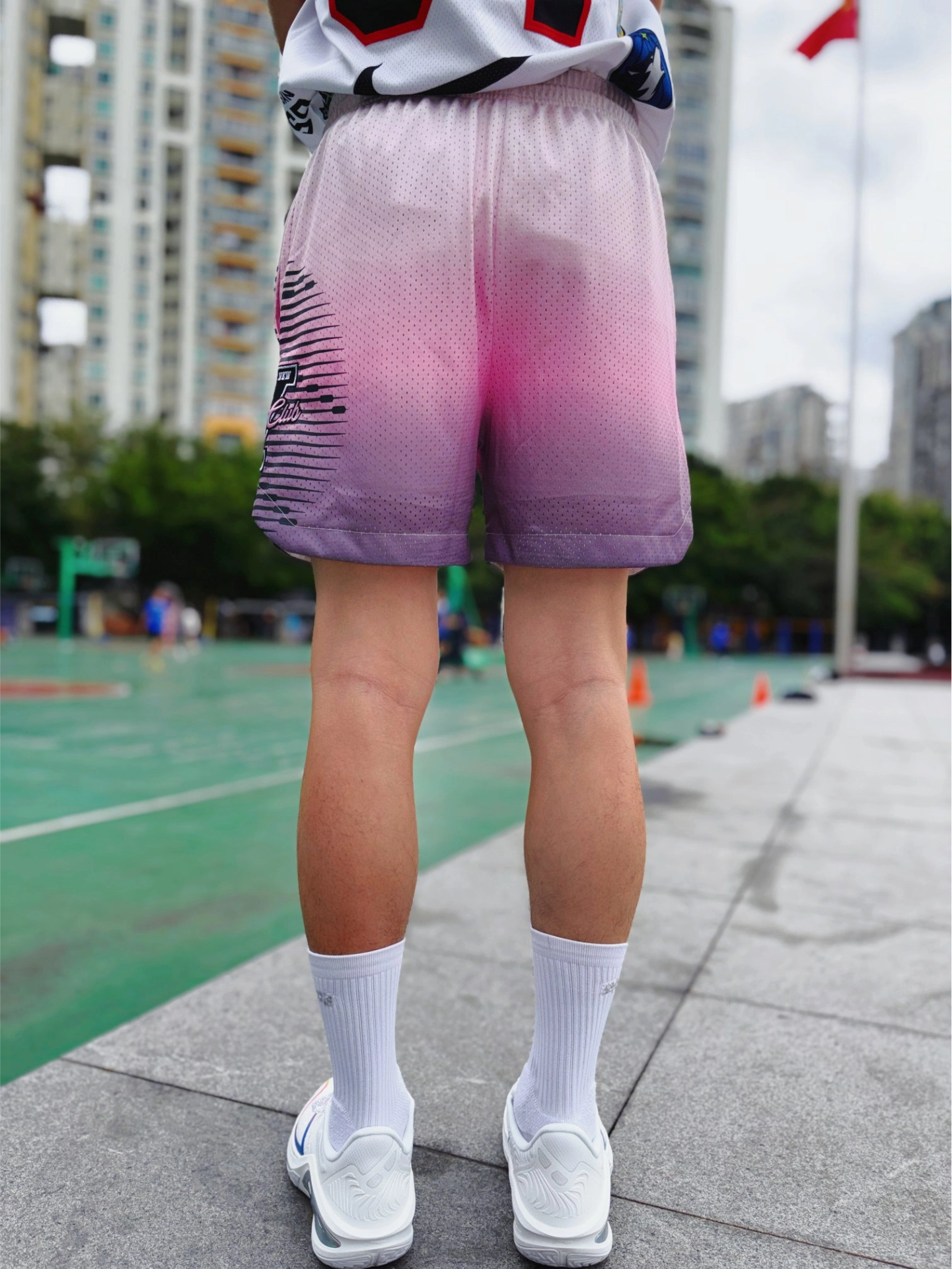 175cm/65kg,入的M码,上身宽松不卡裆,长度刚好到大腿中部,打球、日常穿都合适。 这条双层网眼面料真的太懂夏天了!粉灰渐变晕染的设计,美式复古感拉满,上身颜值在线。网眼布透气到离谱,打球跑全场、夜跑几公里,风直接从裤腿灌进来,完全不闷汗不粘腿,出汗后也能快速干爽,告别黏腻尴尬。 抽绳松紧腰设计,贴合不勒肚子,运动时不会下滑;侧边弧形剪裁不卡膝盖,变向、跳跃完全无束缚。不管是球场实战、日...
