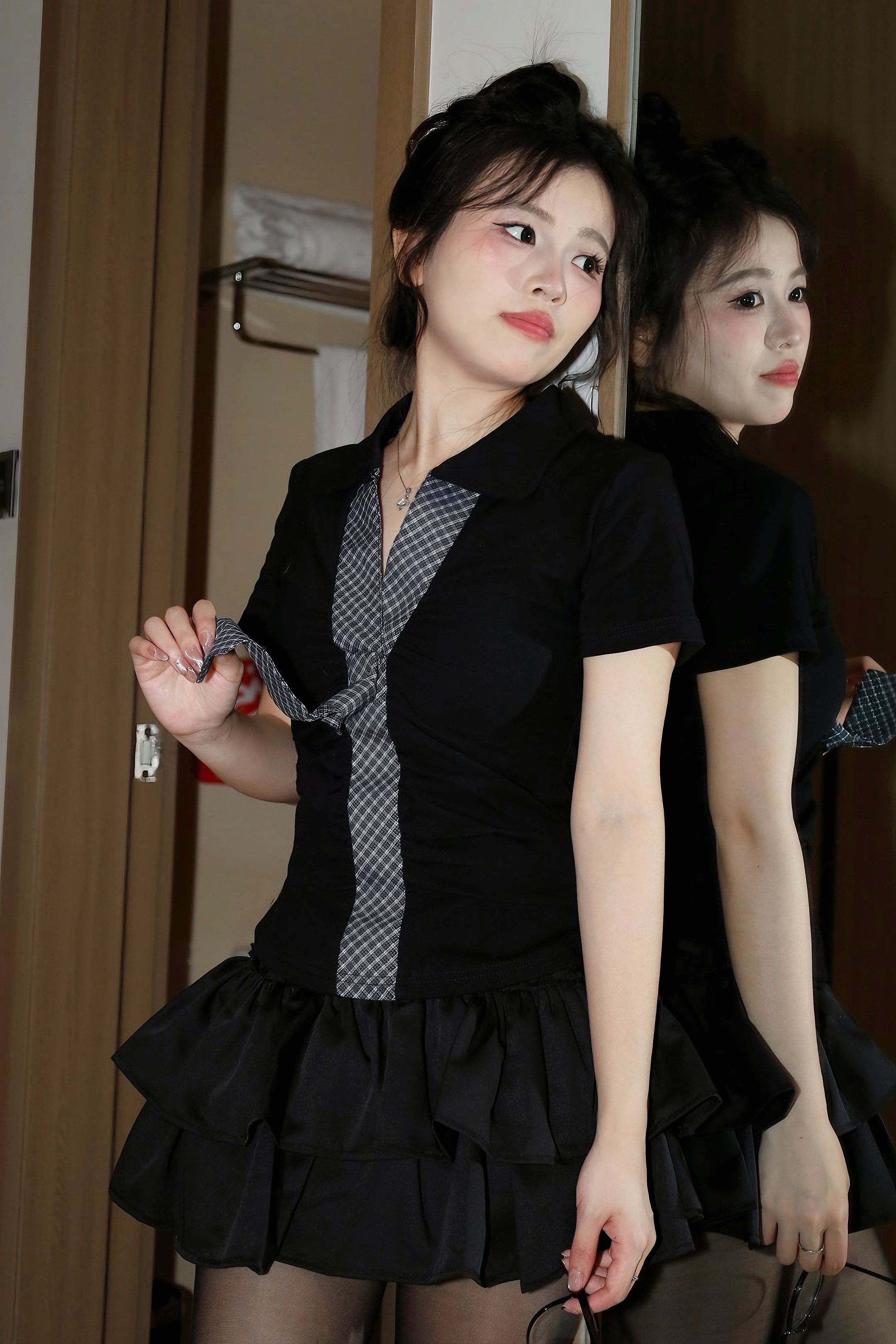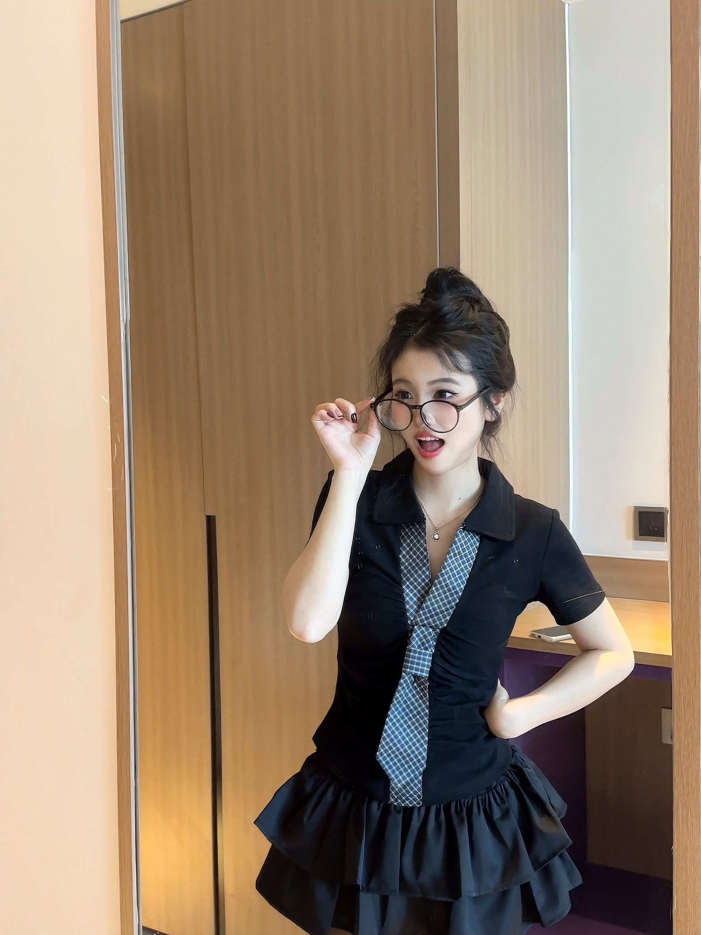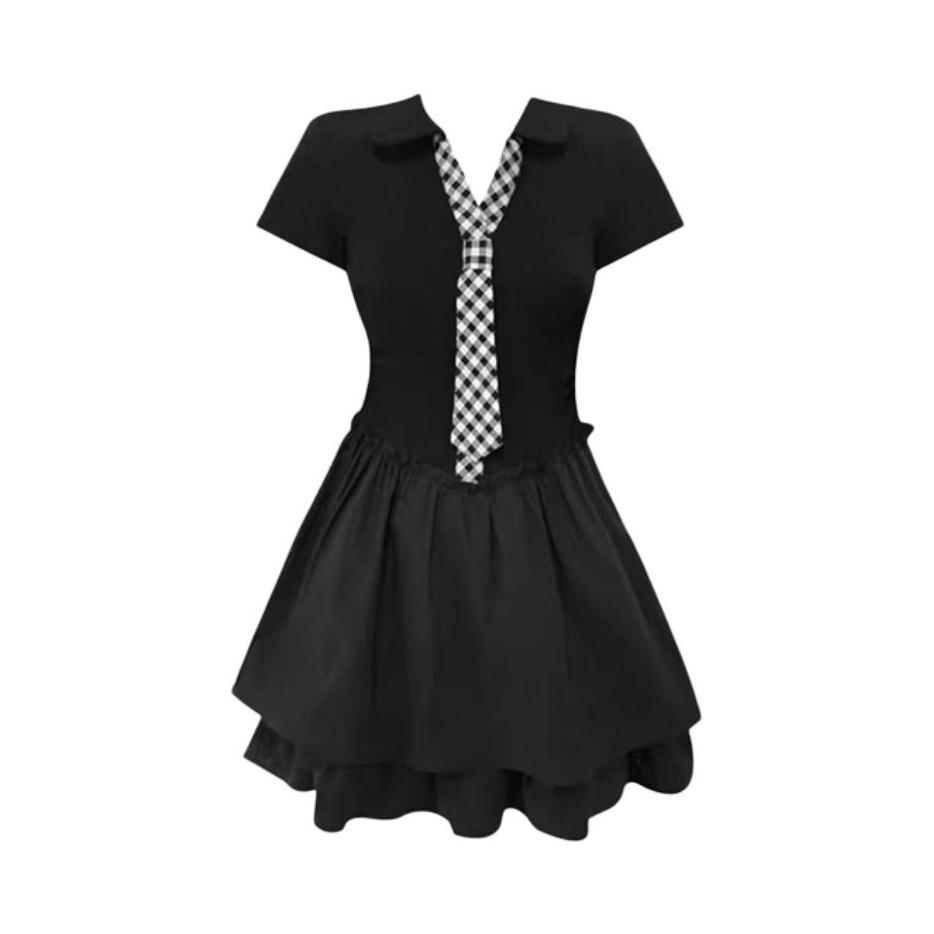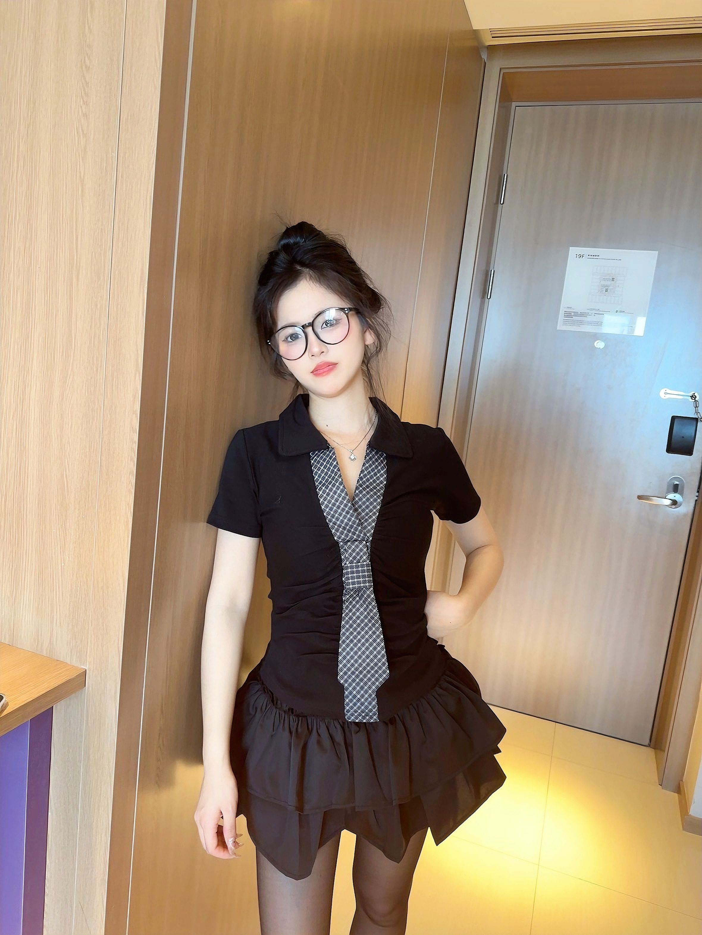 谁懂啊! 这套黑裙真的把甜辣感焊在身上了! polo领+格纹领带自带学院感 衣服两侧收腰设计展现线条美 双层蛋糕裙蓬蓬的超喜欢 甜酷感直接拉满 眼镜一戴秒变纯欲学姐! 约会穿不需要犹豫,超出拍的一套衣服 你们觉得如何,评论区留下你的想法吧