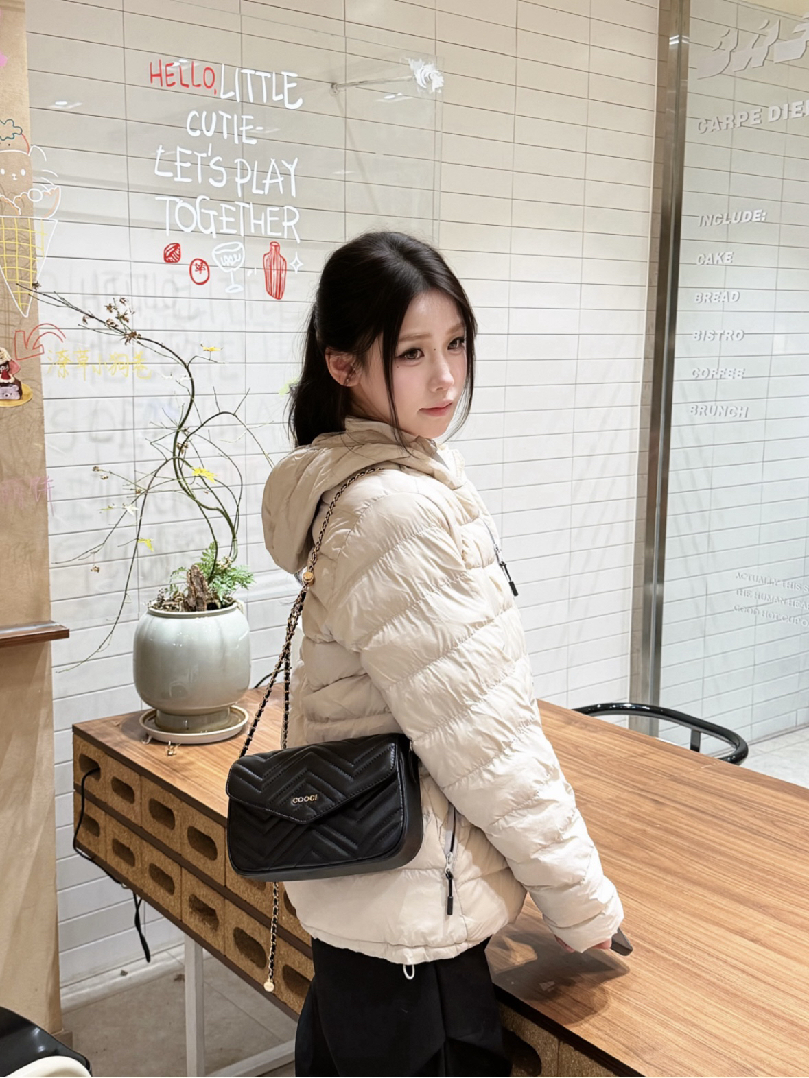 👜: COOGI 🧍♀️:161cm 42kg COOGI这款菱格链条包真的长在我的审美上啦🥹 羊皮革摸起来软软糯糯 质感超绝🐑 经典小香风菱格纹 简约又显气质💫 信封包版型干净利落 日常背也超耐看☁️