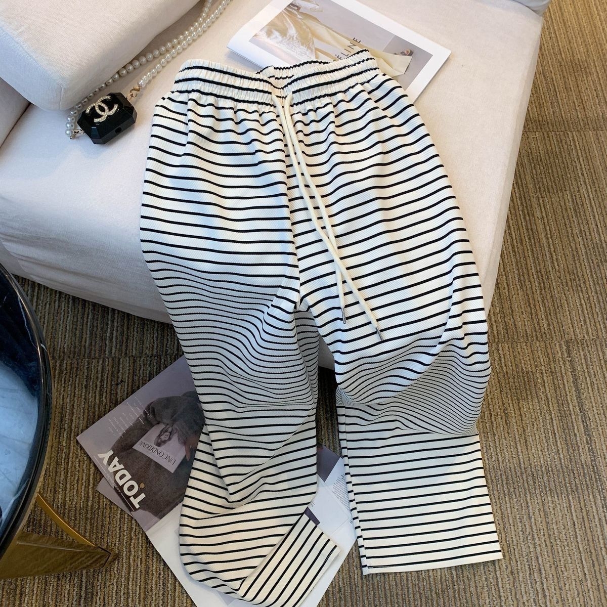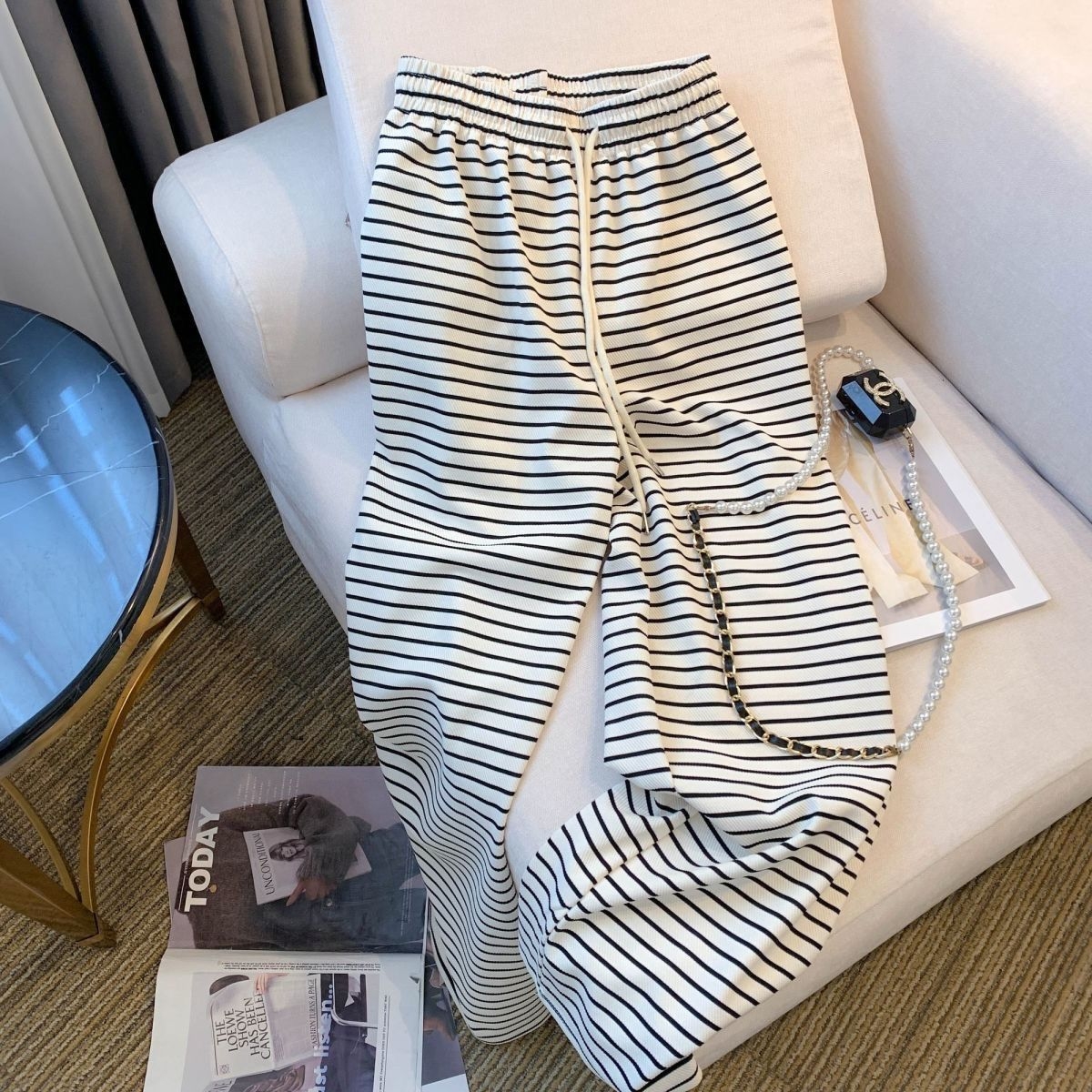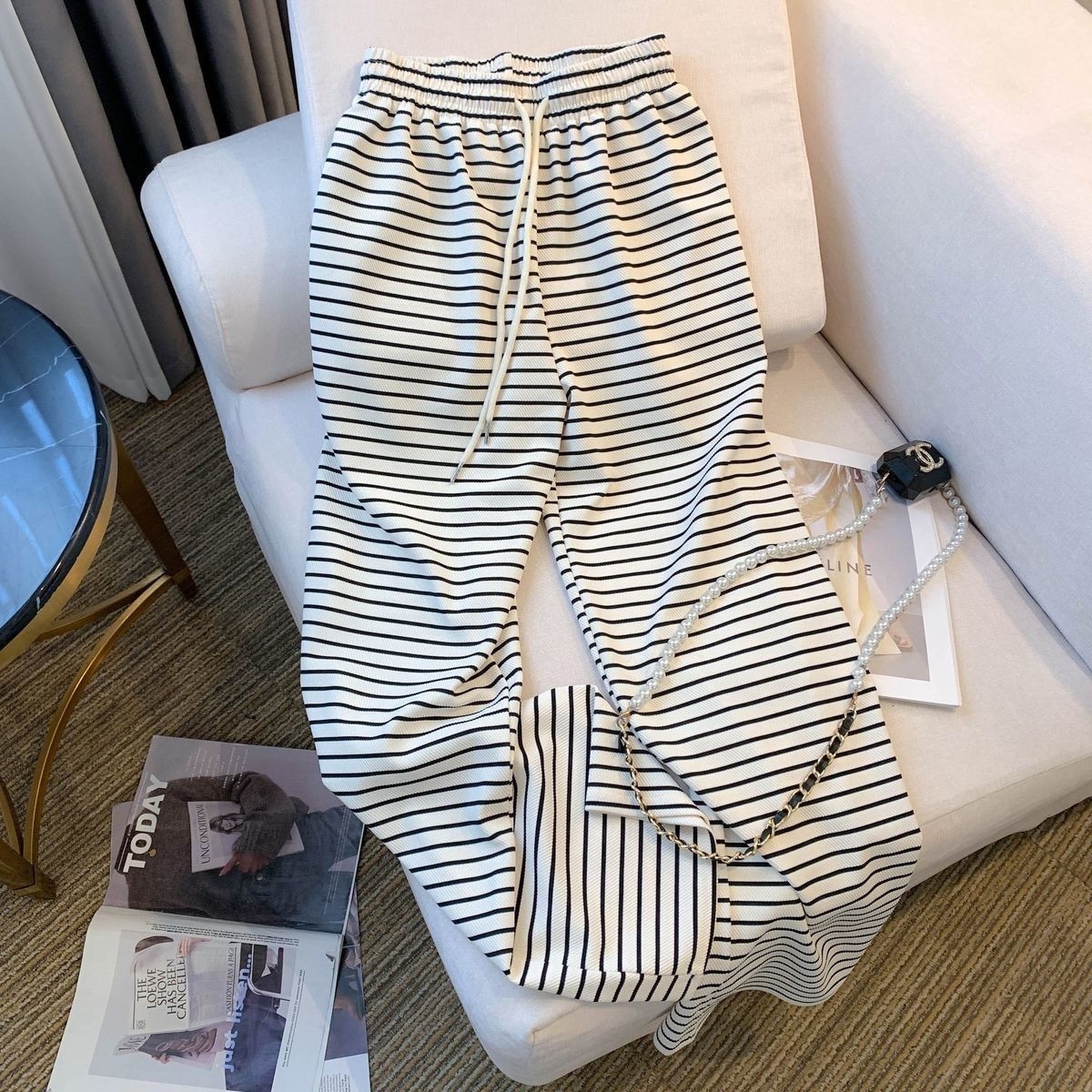 经典永不过时的黑底白纹,自带显瘦buff! 高腰松紧腰设计不勒肚子,梨形身材直接封神,藏肉遮胯一绝。 垂坠感拉满的阔腿裤型,走路带风,休闲又高级,日常通勤、出街遛弯都能穿,搭配T恤、卫衣、小吊带都超有氛围感。