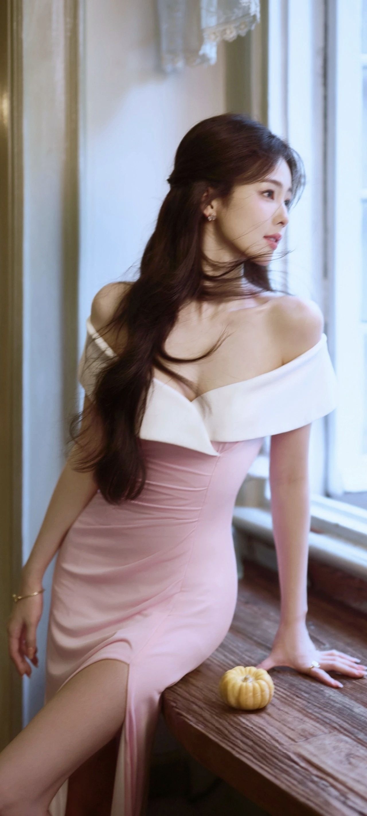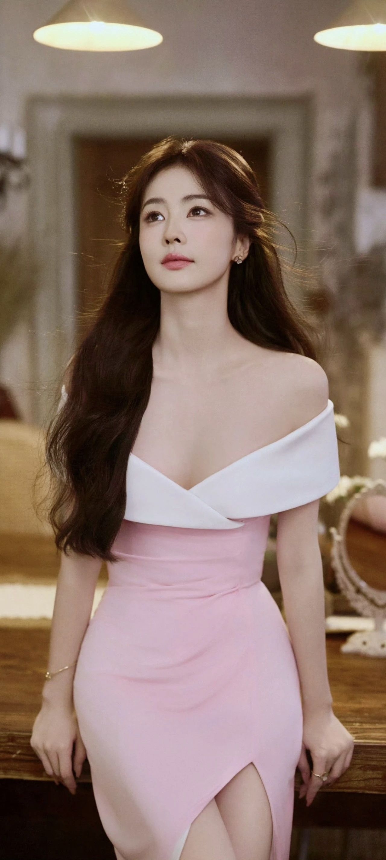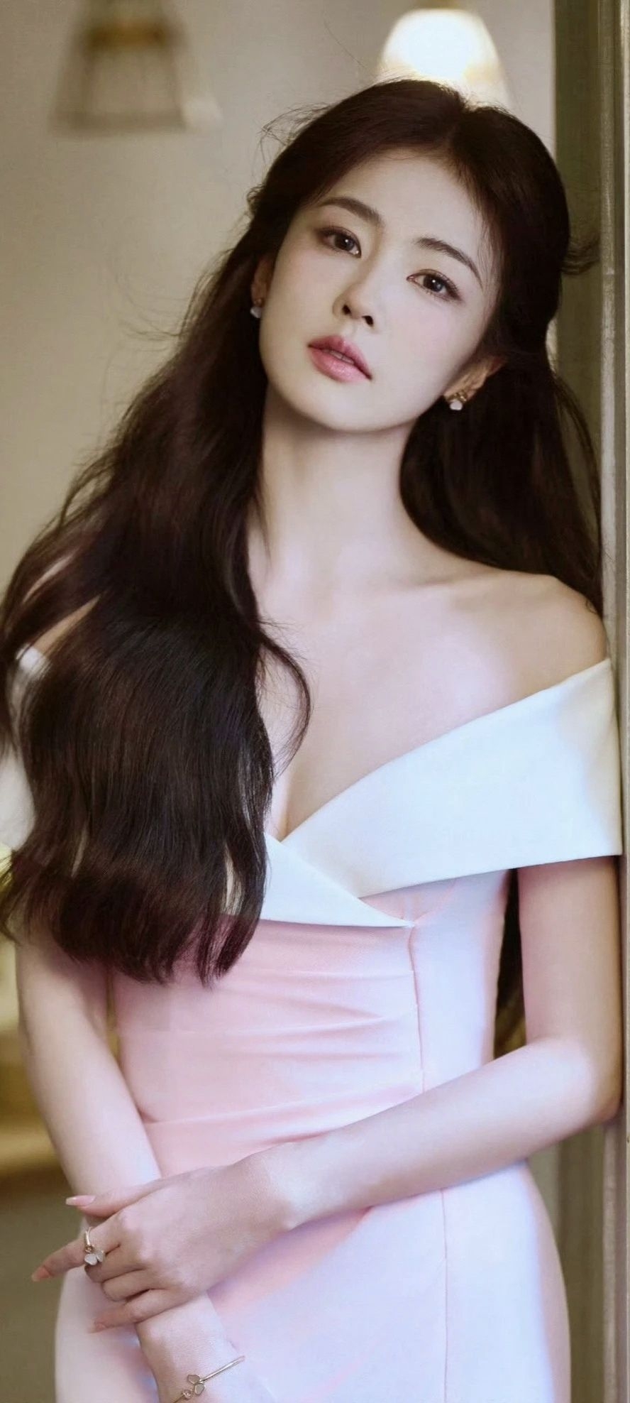 白鹿的这身粉白露肩长裙真的很惊艳!✨ 明明是同一套衣服,却在不同的瞬间,诠释出截然不同的美感。 一面是优雅女神:侧身轻倚,修身剪裁与高开叉设计,将优雅身线与灵动气质完美结合。粉与白的温柔拼接,在深V和露肩的细节下,显得既大方又迷人。 一面是静谧时光:斜坐窗边,任裙摆自然垂落。同样的长裙,在光影与花瓶的衬托下,氛围变得恬静慵懒。脚上那双独特的金色缠绕高跟,成了整体造型的点睛之笔,让温柔中透出恰到...