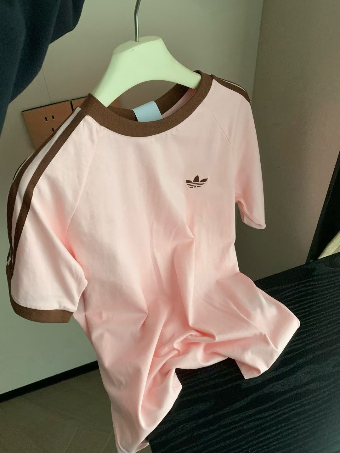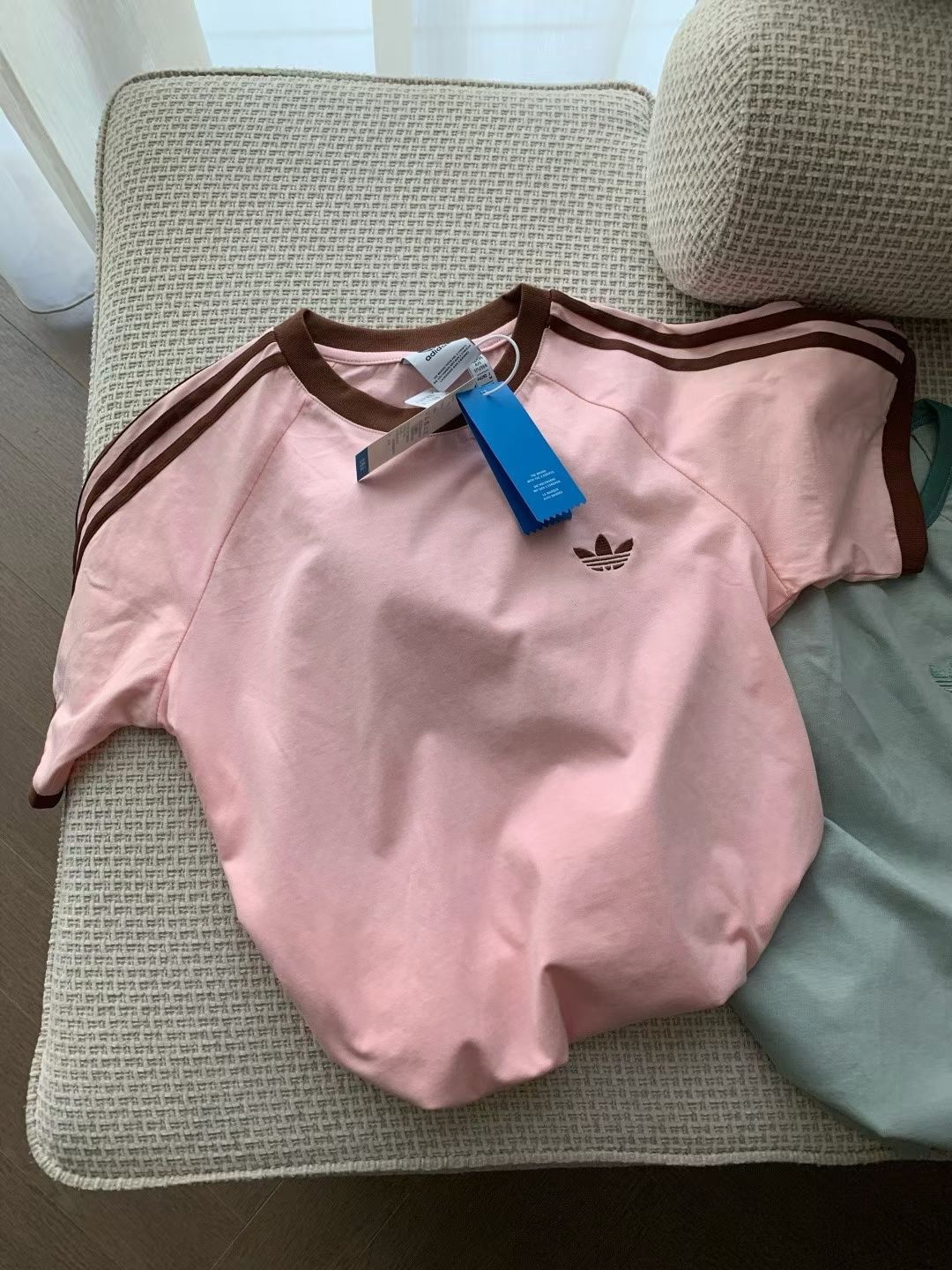🌸 颜值直接戳中少女心 浅粉底色+深棕撞色,完全是温柔挂天花板! - 经典三叶草刺绣标,低调又精致,细节感直接拉满 - 插肩袖+侧边三条杠设计,复古运动感拉满,美式复古那味儿直接拿捏 - 圆领+袖口撞色包边,不挑脖子,穿久了也不会变形 - 正肩剪裁巨藏肉!溜肩、拜拜肉全遮住,上身秒变直角肩,显瘦绝了 ☁️ 上身体验感满分 面料是那种软软糯糯的纯棉质感,透气不闷汗,夏天穿完全不粘身!...