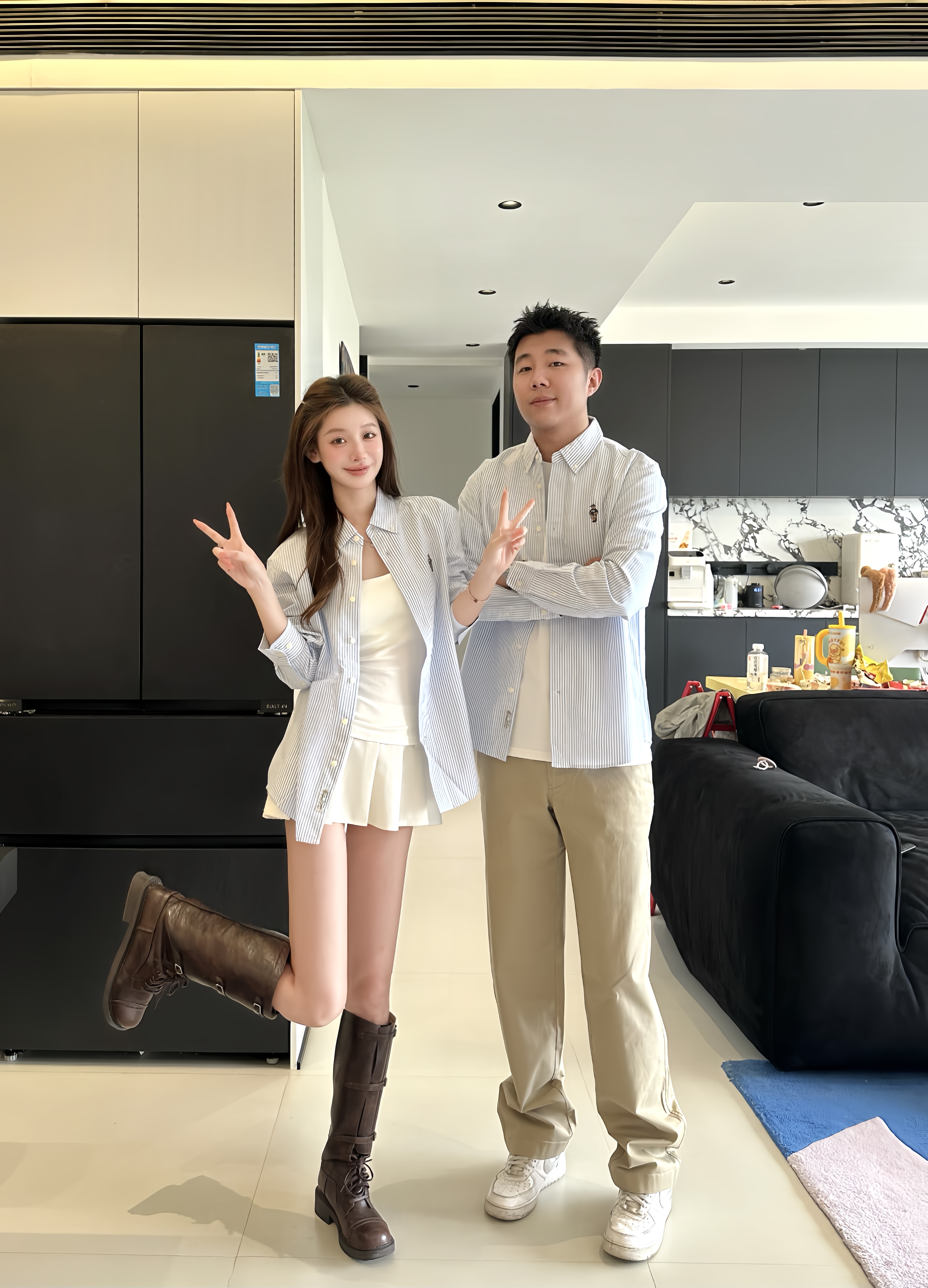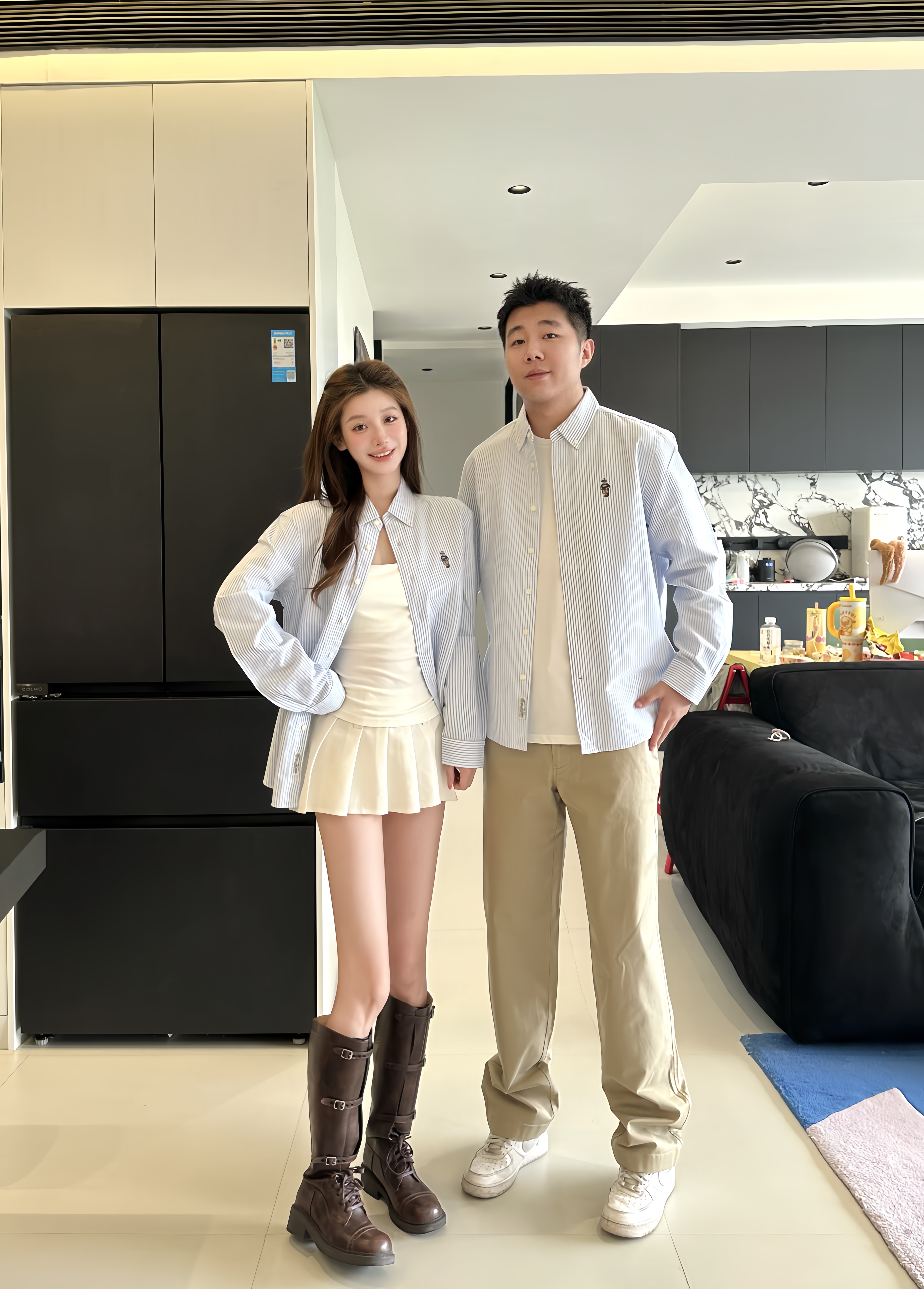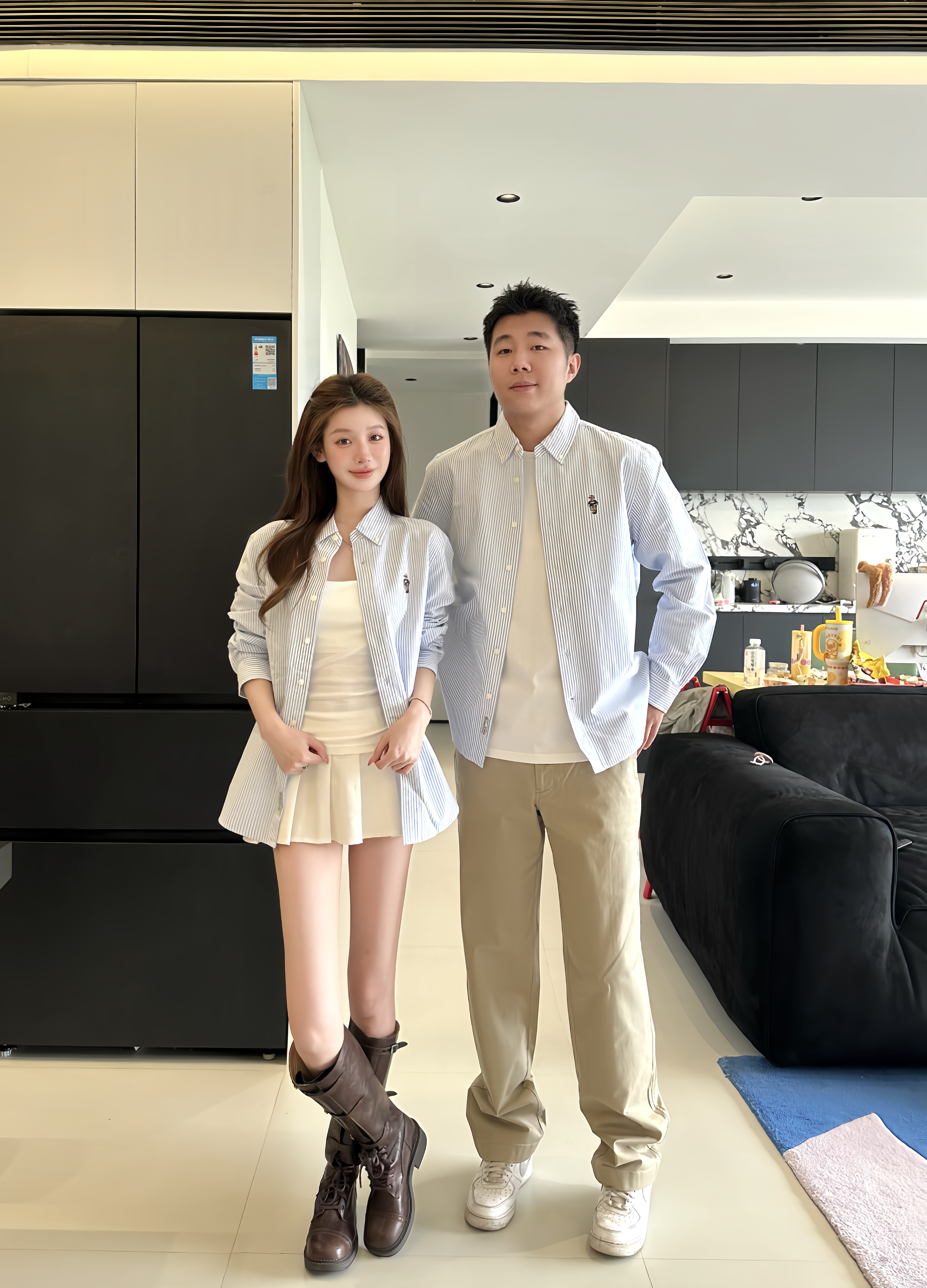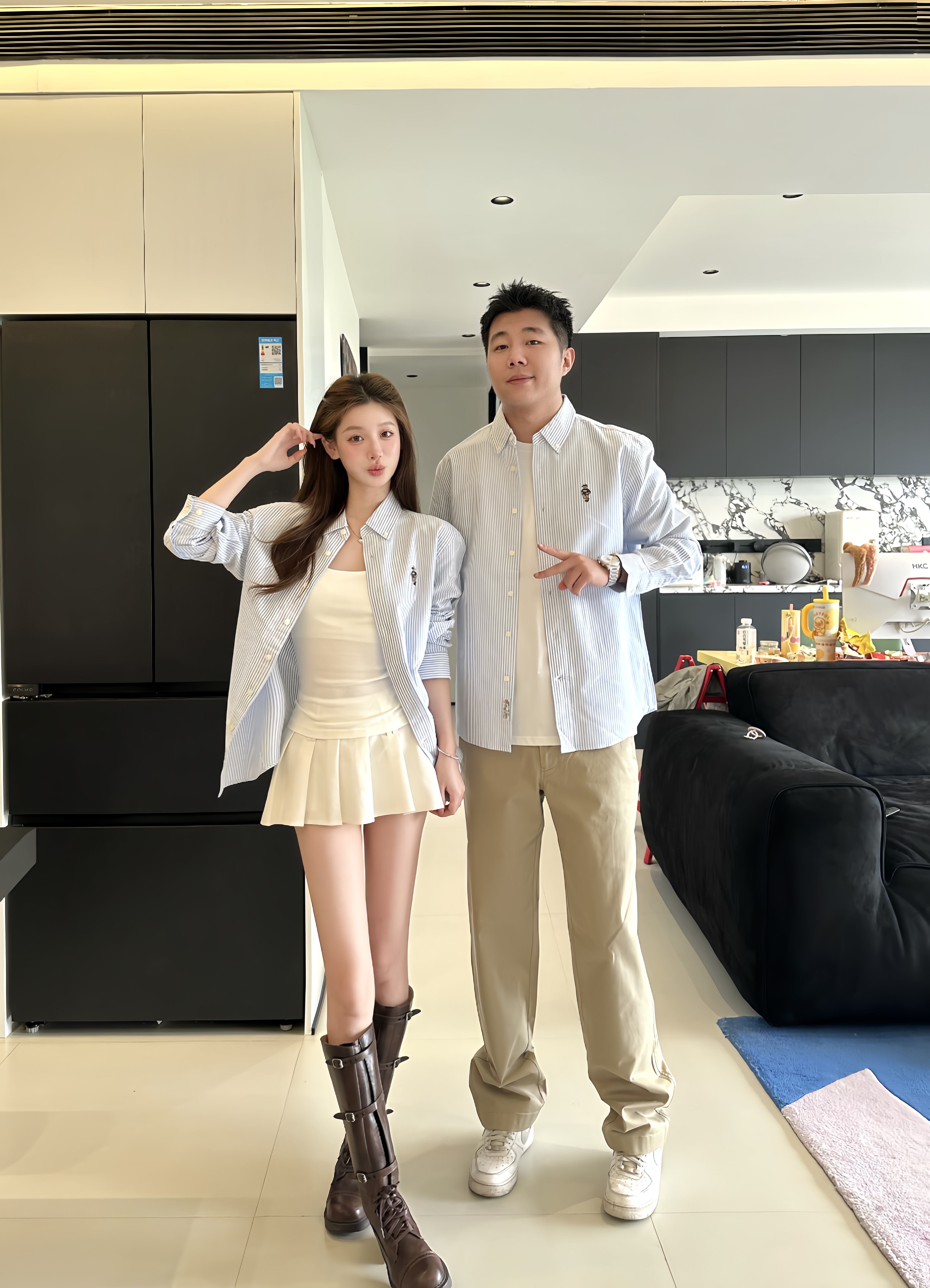 我俩终于get到叠穿的松弛感了 基础款polo➕蓝白条纹衬衫轻松叠穿出默契感 衬衫版型宽松 上身不束缚 春夏当防晒衣也ok 整体看起来很清爽 下身搭配裤子 裙子都很ok 日常通勤或者约会都超级适配!