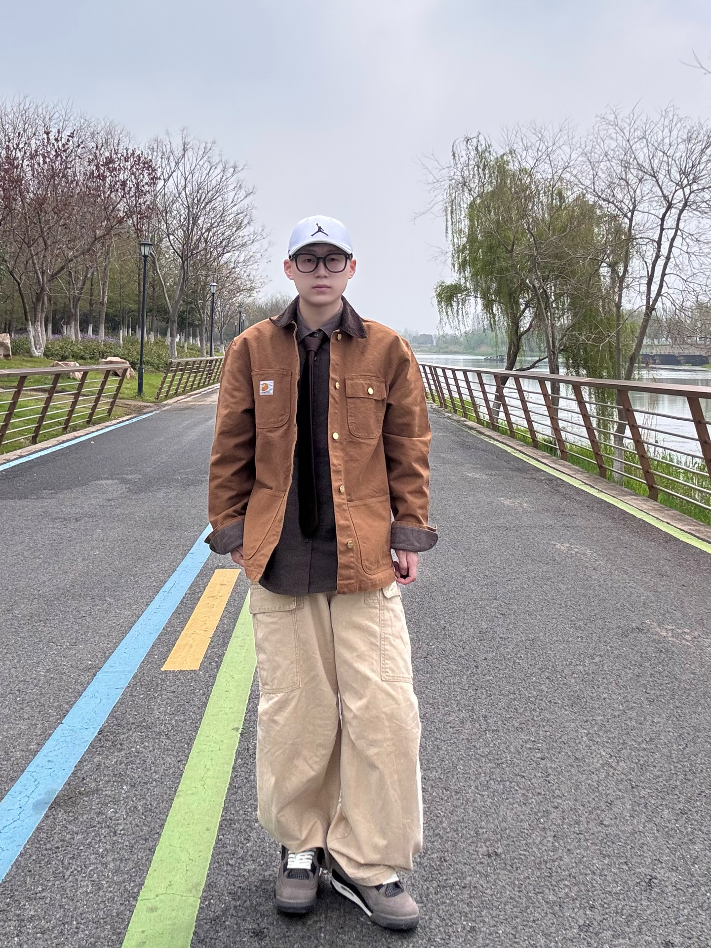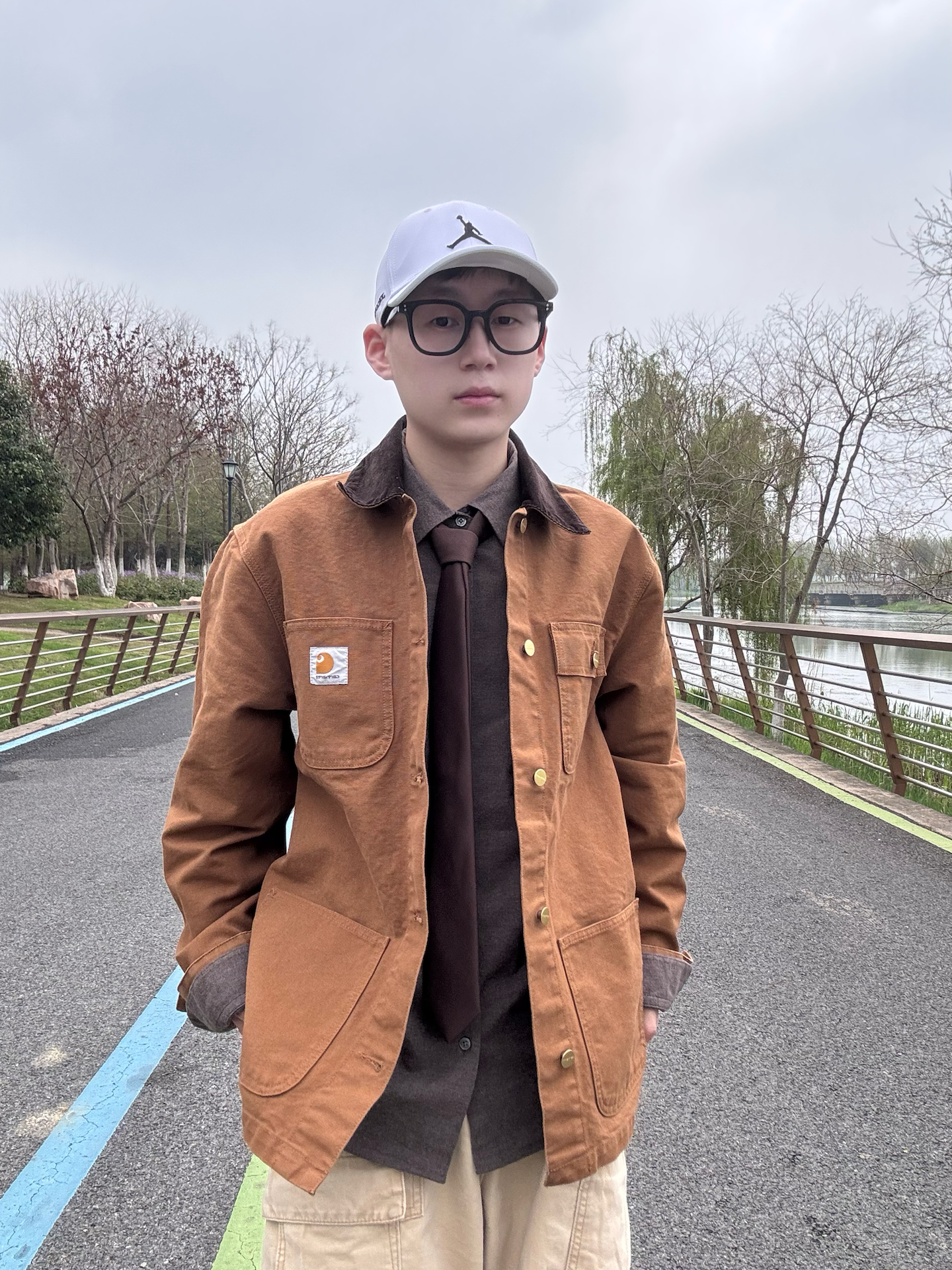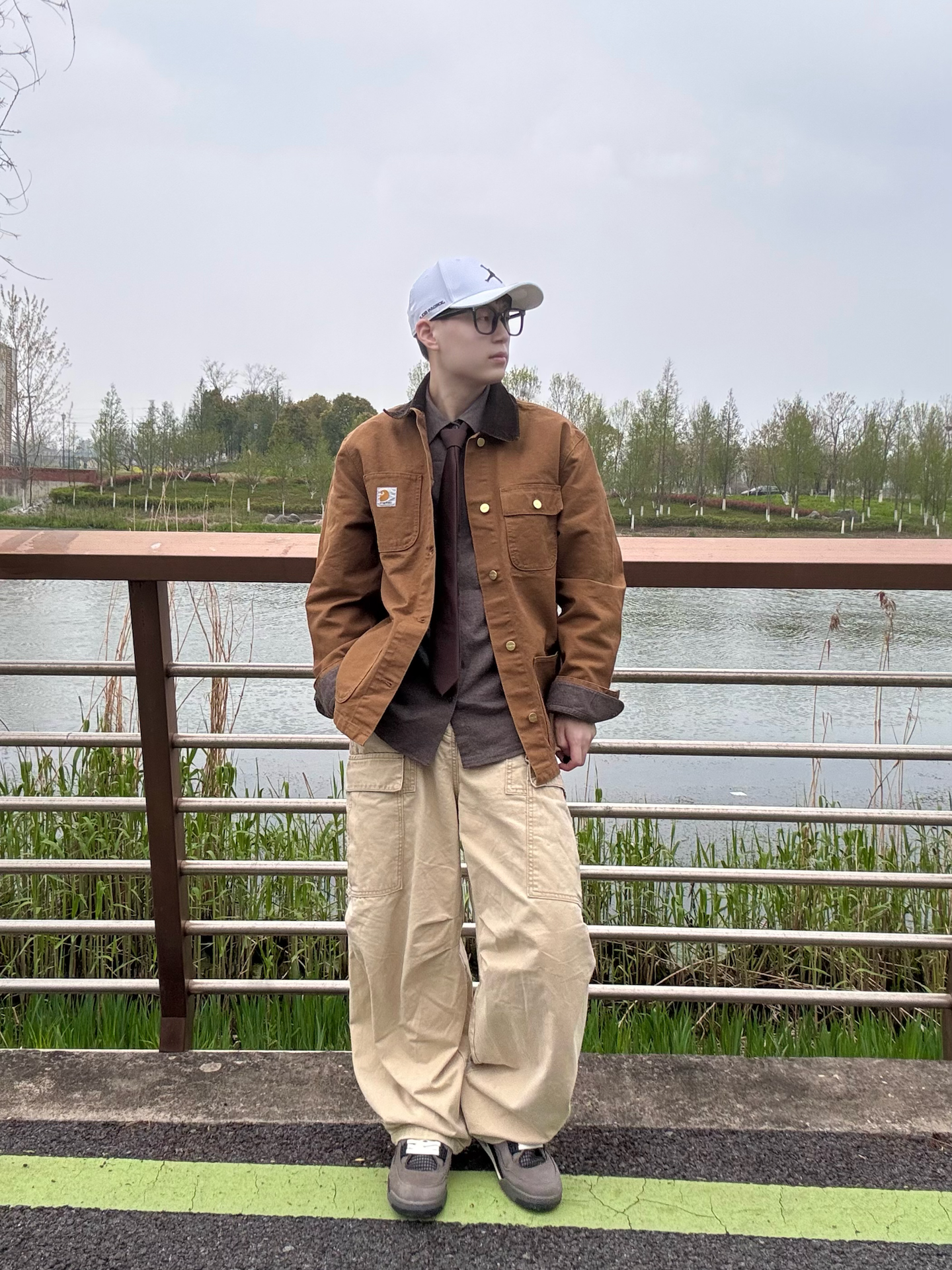 谁懂啊!焦糖棕Carhartt夹克真的是春日氛围感神器✨ 同色系深棕衬衫+领带,叠穿层次感直接拉满 米白阔腿裤弱化正式感,松弛感拿捏👌 AJ+棒球帽注入少年感,河边散步都像拍画报 通勤/出游都适配的韩系复古风,春天就该这么穿!
