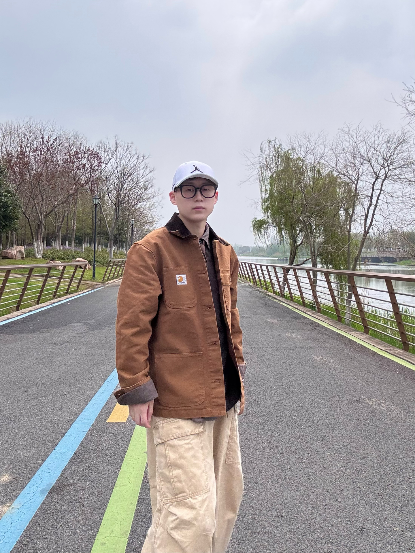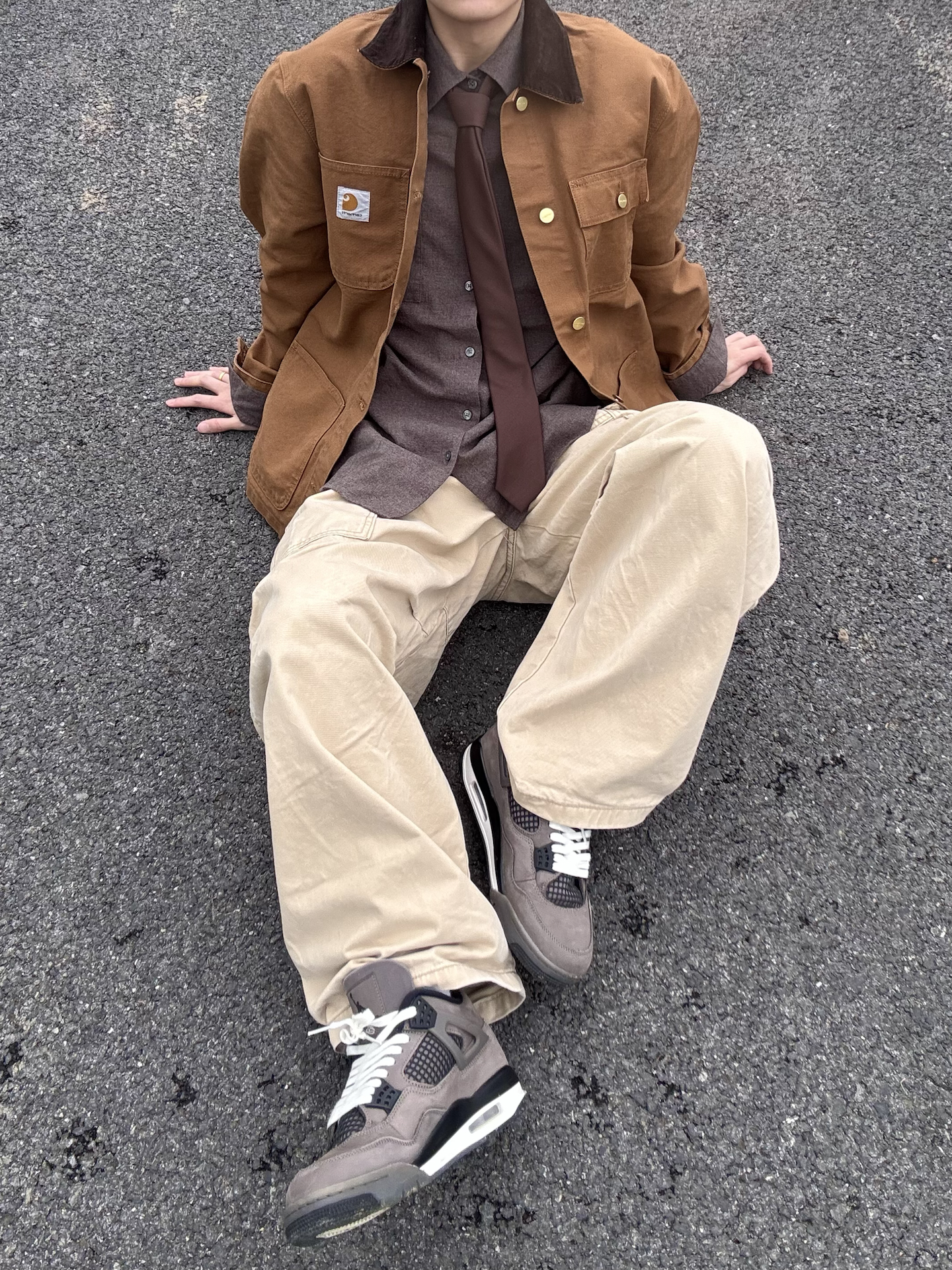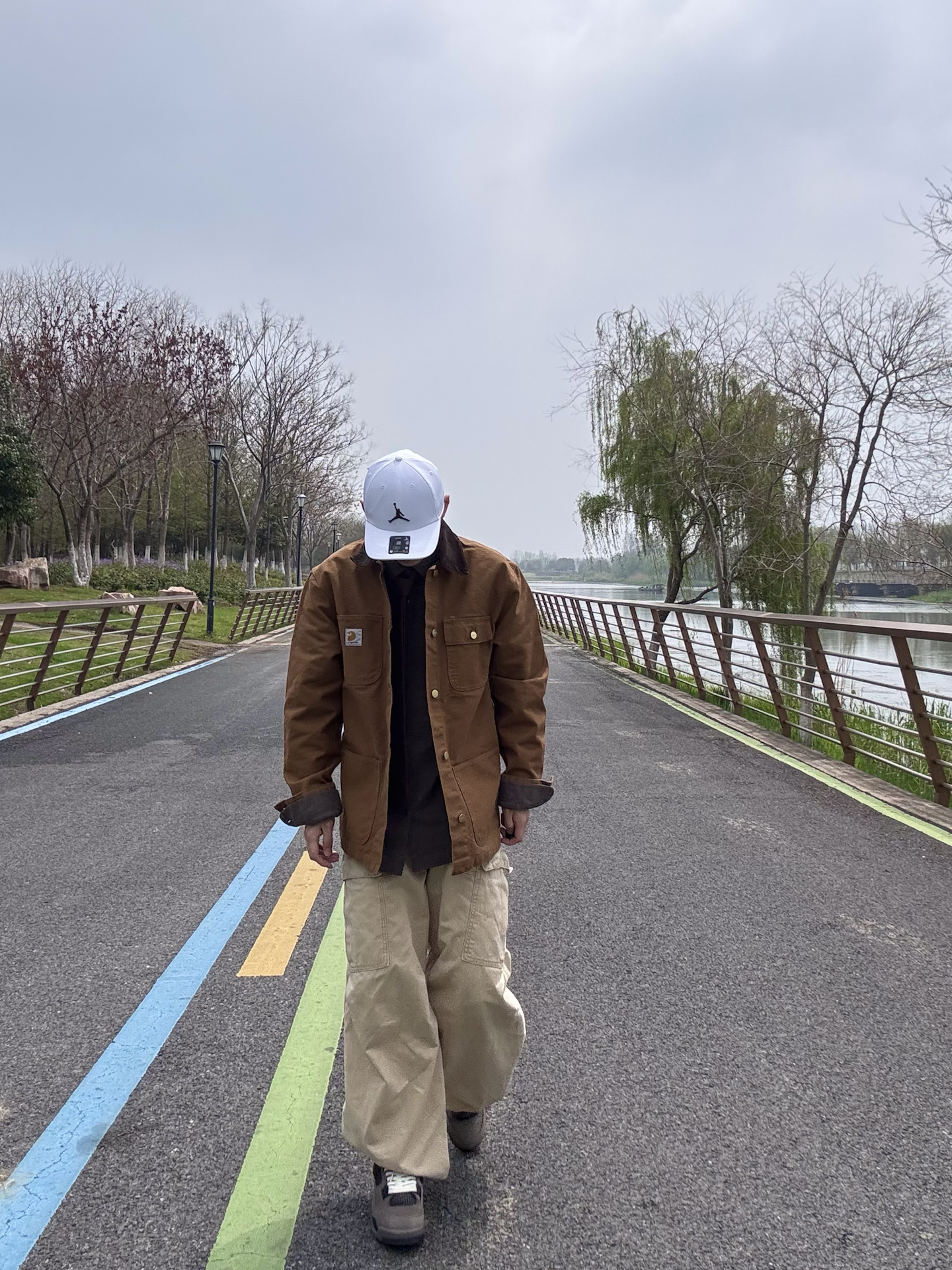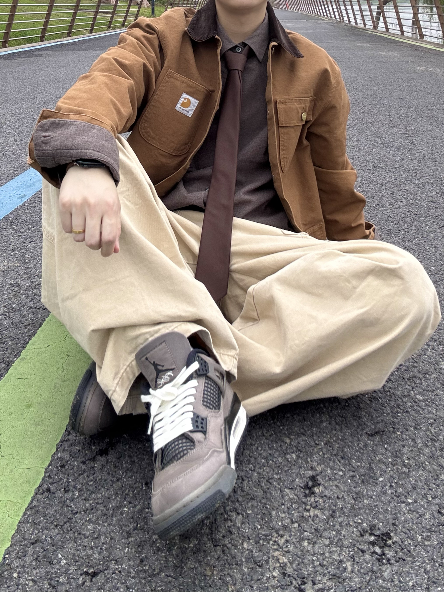 谁懂啊!焦糖棕Carhartt夹克真的是春日氛围感神器✨ 同色系深棕衬衫+领带,叠穿层次感直接拉满 米白阔腿裤弱化正式感,松弛感拿捏👌 AJ+棒球帽注入少年感,河边散步都像拍画报 通勤/出游都适配的韩系复古风,春天就该这么穿!