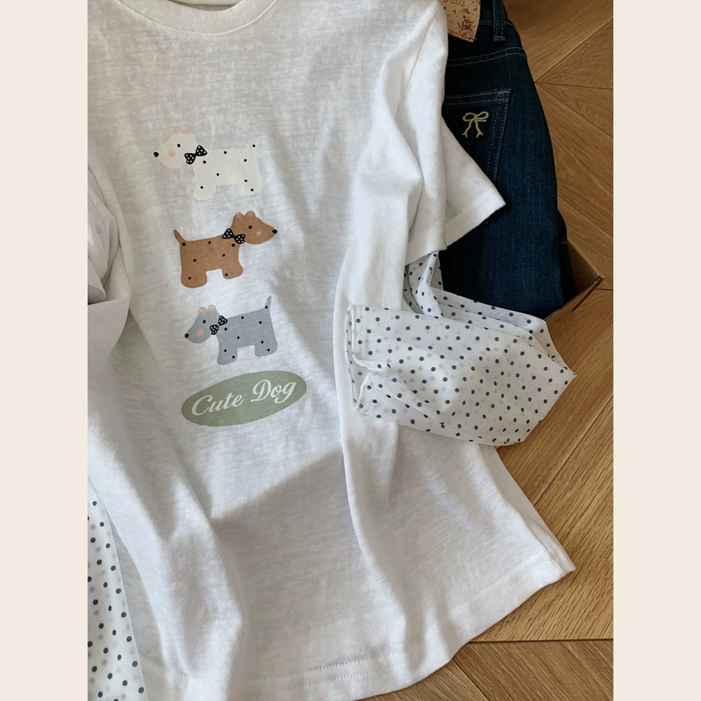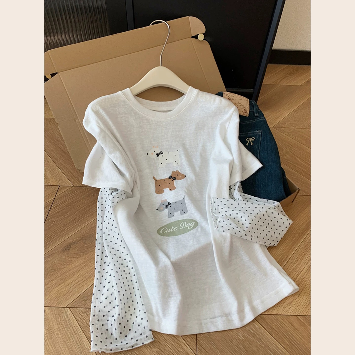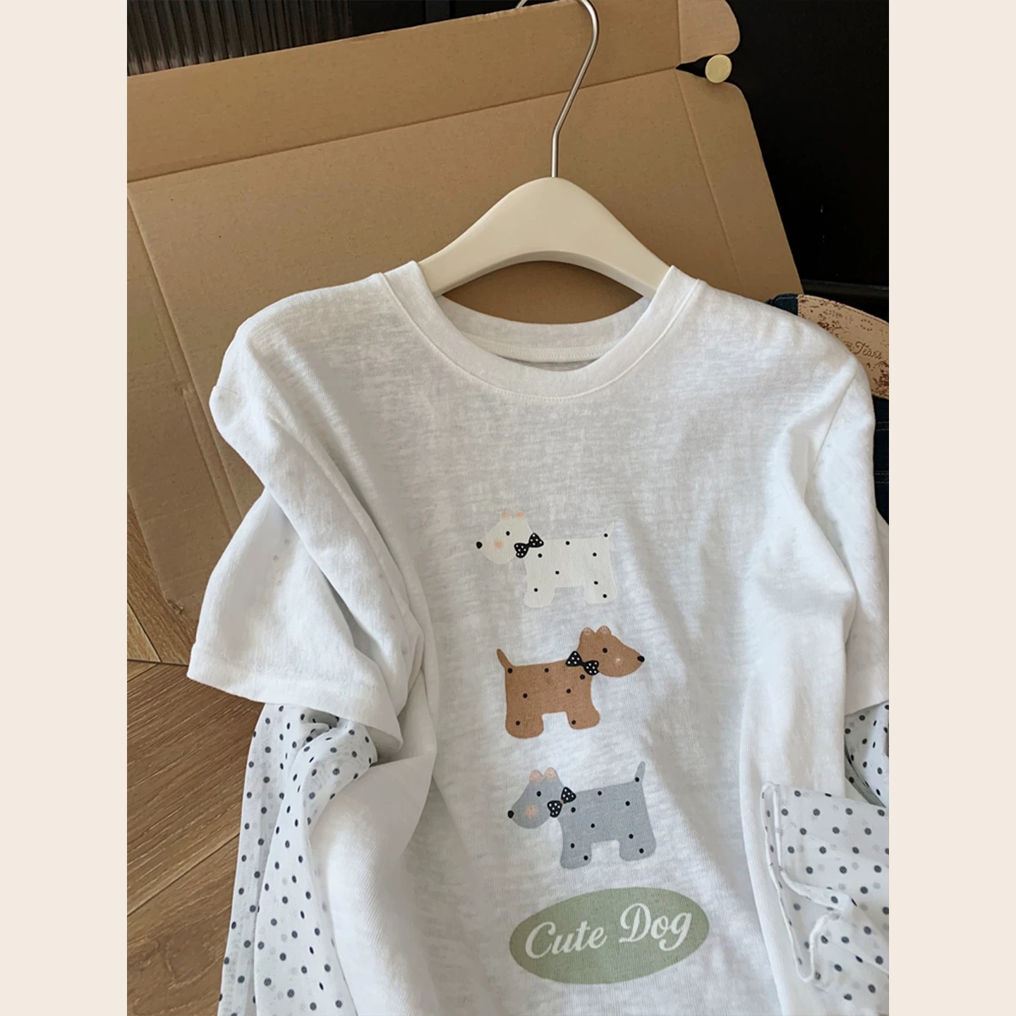 外层是宽松白色短袖 内搭拼接点网纱长袖视觉上营造叠穿效果,实际是一件式穿脱方便 胸前做了三只腊肠犬的卡通小狗,印花软萌感拉满自带治愈氛围 宽松落肩设计,不挑身材,对微胖梨形身材又好遮肉显瘦