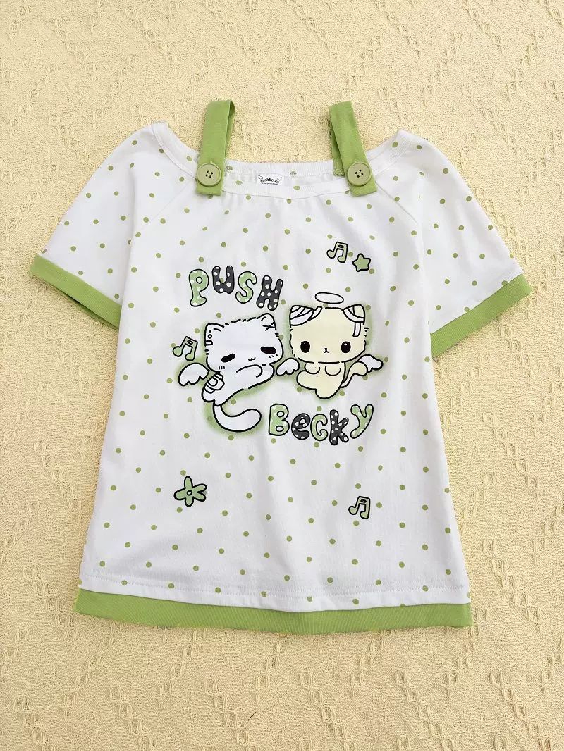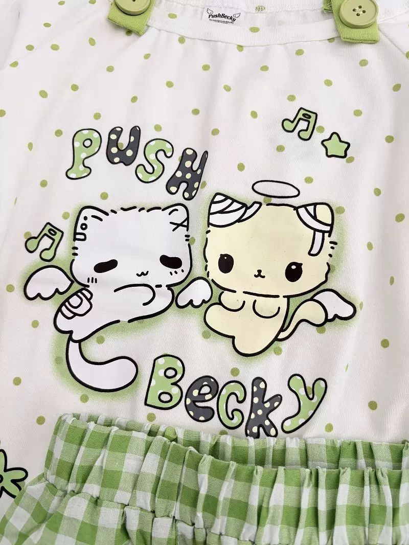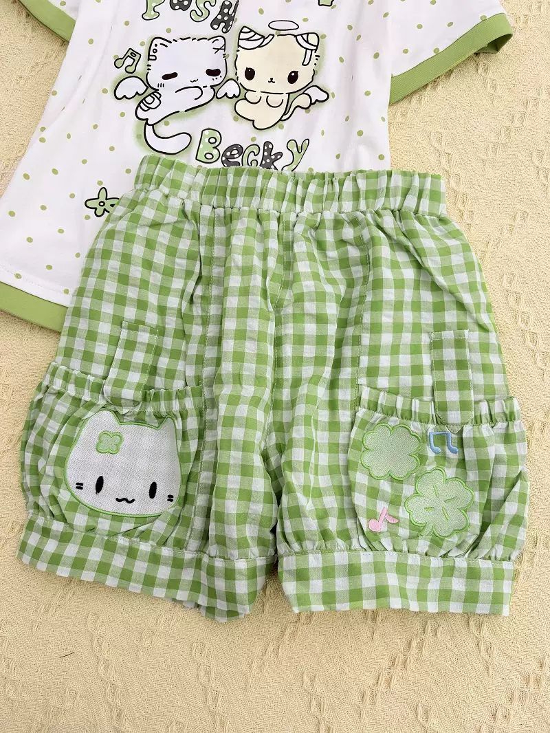 救命!这套猫咪家居服也太可爱了吧🥹 清新绿波点+格纹,两只天使猫咪直接把软萌感拉满! 上衣可一字肩,短裤宽松不勒肚子,居家穿舒服到不想脱,外穿也完全不违和! 春夏穿清爽又减龄,甜妹直接焊在身上!