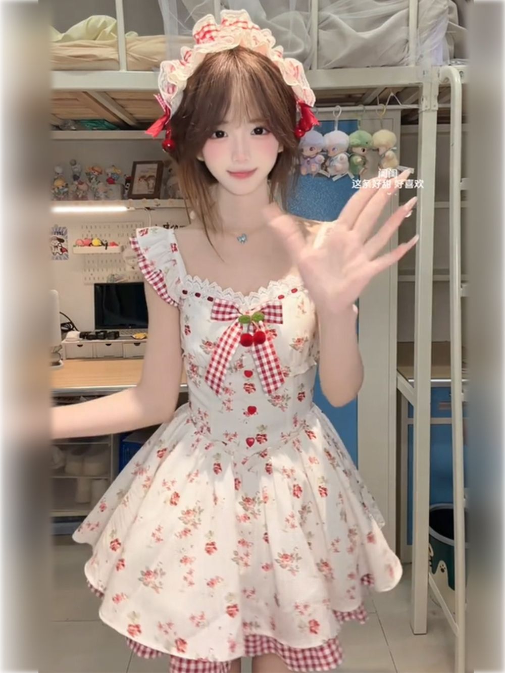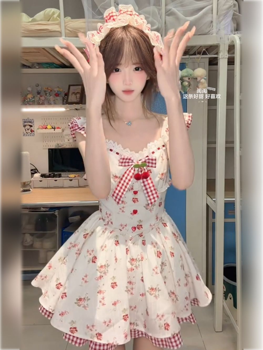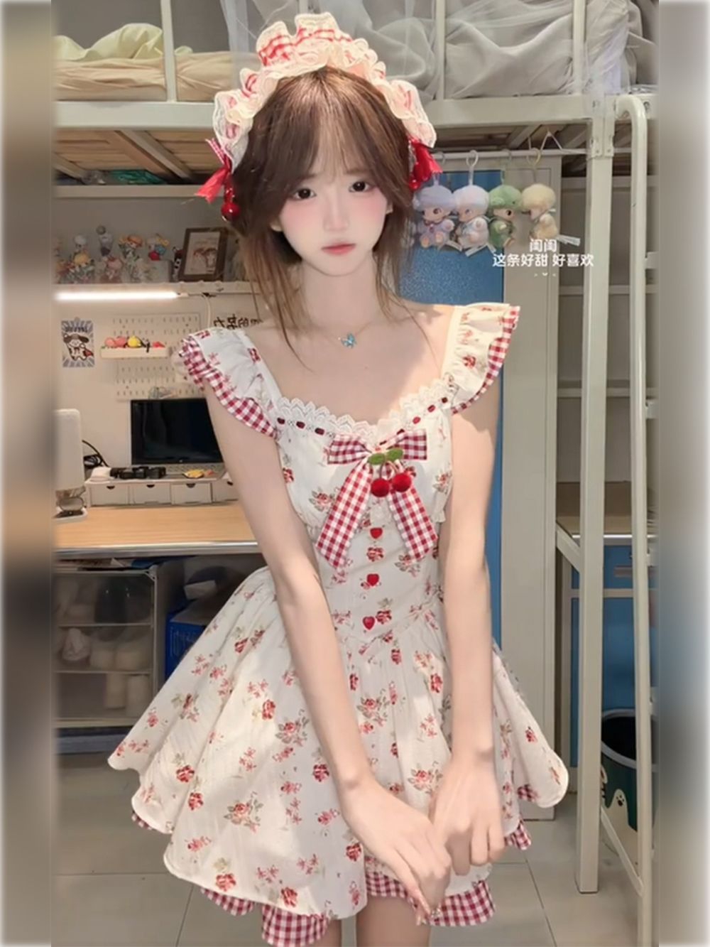 真的太甜啦🥰 这条洛丽塔小裙子完全是甜妹本命 奶白底+红玫瑰碎花,搭配红白格纹的飞袖、蝴蝶结和裙摆镶边,复古又元气,樱桃装饰更是点睛之笔,甜到冒泡! 收腰+蓬蓬花苞裙,完美藏肉显腿长,小个子穿也超显比例。 同风格的蕾丝发带+红蝴蝶结,一整个氛围感直接拉满,宿舍穿搭都像在拍甜妹写真! 🧸搭配白色堆堆袜+玛丽珍鞋,就是校园甜妹本妹 配同色系贝雷帽、珍珠项链,精致感直接拉满 日常出街可以搭小开衫,防晒...