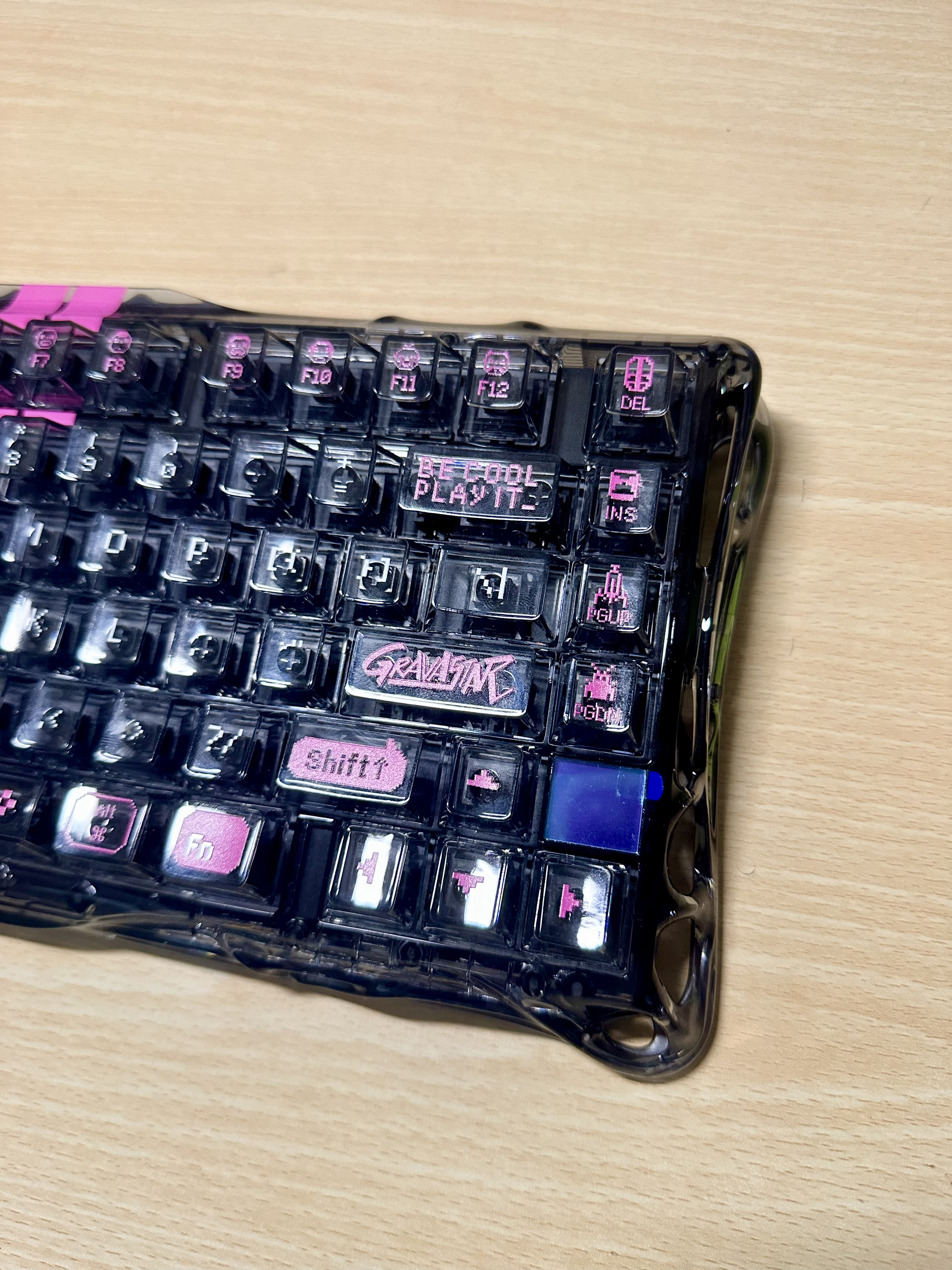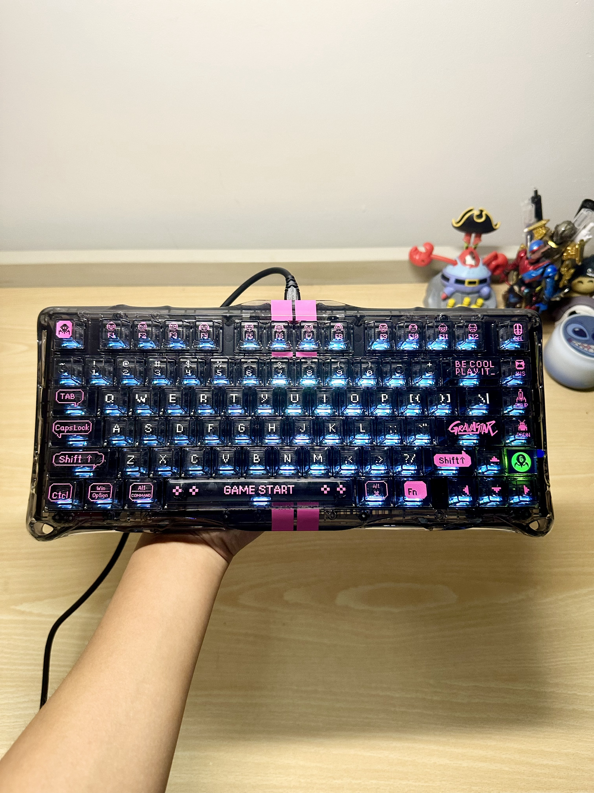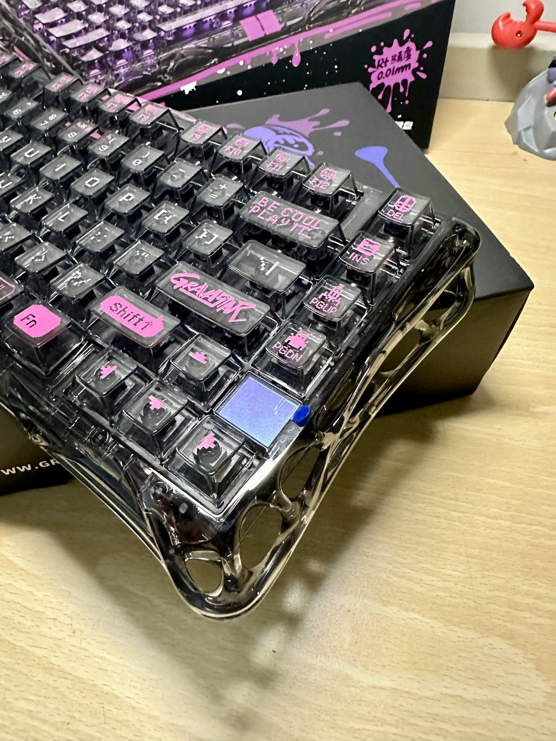 重力星球 瓦75LITE夜行者,79键的 黑莓粉配色真的斩男斩女,有点喜欢 我选的是有线连接,打瓦打FPS,没有延迟 磁轴轴体,可以根据自己的喜欢调节灯光, 敲击感是那种石子音