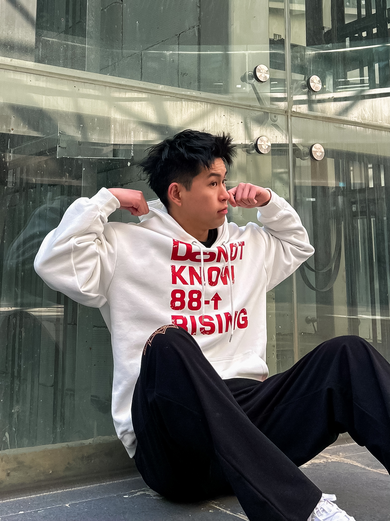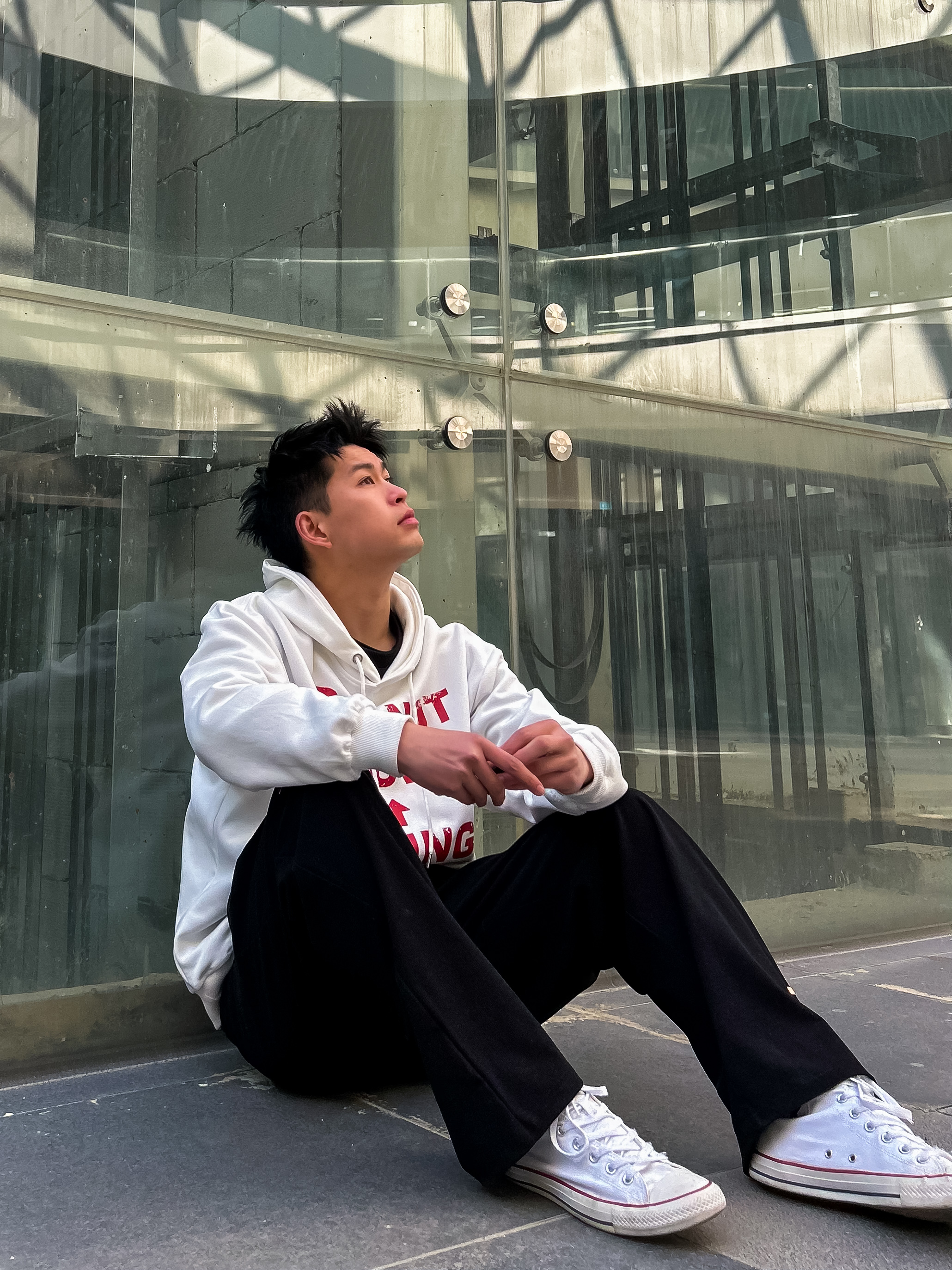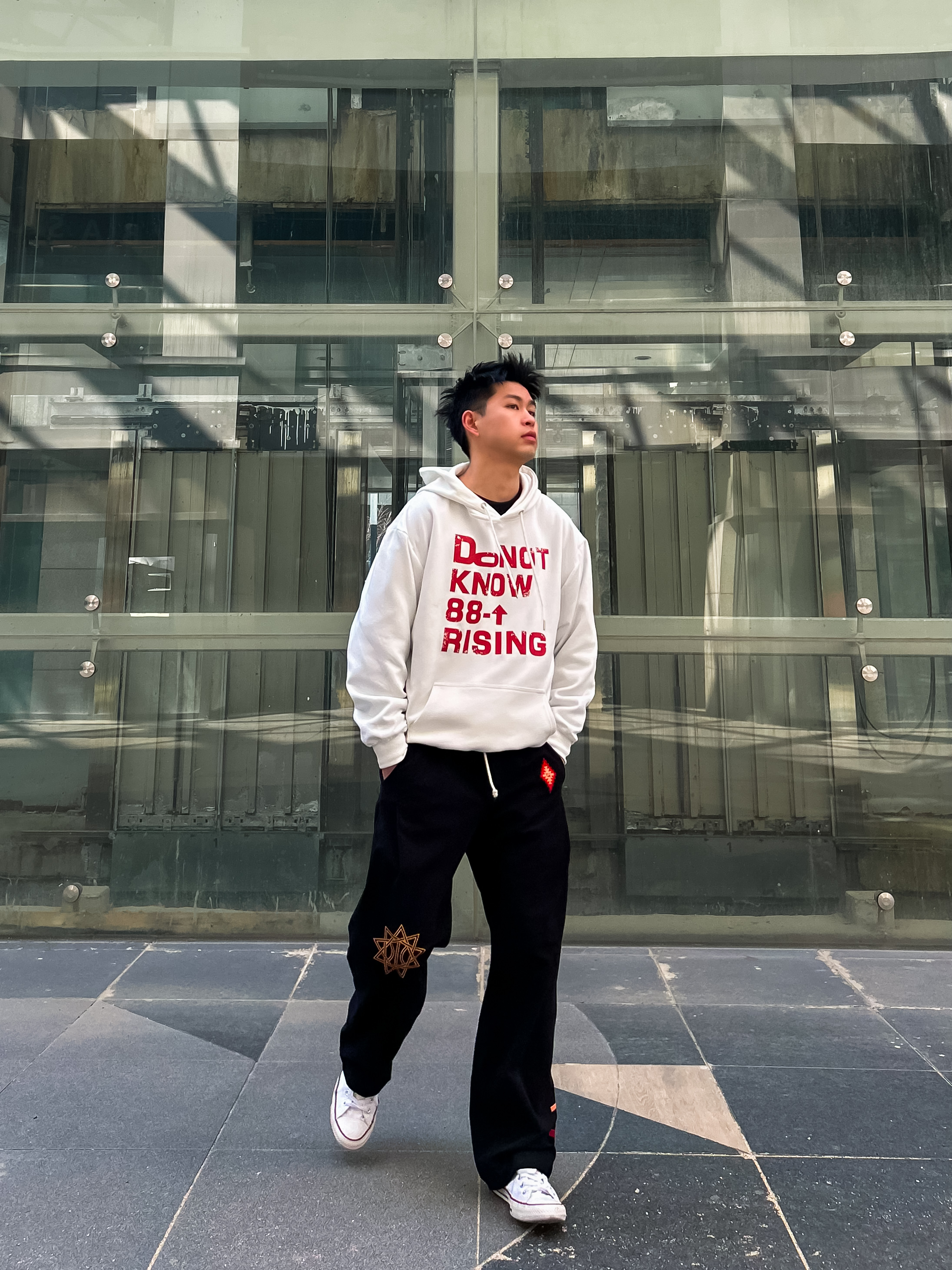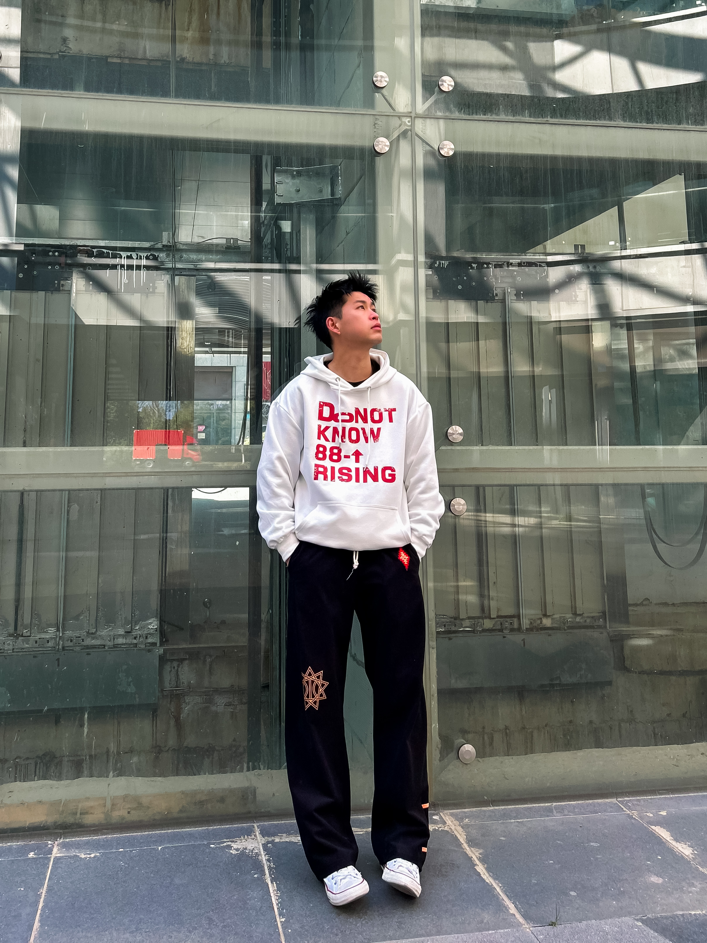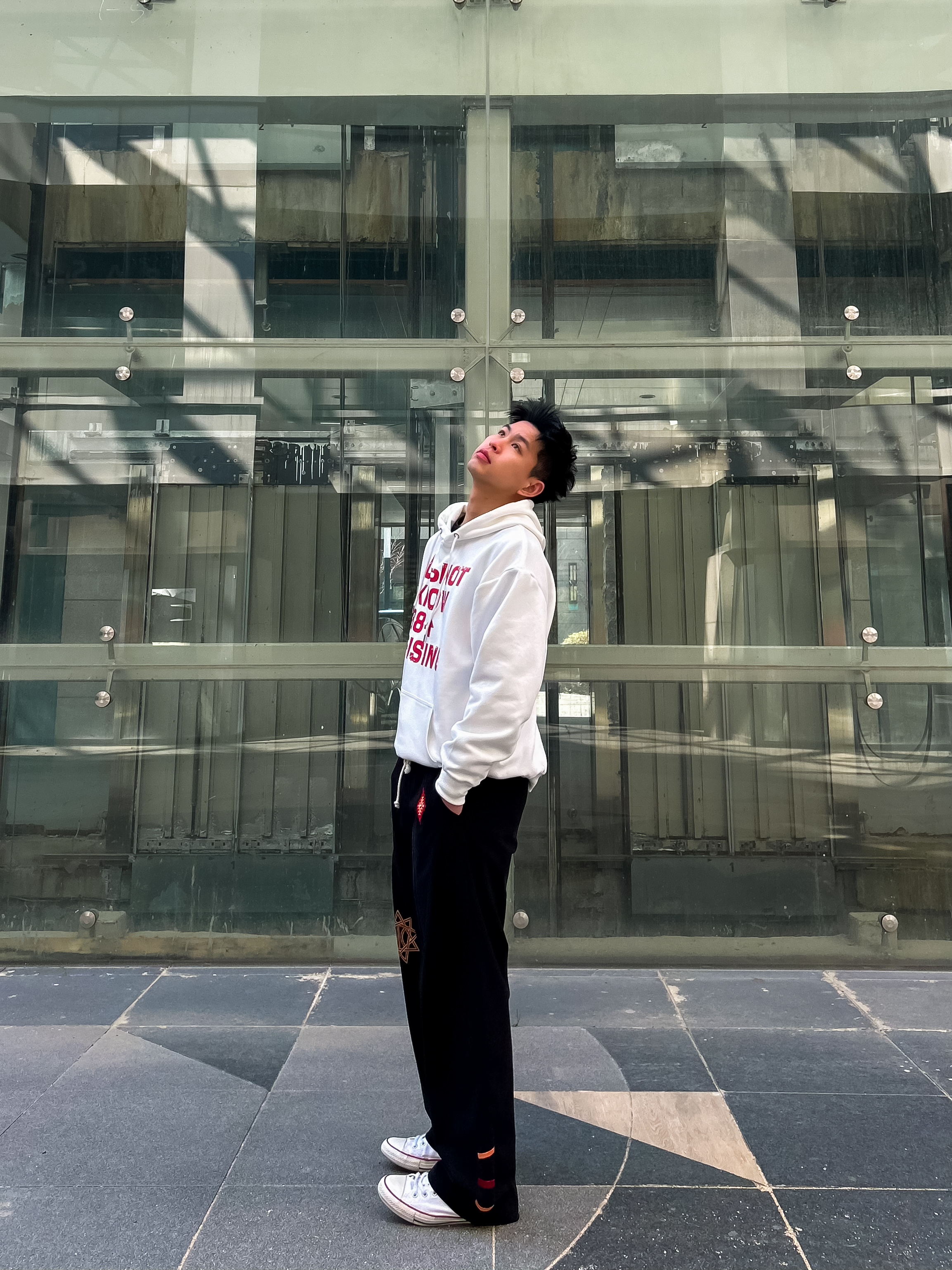 哈咯,这里是卢_SG 春天的松弛感穿搭 黑白红经典配色永不出错。 白色连帽卫衣,宽松版型不挑身材 红色做旧字母印花复古感拉满 搭配黑色刺绣直筒裤 侧边几何图案增加细节,垂坠感显腿长。 日常出街、通勤都适配,轻松拿捏春日氛围感
