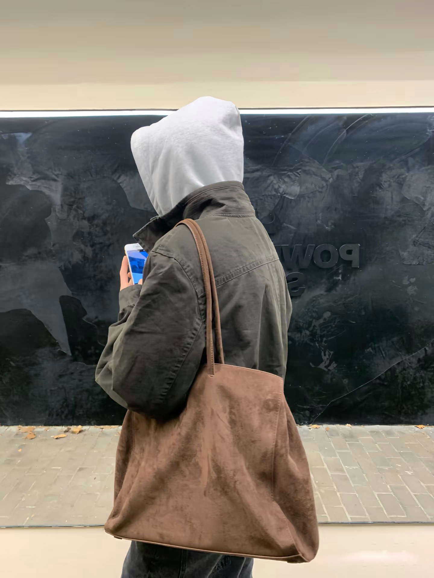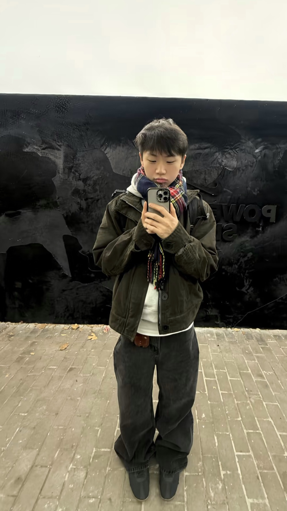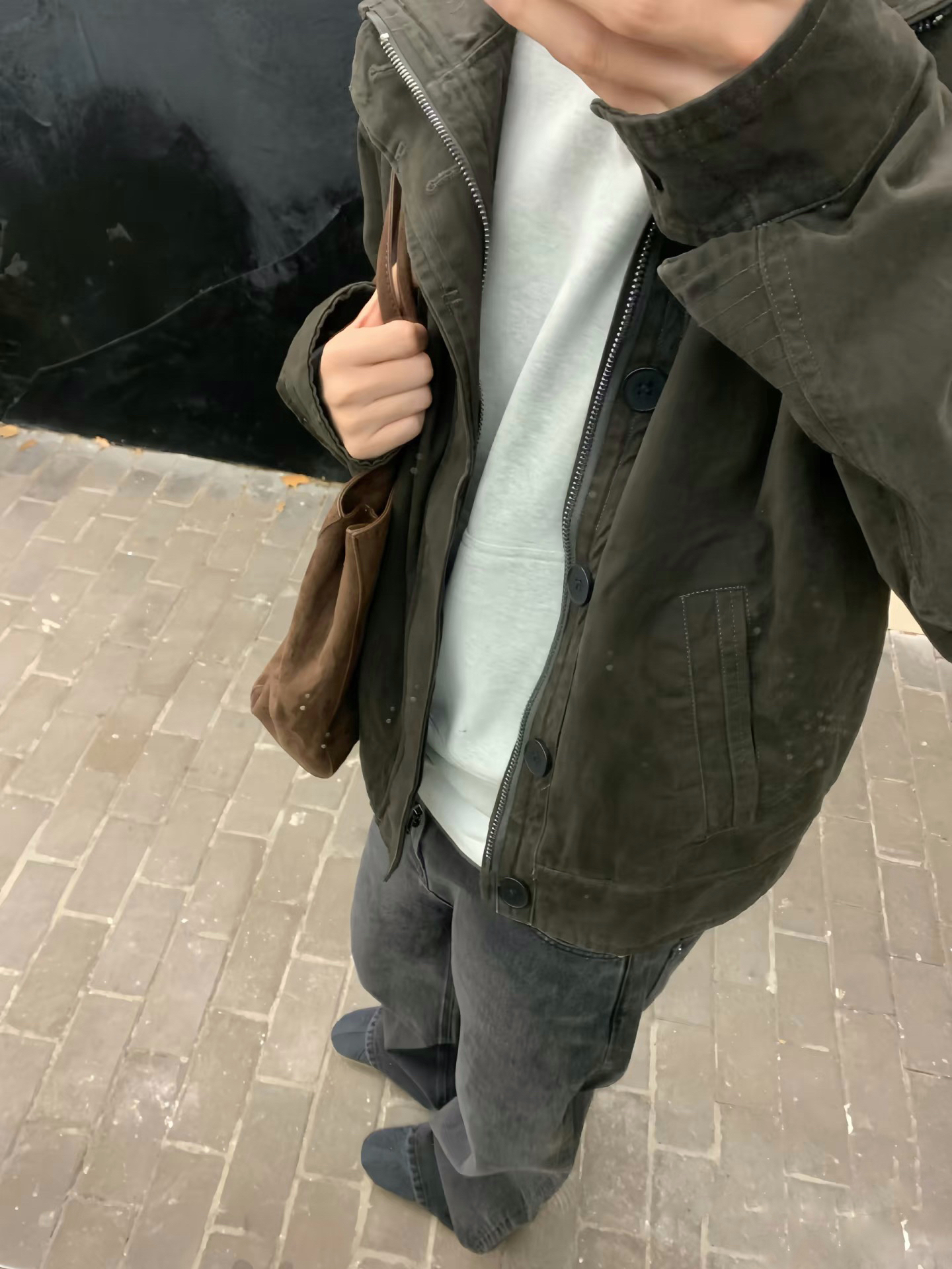 军绿工装夹克+灰色连帽卫衣经典叠穿公式 黑灰阔腿裤弱化身材短板,松弛慵懒又干净利落 街头复古氛围感直接拉满,低调不张扬的少年感 春日出街万能模板,男生照着穿不出错