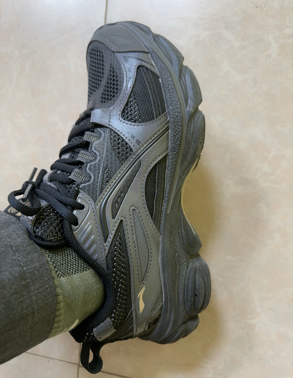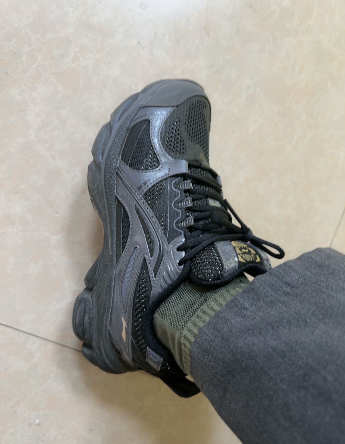 这双鞋子是做旧的复古风格,黑色的上脚很有质感,舒适度也不错很透气,双重震感的脚感挺舒服的,日常穿或者跑步运动都可~码数很正。 李宁扶摇BOOM