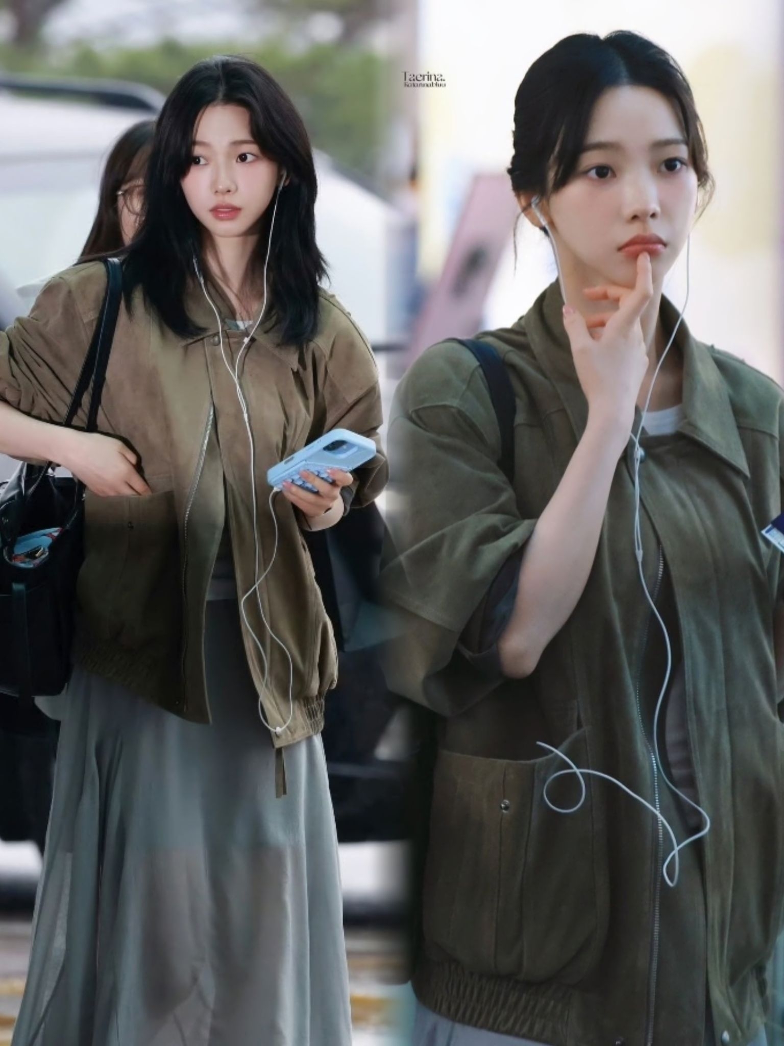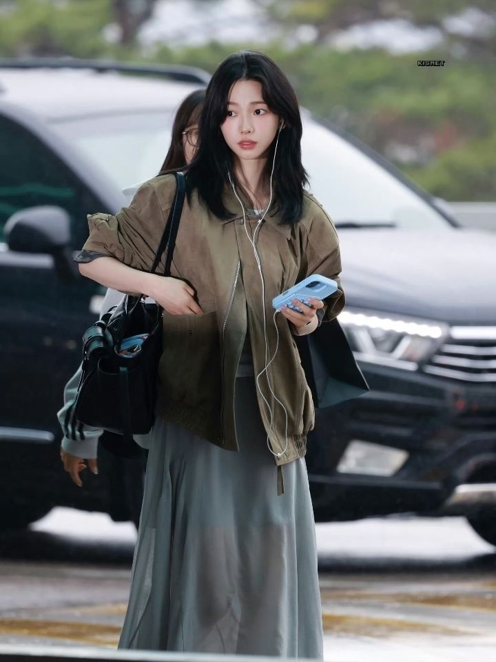 aespa柳智敏4月9日仁川机场出发大阪演唱会的这套私服,真的把「不费力的时髦」穿在身上了! 用「硬挺工装感夹克+柔媚透视长裙」做碰撞,平衡了酷感与温柔,是典型的韩系松弛感穿搭公式。