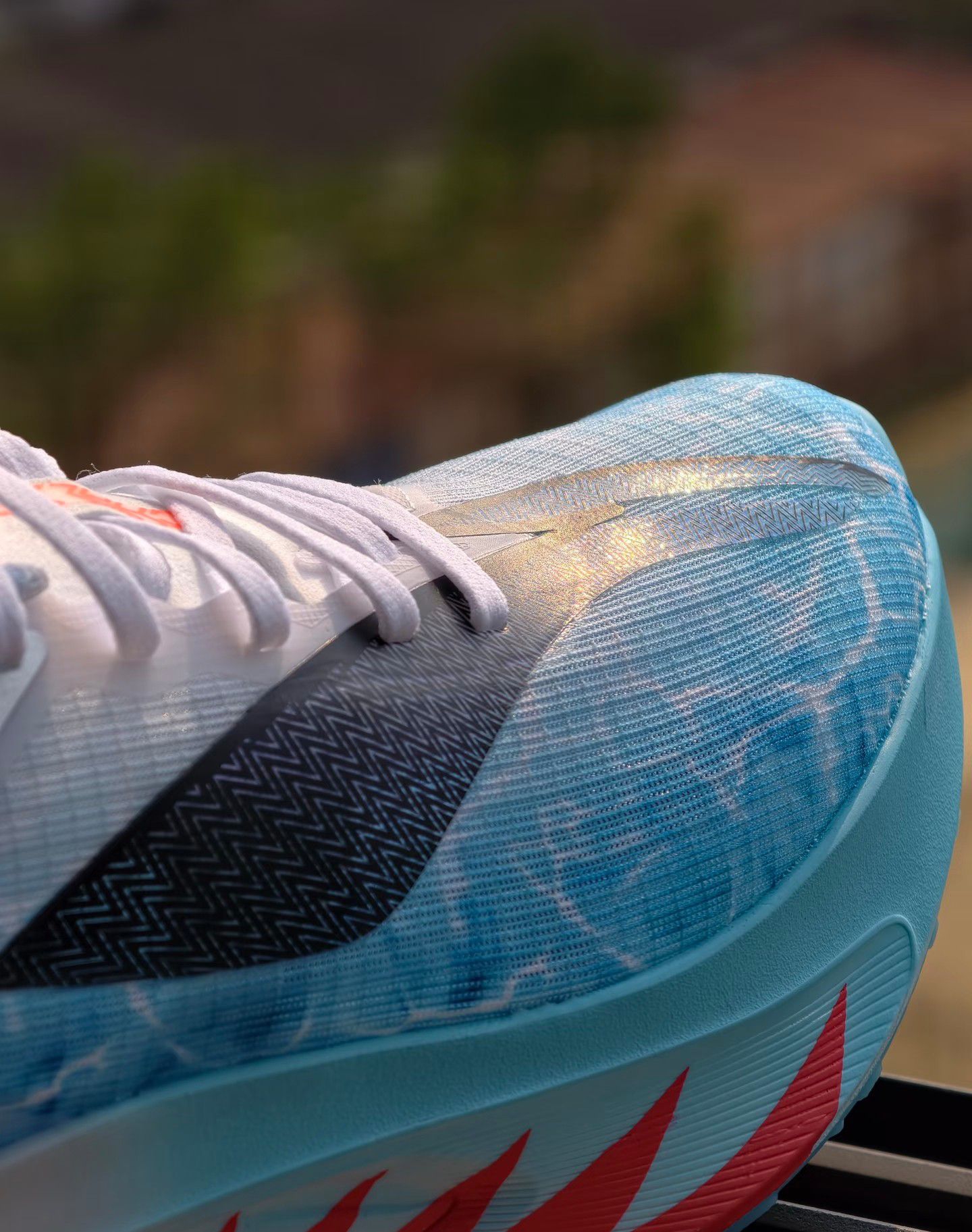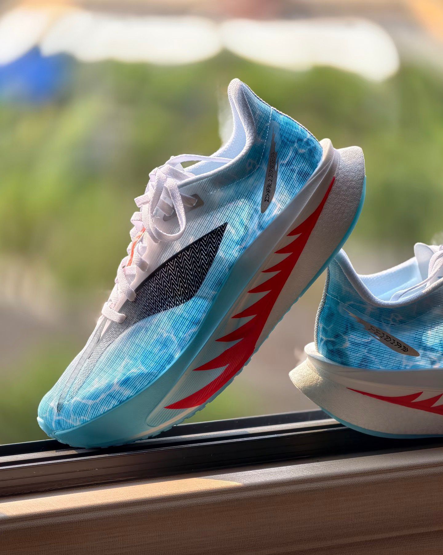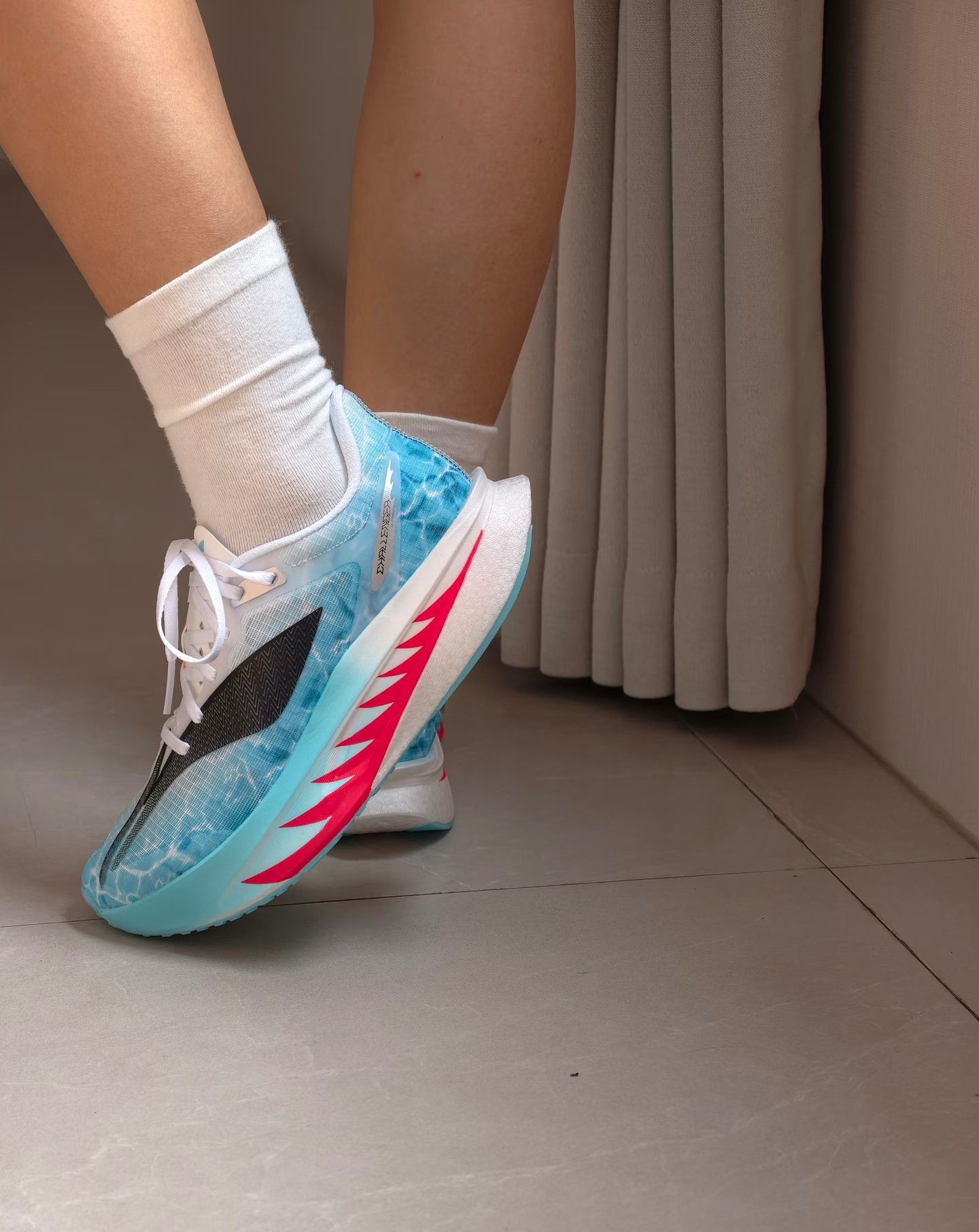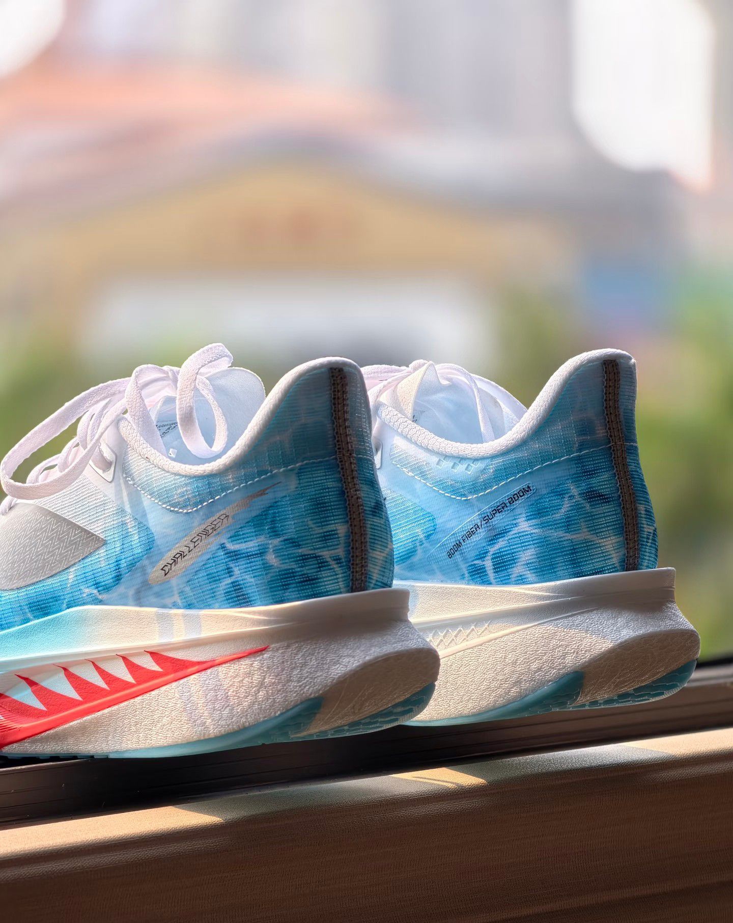以深海狂鲨为灵感,蓝白水波纹鞋面搭配鲨鱼齿红边中底,颜值与实力双在线,专为大众跑者打造的赛训全能利器。