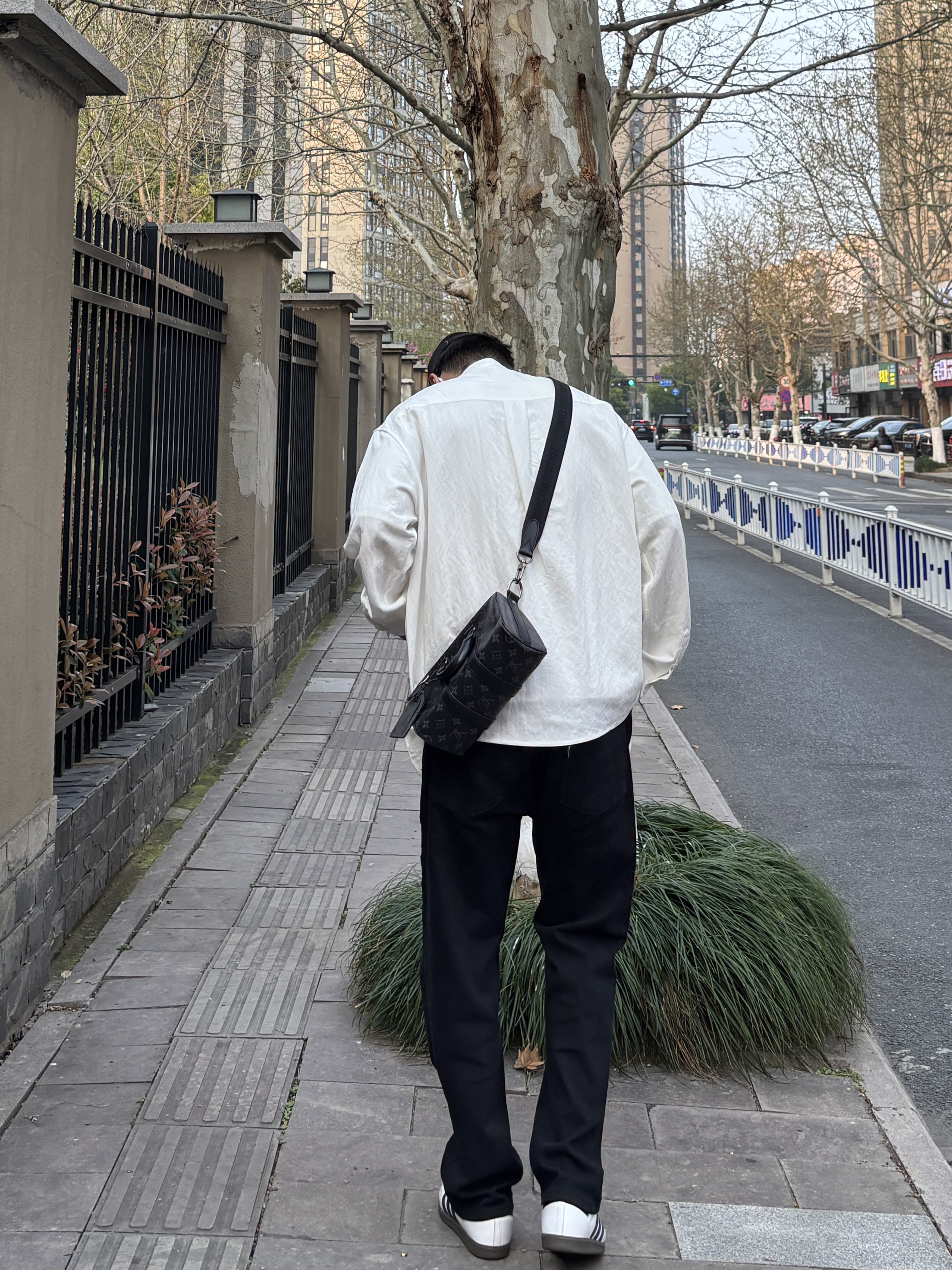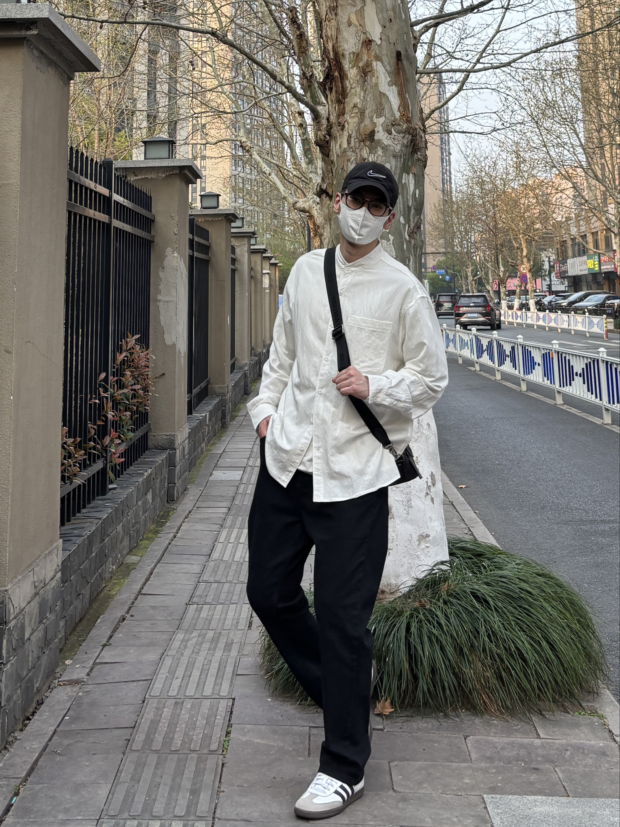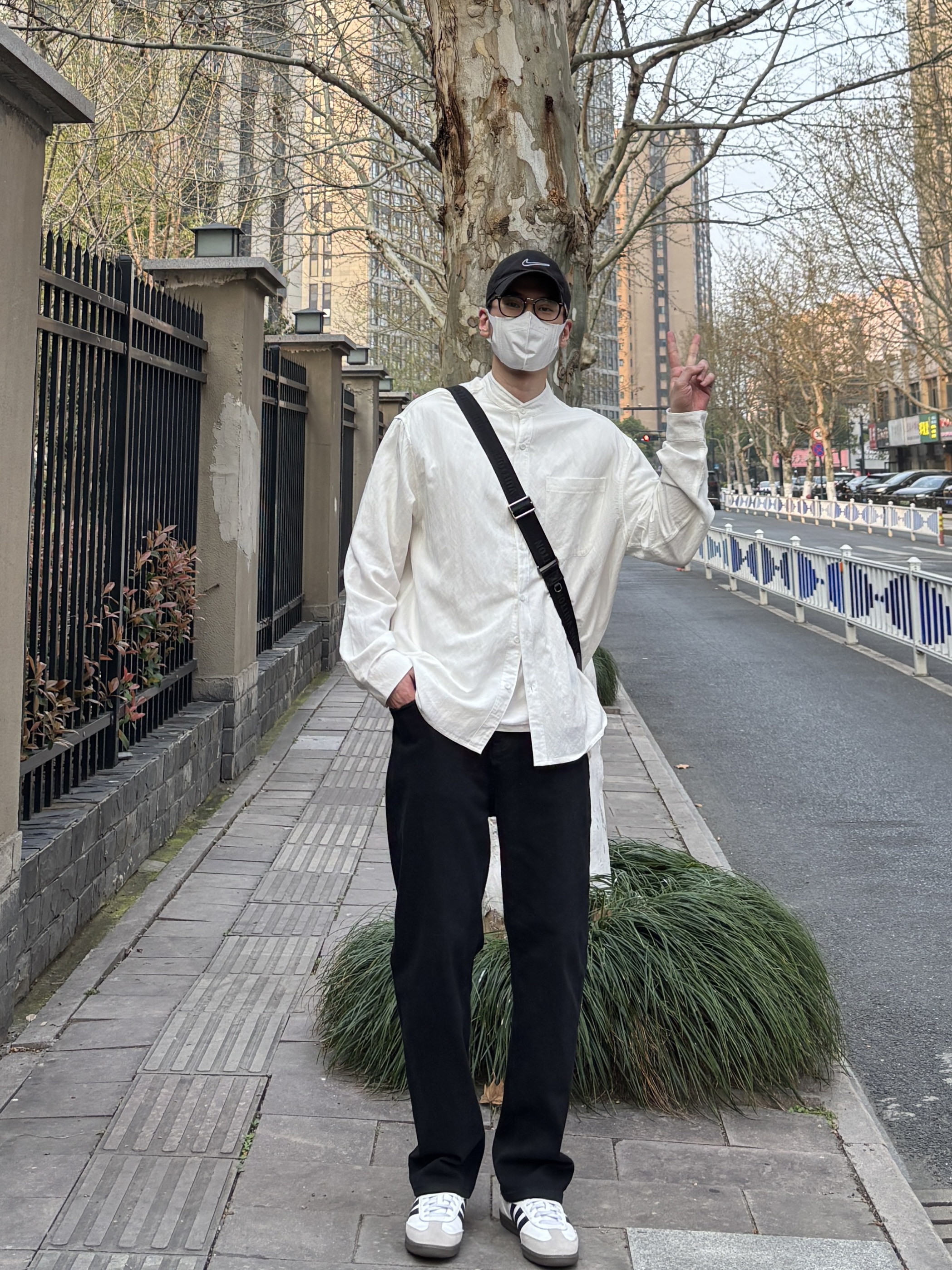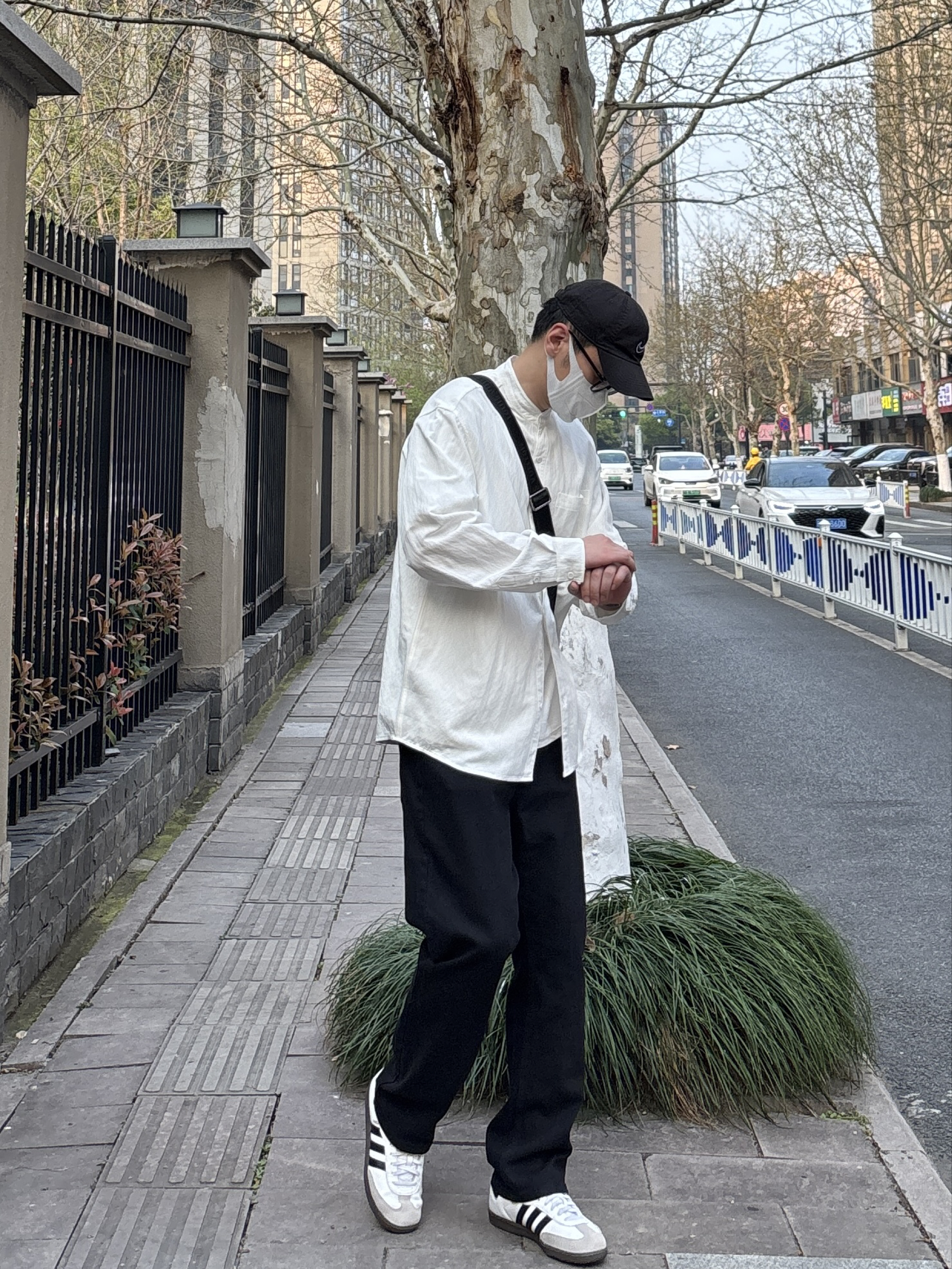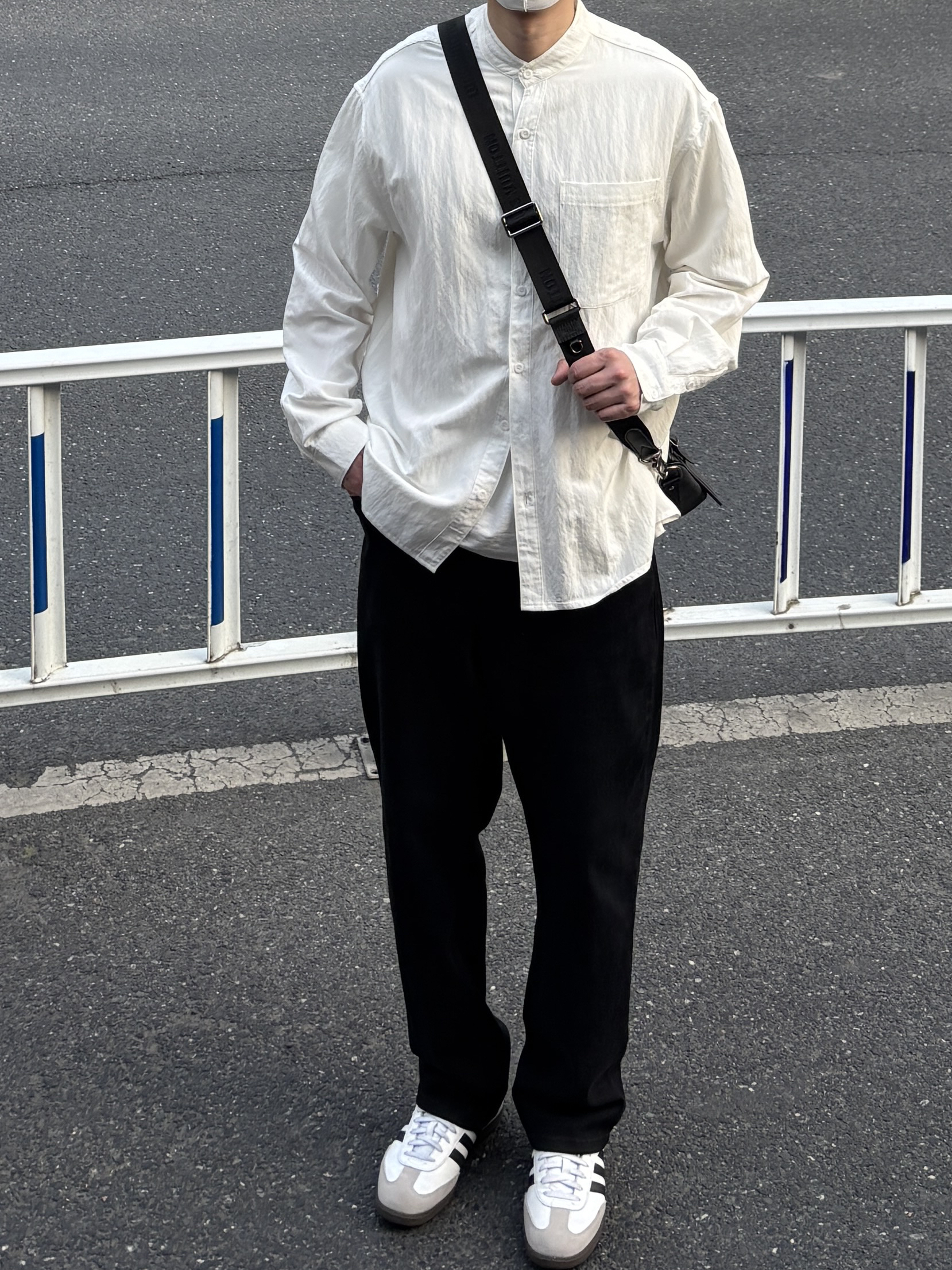 想要穿搭简约又高级,黑白配色永远是稳妥的选择✌️ 上身白色廓形休闲长袖衬衫,宽松版型弱化身材束缚,立领增添几分利落感,不管是单穿还是内搭都很合适~ 下身搭配黑色直筒牛仔裤,经典黑色百搭显瘦,水洗工艺让裤子更有质感👍 脚上搭配一双黑白复古低帮德训鞋 最后配上精致的皮质斜挎包,细节拉满 一套造型简约不简单,日常出街真的清爽又吸睛,少年感十足🙋♂️ - 今日穿搭 衣服裤子:NICE LILI 鞋子:a...
