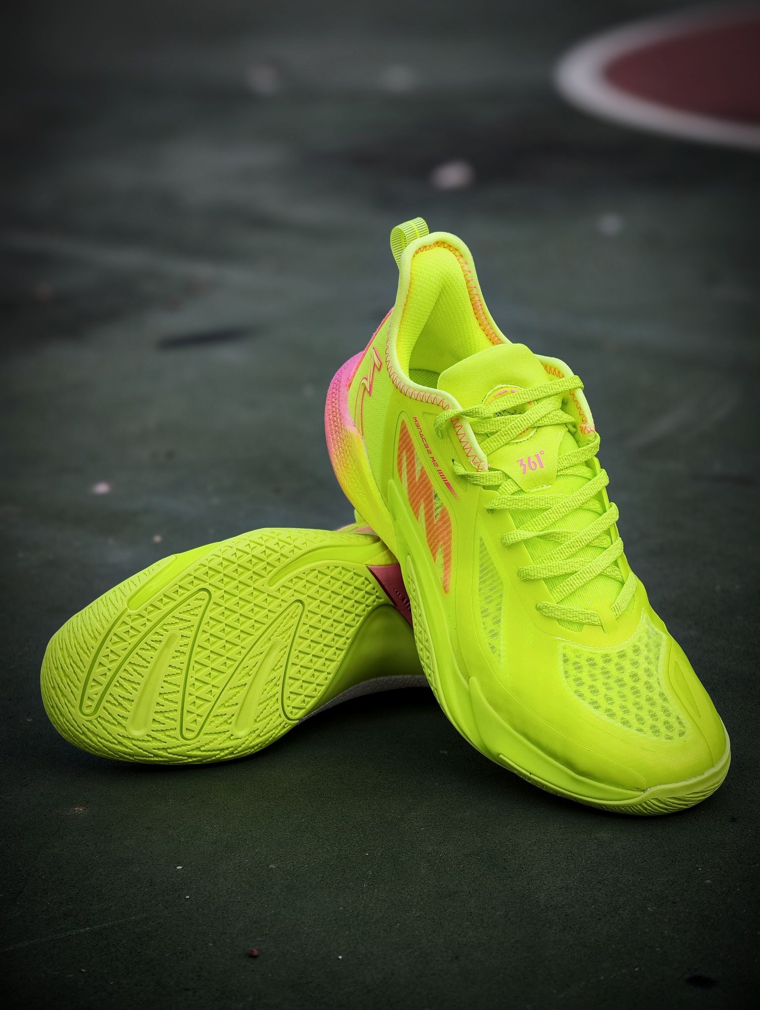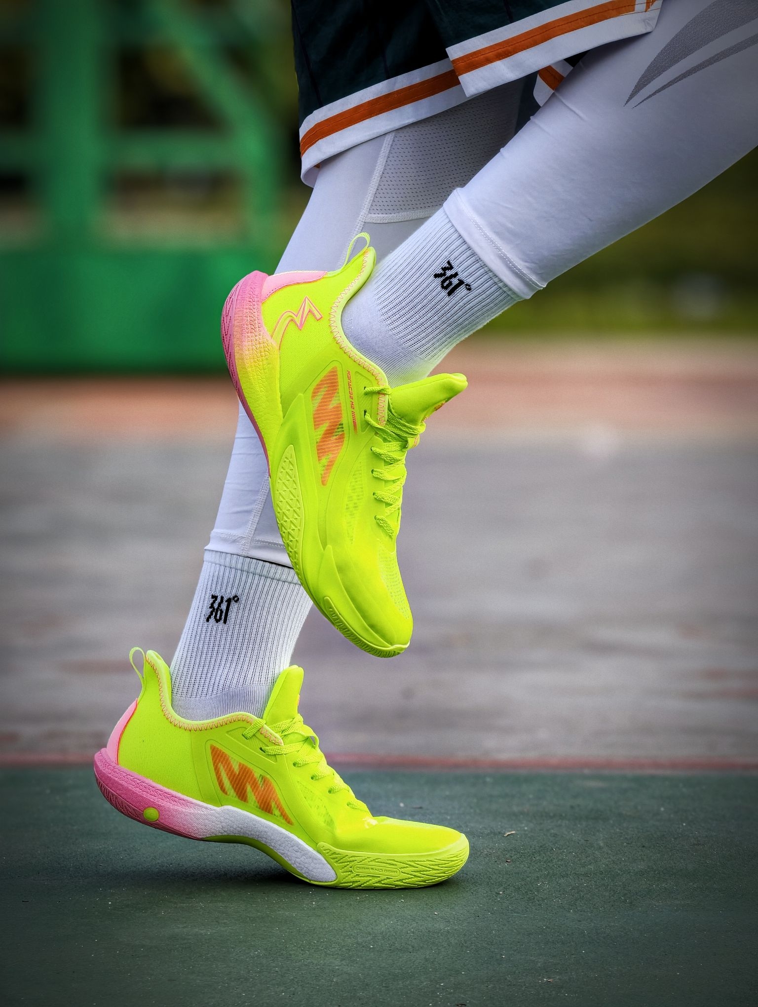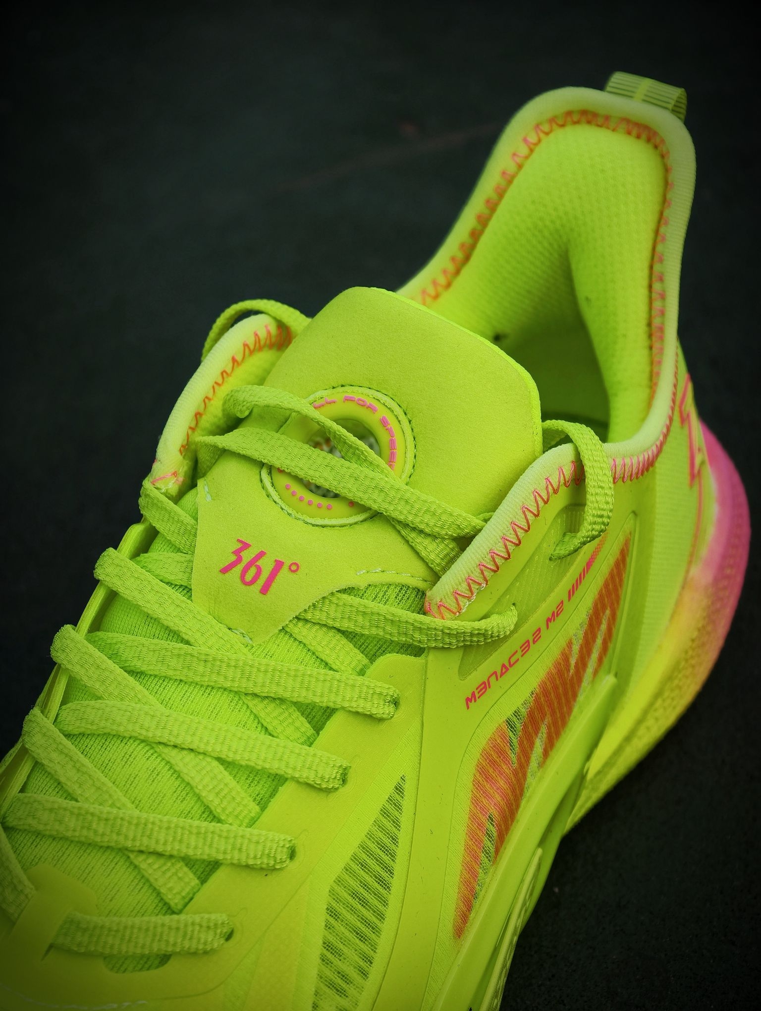 #361° 狂飙2实战篮球鞋,荧光配色超吸睛 荧光黄+粉色渐变设计,绝对是场上焦点 鞋面工程网布,透气又轻盈,脚感很舒适 中底搭载361度科技,缓震支撑力满分 外底多向纹路抓地力强,室内外都能轻松驾驭 整体轻量化,灵活度高,是一款后卫鞋 适合追求速度和敏捷的篮球爱好者