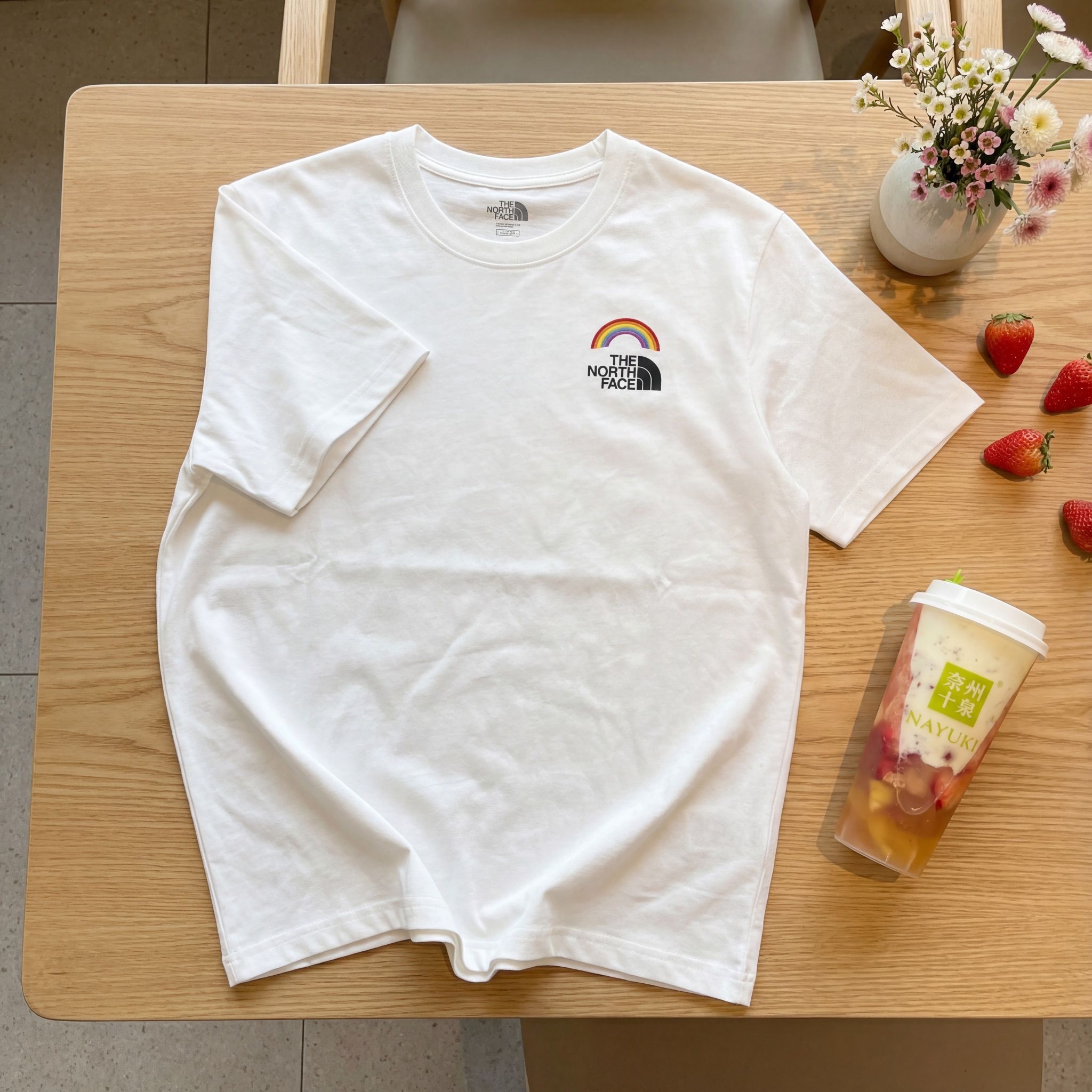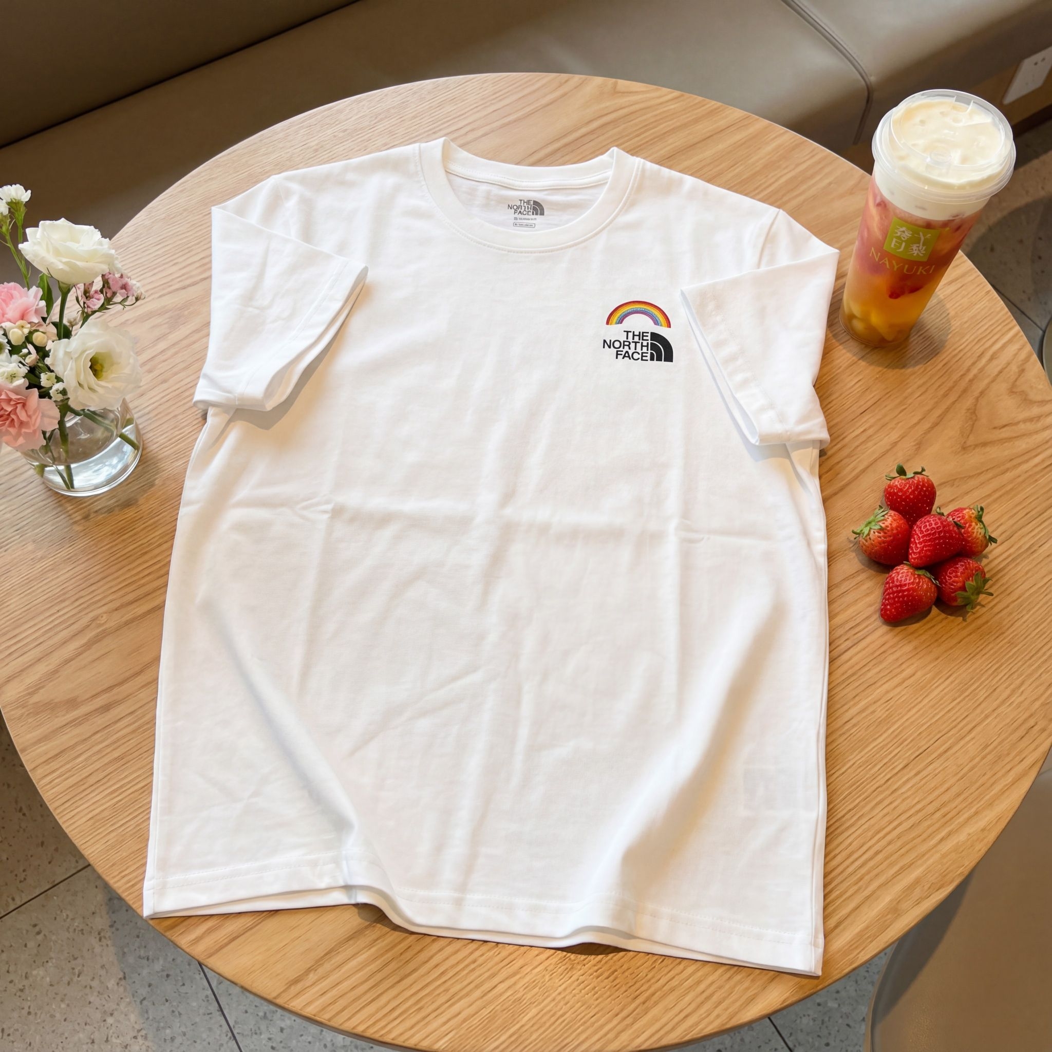 这件北面的白T真的是衣柜里的刚需款!面料软软糯糯的,贴身穿完全不闷汗,夏天穿特别透气舒服。 小彩虹logo设计得很可爱,不会太花哨,日常穿、出门玩都合适,不管是搭牛仔裤、运动裤还是短裤都好看,随便一套就很清爽。 版型也很正,不紧绷不臃肿,男女都能穿,情侣款也超合适。洗了好几次也没变形、没发黄,质量在线,性价比很高,夏天闭眼入的基础款,日常穿真的太省心了!