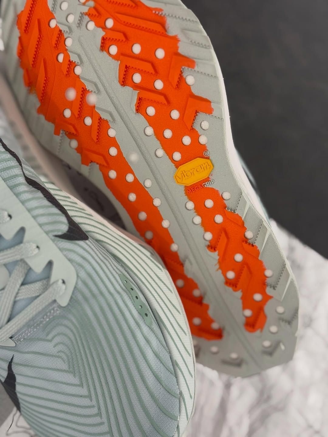 采用了 Vibram 的 Litebase 技术,相比传统大底减轻了 30% 的重量,但依然保留了 Megagrip 级别的湿地止滑性能。3mm 的齿深设计,平衡了抓地力和重量。