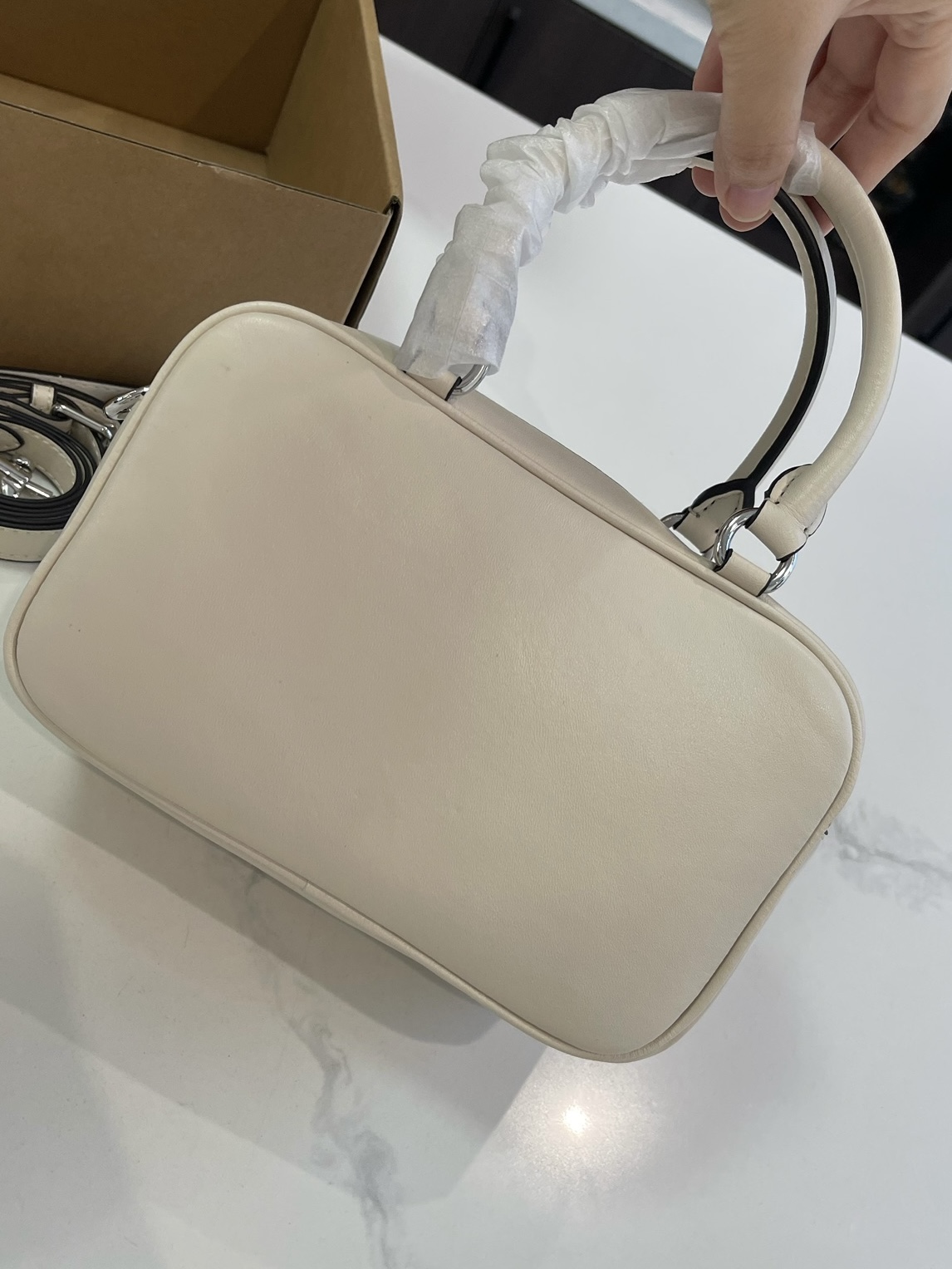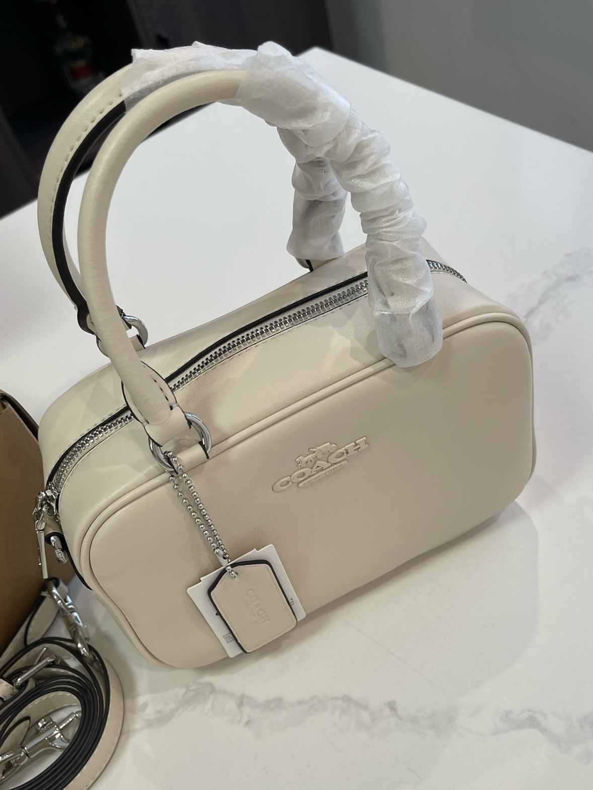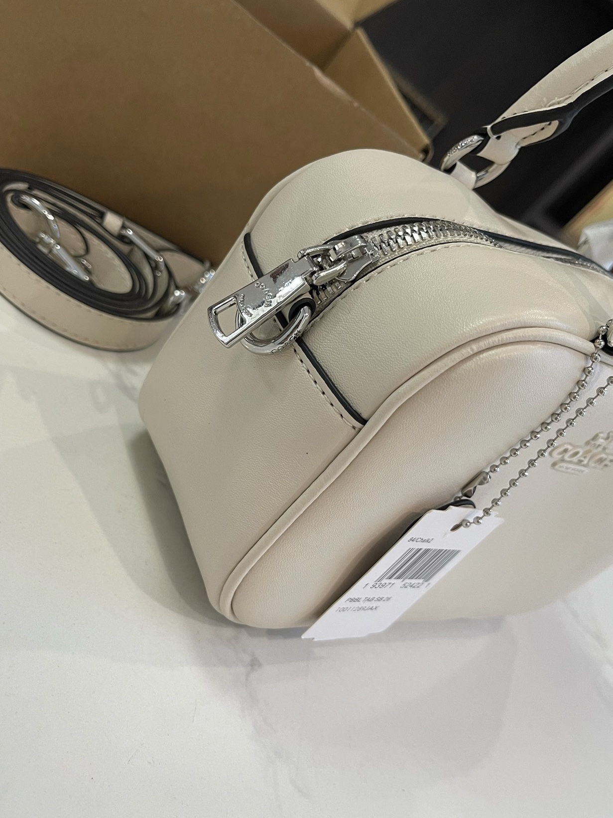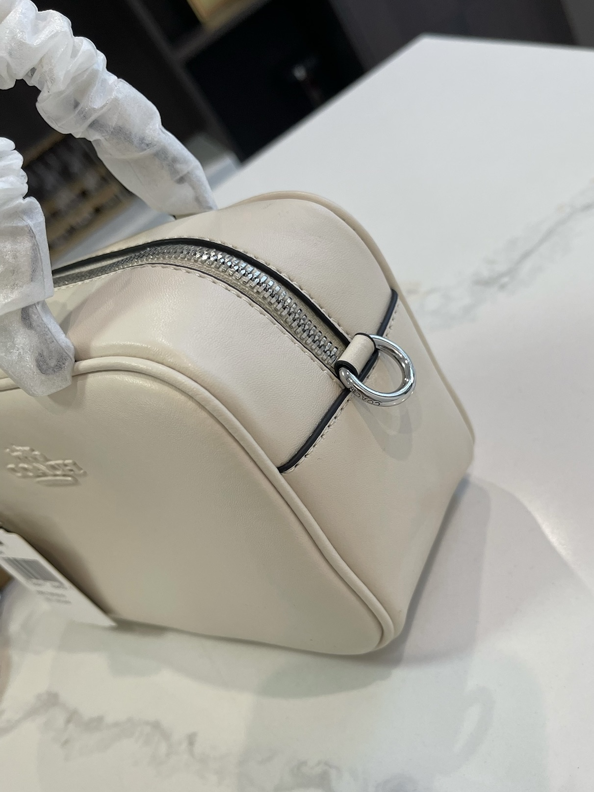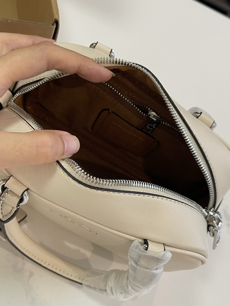 夏天的第一只白月光包包,被这只COACH拿捏了! 奶白色的光面皮革质感超棒,银标+双拉链设计,简约又高级,完全不挑穿搭。 自带两种背法: ✅手提:软fufu的,像个小饭盒,可爱又精致 ✅斜挎:换上肩带,秒变休闲通勤风,解放双手超方便 容量也完全在线,手机、粉饼、钥匙、口红都能塞下,日常出门足够用。 搭配白T恤、连衣裙、牛仔裤都巨适配,温柔又减龄,夏天背真的太清爽了!”