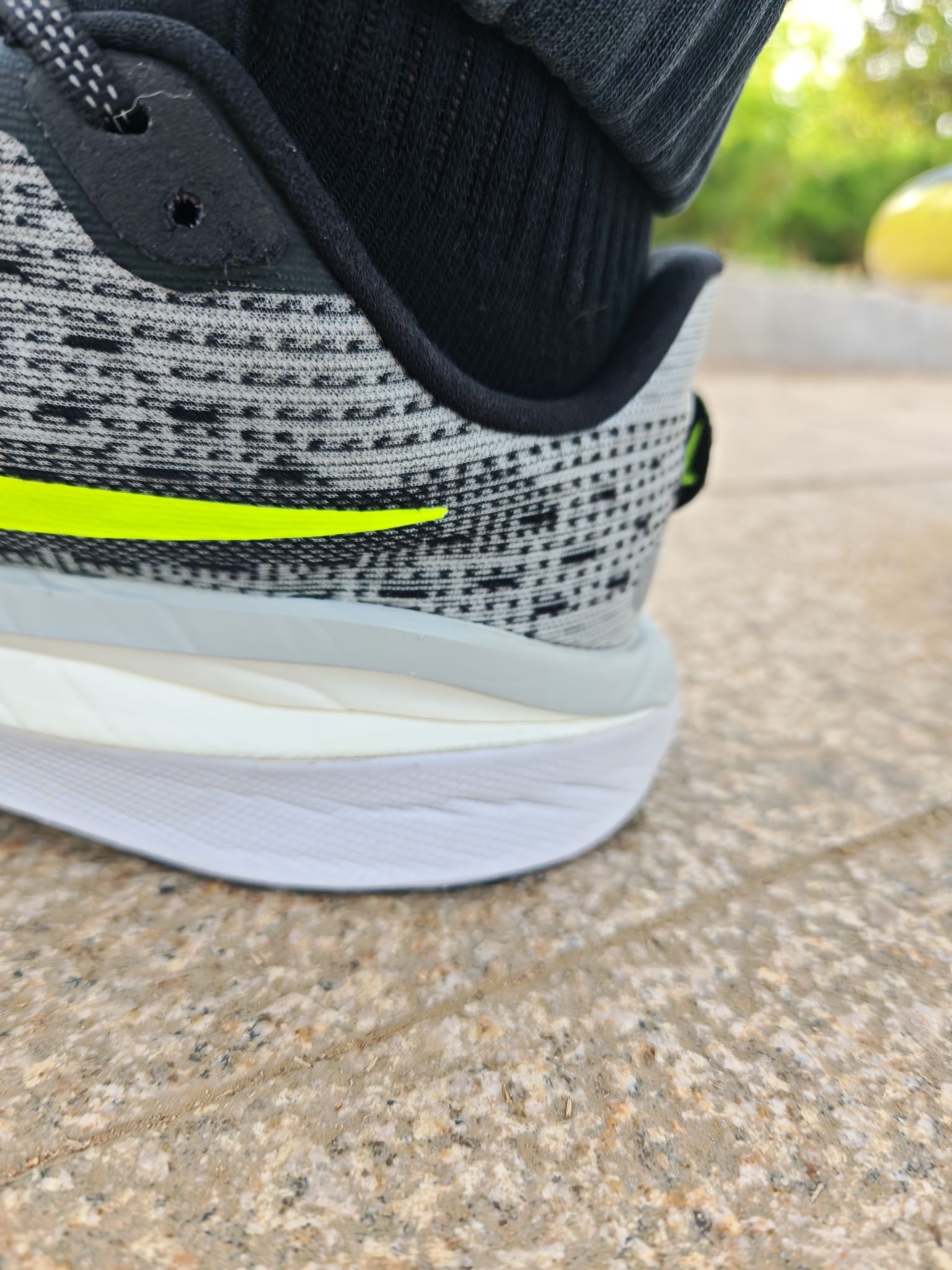 首先,这一代的颜值绝对非常好看,尤其是我的这个配色荧光绿的,这个点缀充满了速度感,运动感。 整个中底是两种材料加在一起,上半部分zoomx泡棉,轻盈软弹,下半部分用了应该是Eva,但是调校的软度正合适,提供了稳定性,弥补了zoomx过于软的缺陷,绝对的经典好穿的慢跑鞋。