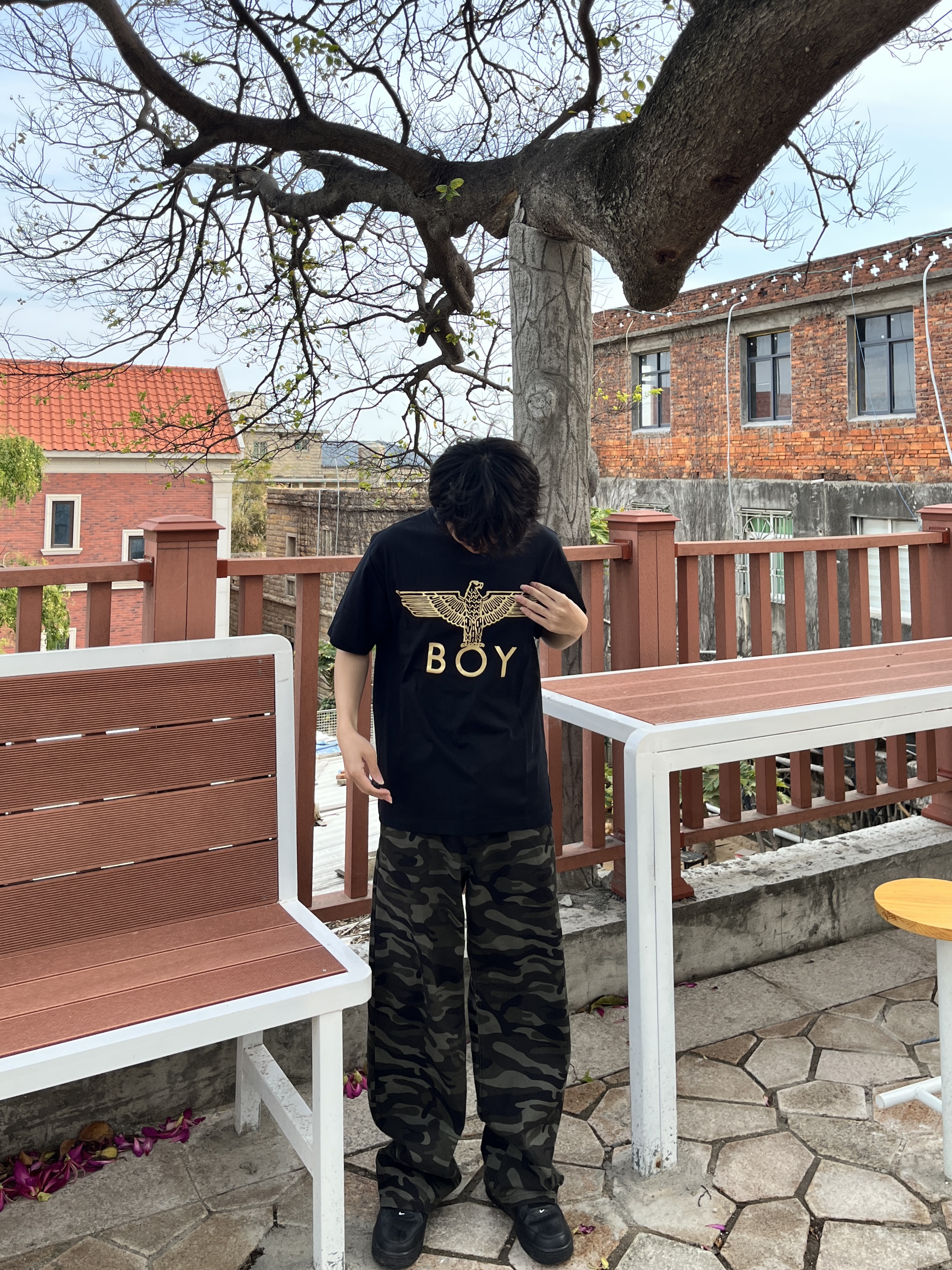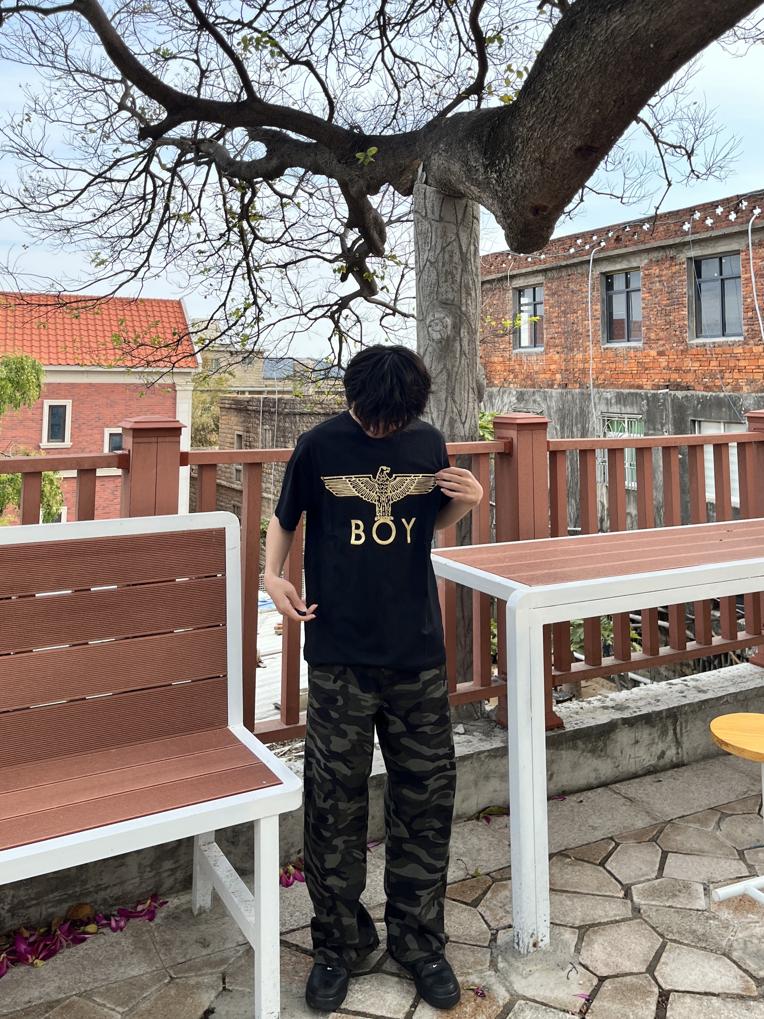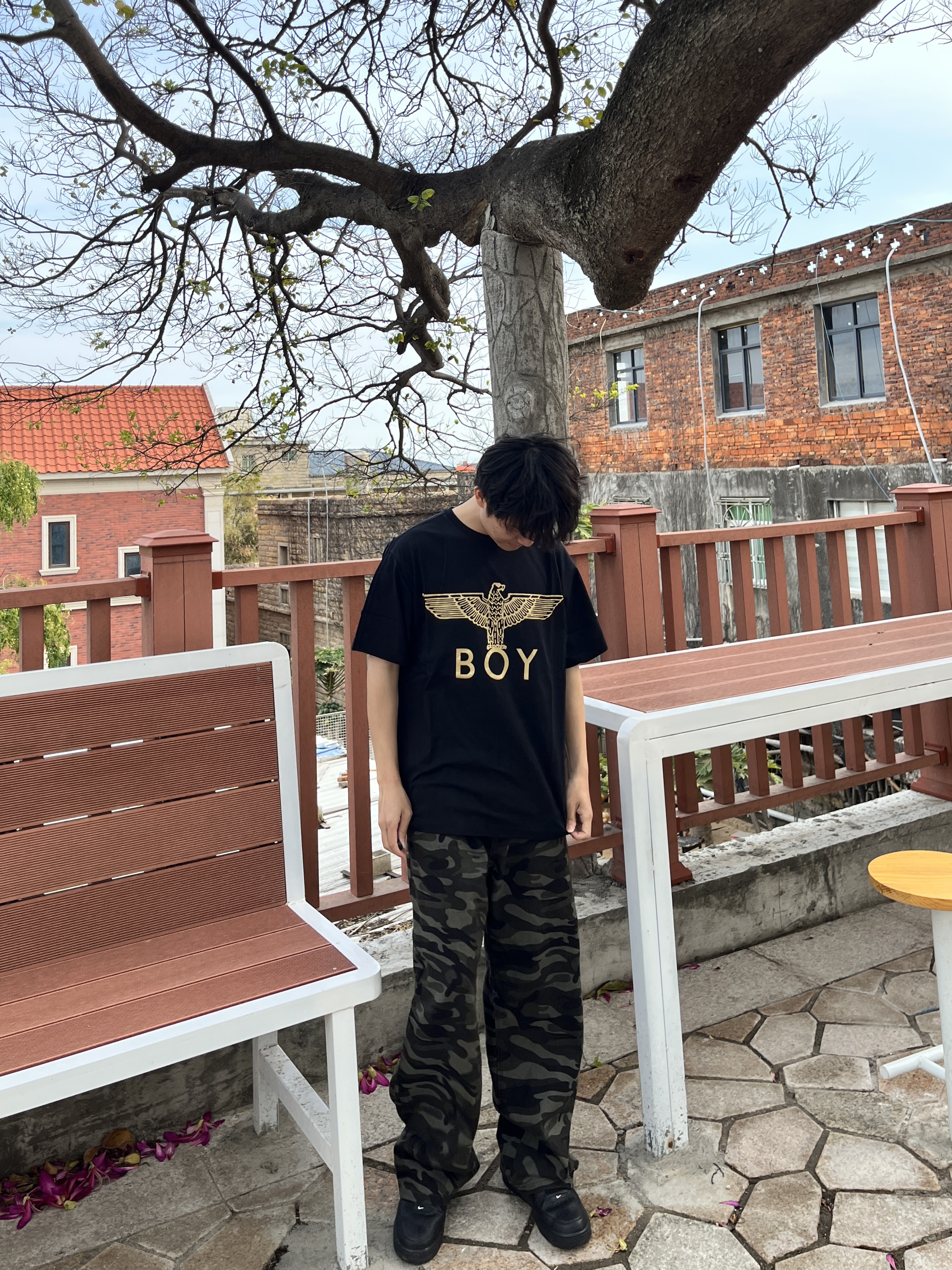 快要夏天了 大家买新短袖了吗 黑金配色boy london 短袖 印花是烫金的 面料细腻柔软贴身不扎 裤子是迷彩裤有酷酷的感觉