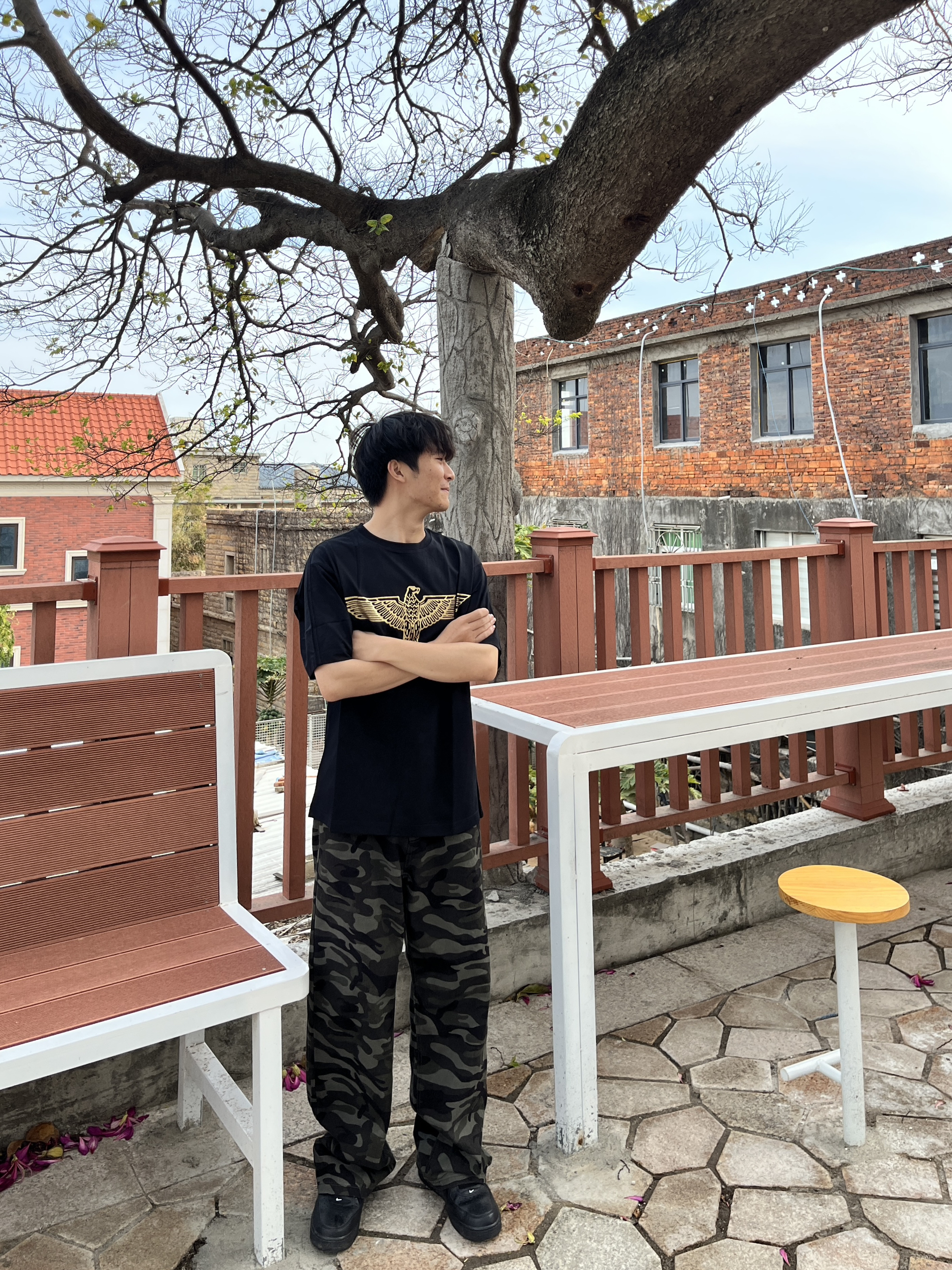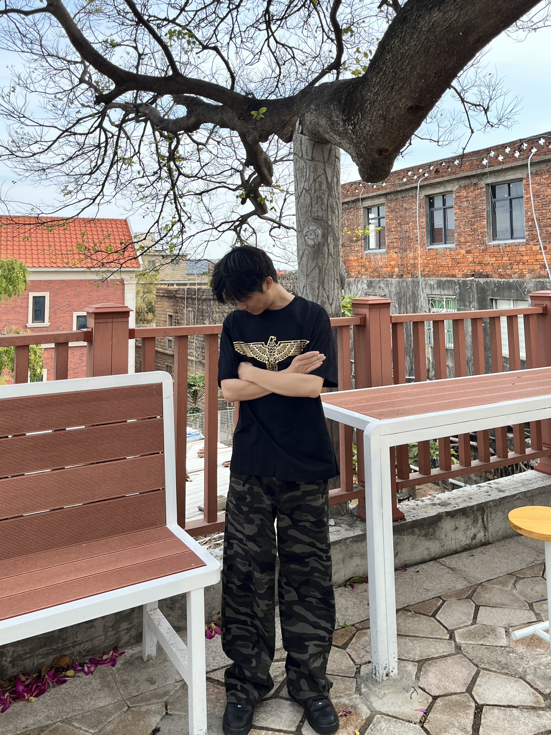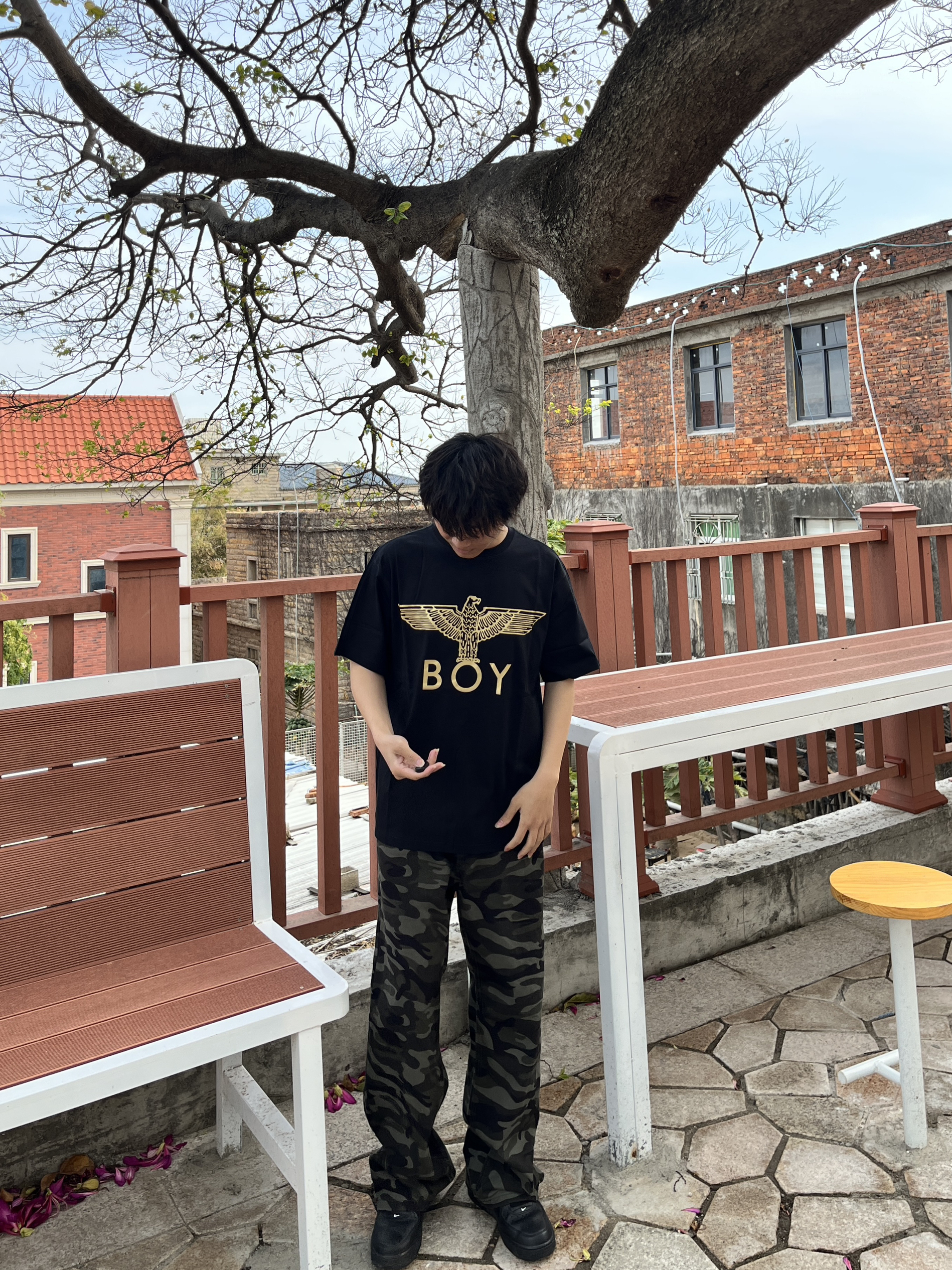 快要夏天了 大家买新短袖了吗 黑金配色boy london 短袖 印花是烫金的 面料细腻柔软贴身不扎 裤子是迷彩裤有酷酷的感觉