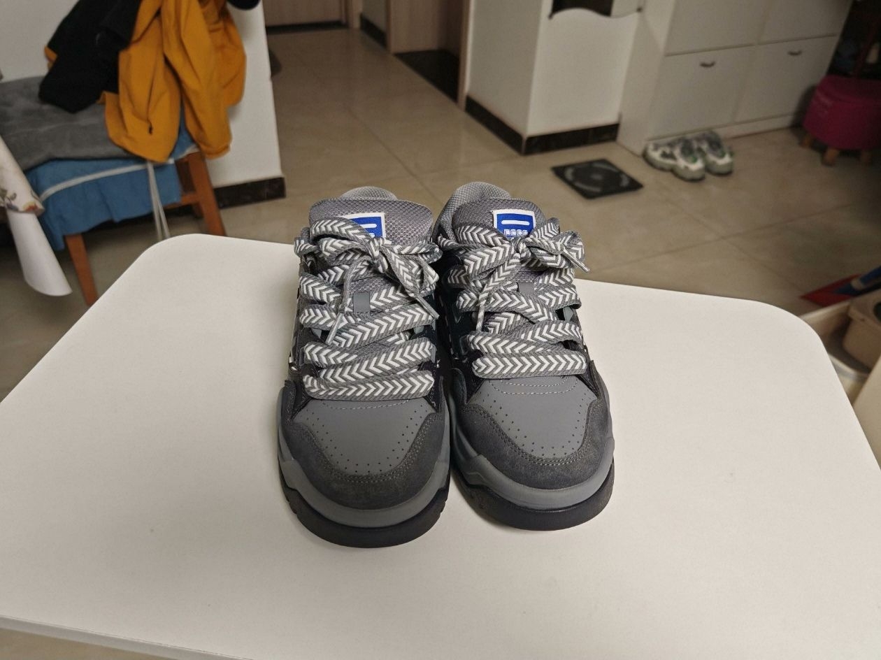 流厚底板鞋,2026新款,低帮设计,时尚运动风,冷灰色,经典厚底设计,男女同款,日常休闲或运动都OK!鞋面是合成革+织物拼接,透气又有支撑力,厚底缓震,长时间穿也不累✨。灰色主色+蓝色细节,简约百搭,鞋带是编织款,细节感满满。