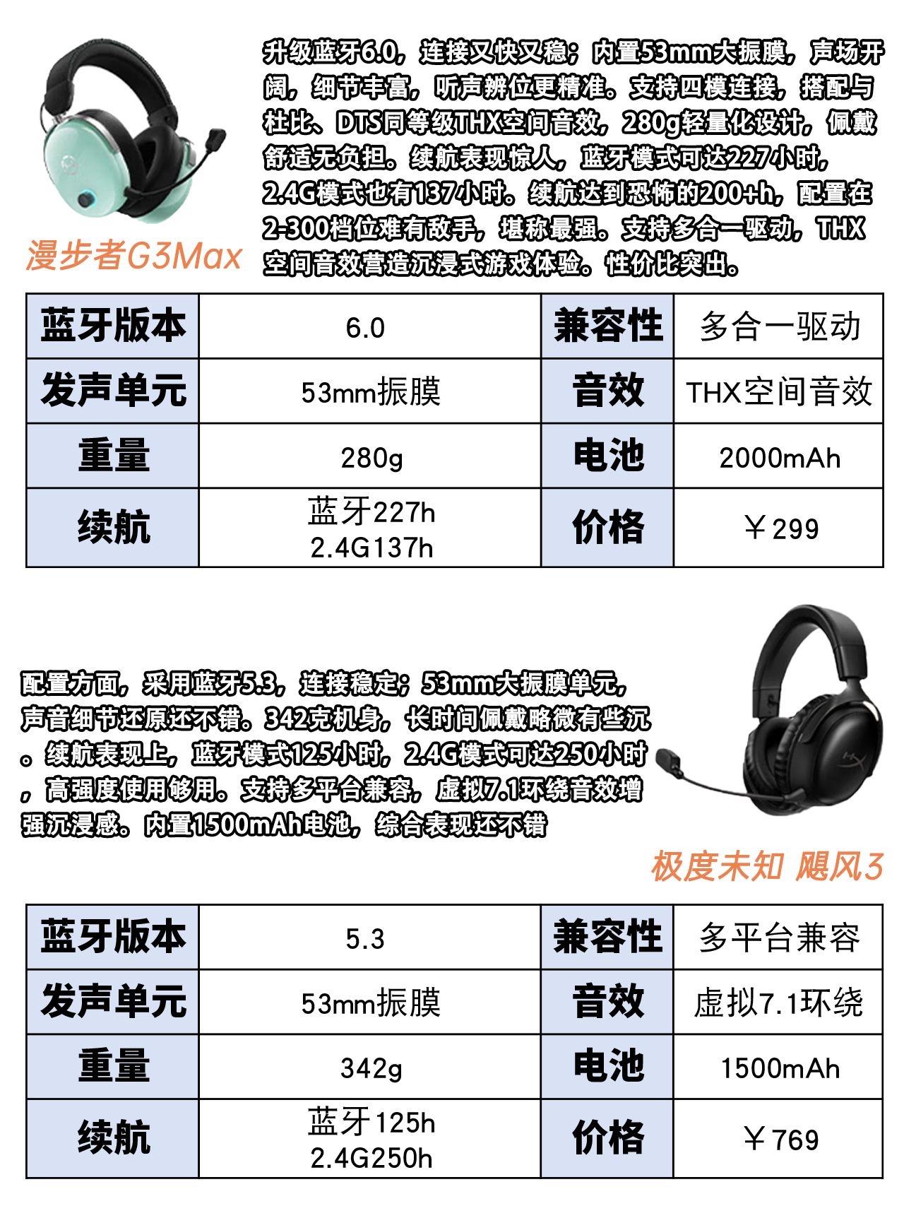 最近是不是想拉上室友开黑,但又总觉得听不清脚步、枪声一响就懵?很多宝子可能没意识到,耳机选对了,真的能提升游戏体验。今天UP主就盘几款适合战术游戏的耳机,看看哪款更适合你。漫步者G3Max设计灵感来自战地装备,与游戏人物同造型,代入感满满。内置2000mAh大电池,蓝牙模式能用227小时,2.4G模式也有137小时,支持边充边玩。支持四模连接。很多国际大牌同价位也就一百小时不到,作为299的耳机,...