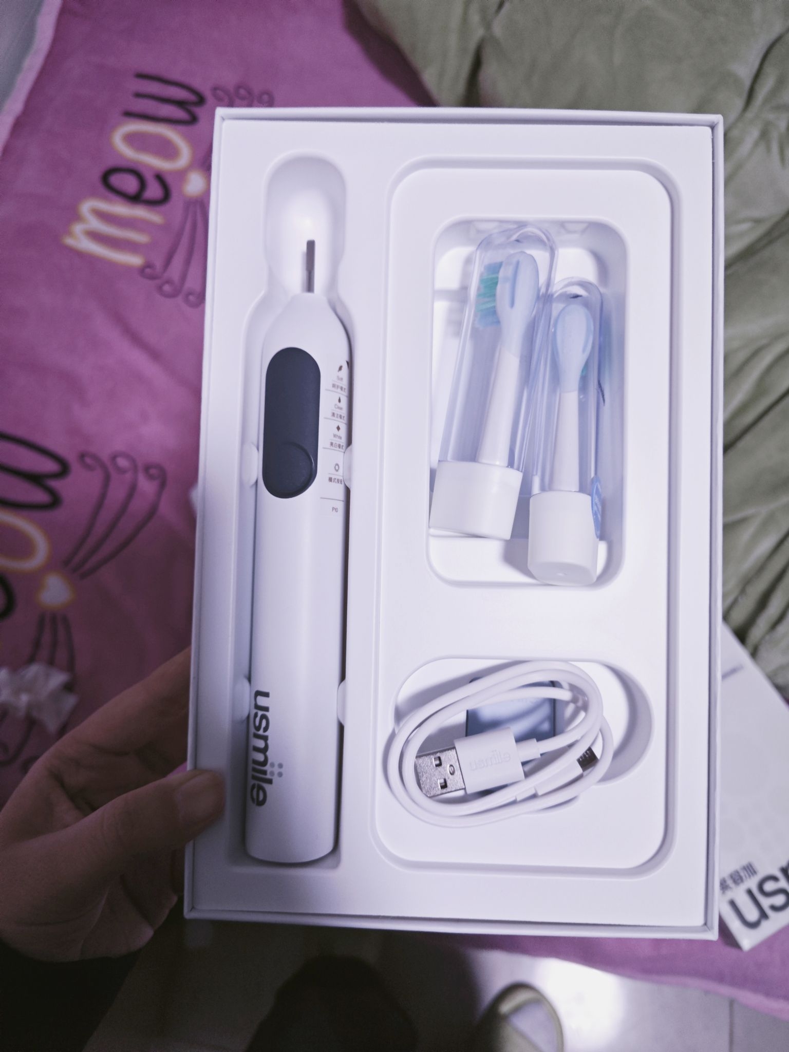 看了好几天,最后选择了usmile P10这款电动牙刷(对学生党来说挺好的,基础款性价比挺高的!) 三个功能:呵护模式、清洁模式、亮白模式
