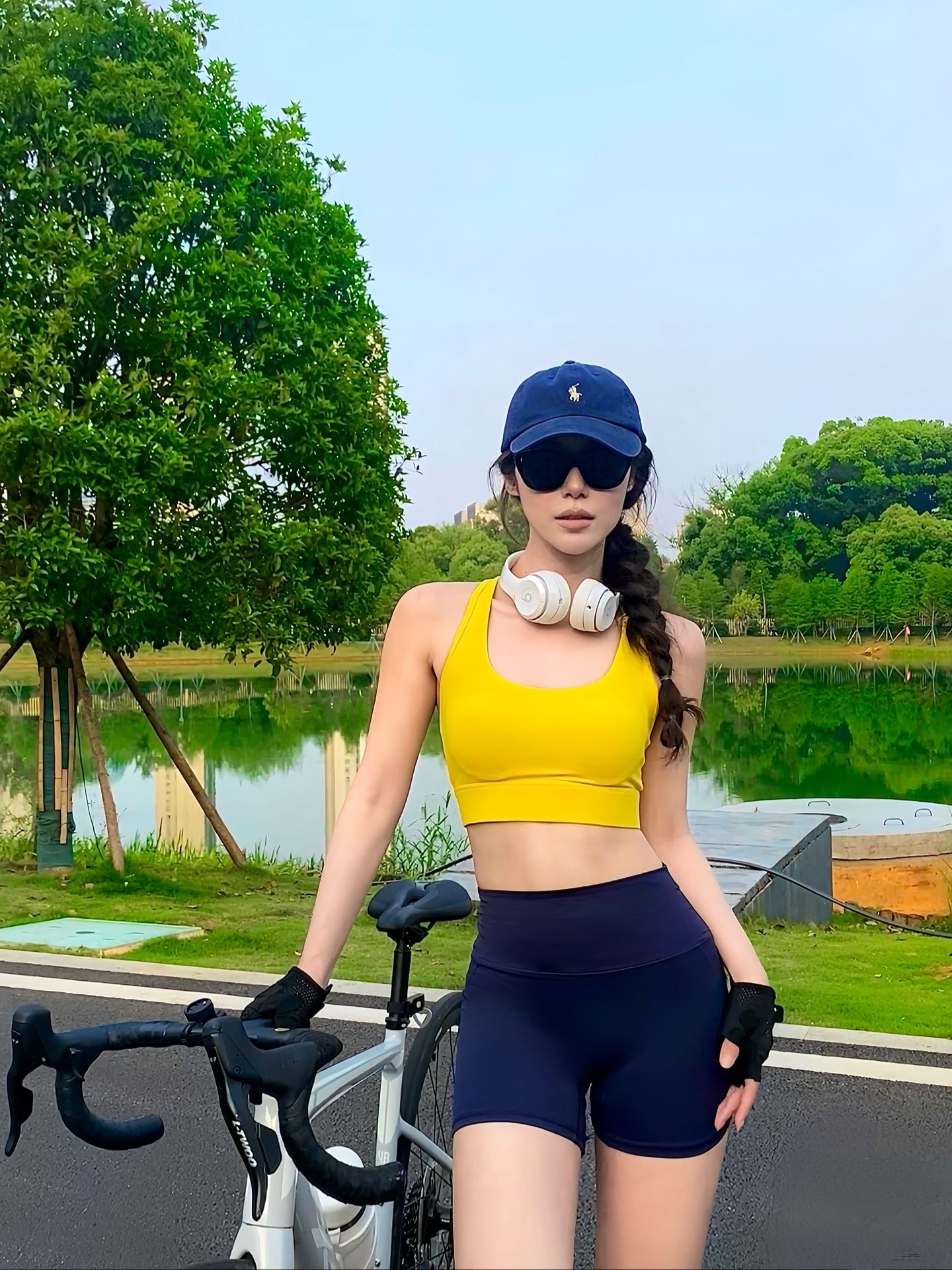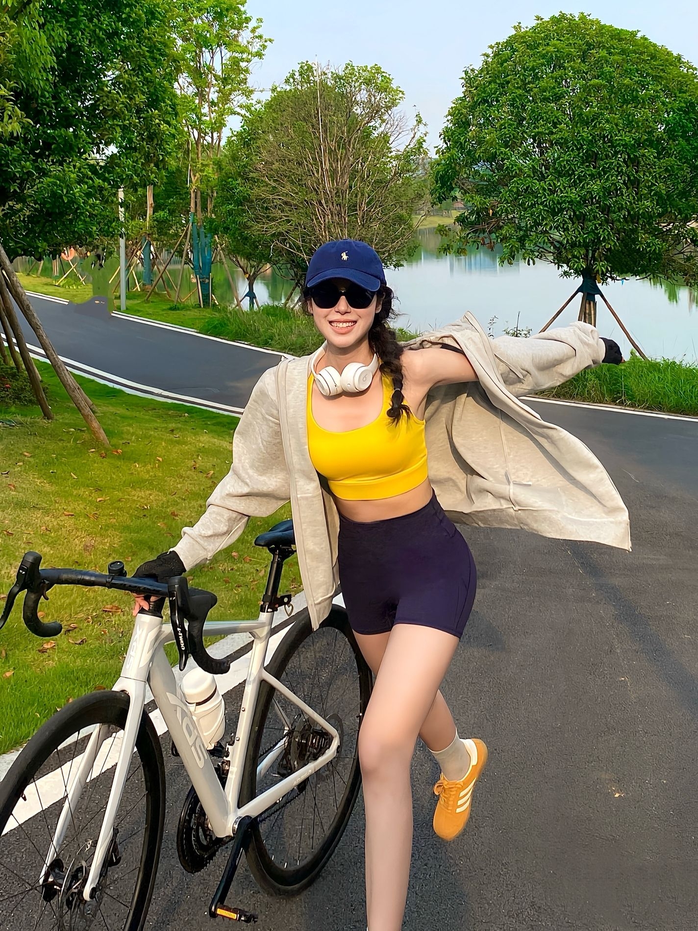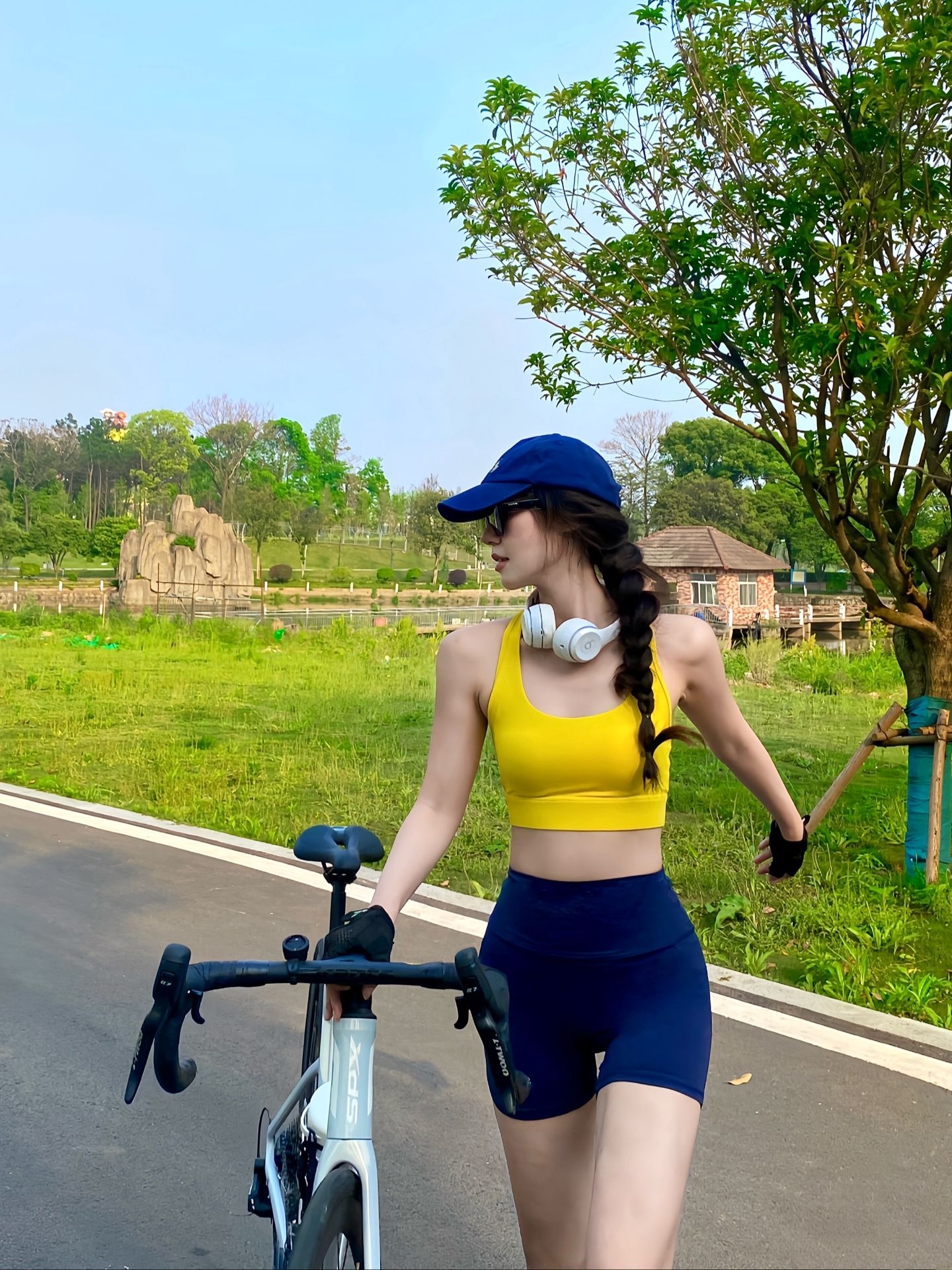 上身这件亮黄色运动内衣,面料贴身又透气,承托力在线,骑行的时候完全没有束缚感,短款设计刚好露出腰线,活力感拉满。外面叠穿的浅灰色休闲外套,版型宽松不拖沓,面料轻薄又防风,早晚微凉的时候穿刚刚好,敞开穿随性又自在,还能给整体造型增加层次感。